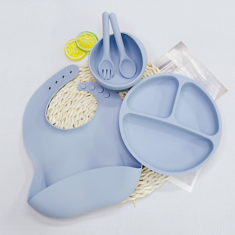 라이트 블루 - 원형 디너 접시 + 턱받이 + 실리콘 스푼 + 실리콘 포크 + 그릇