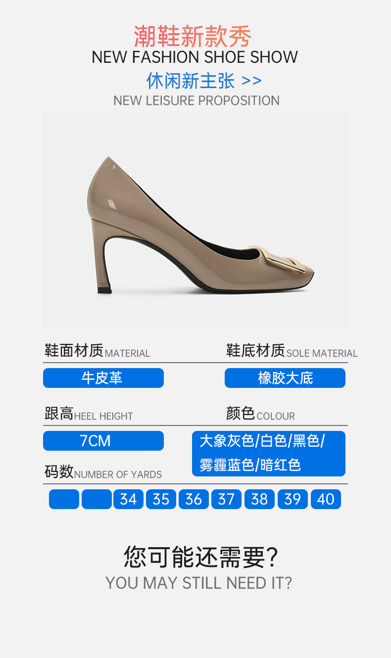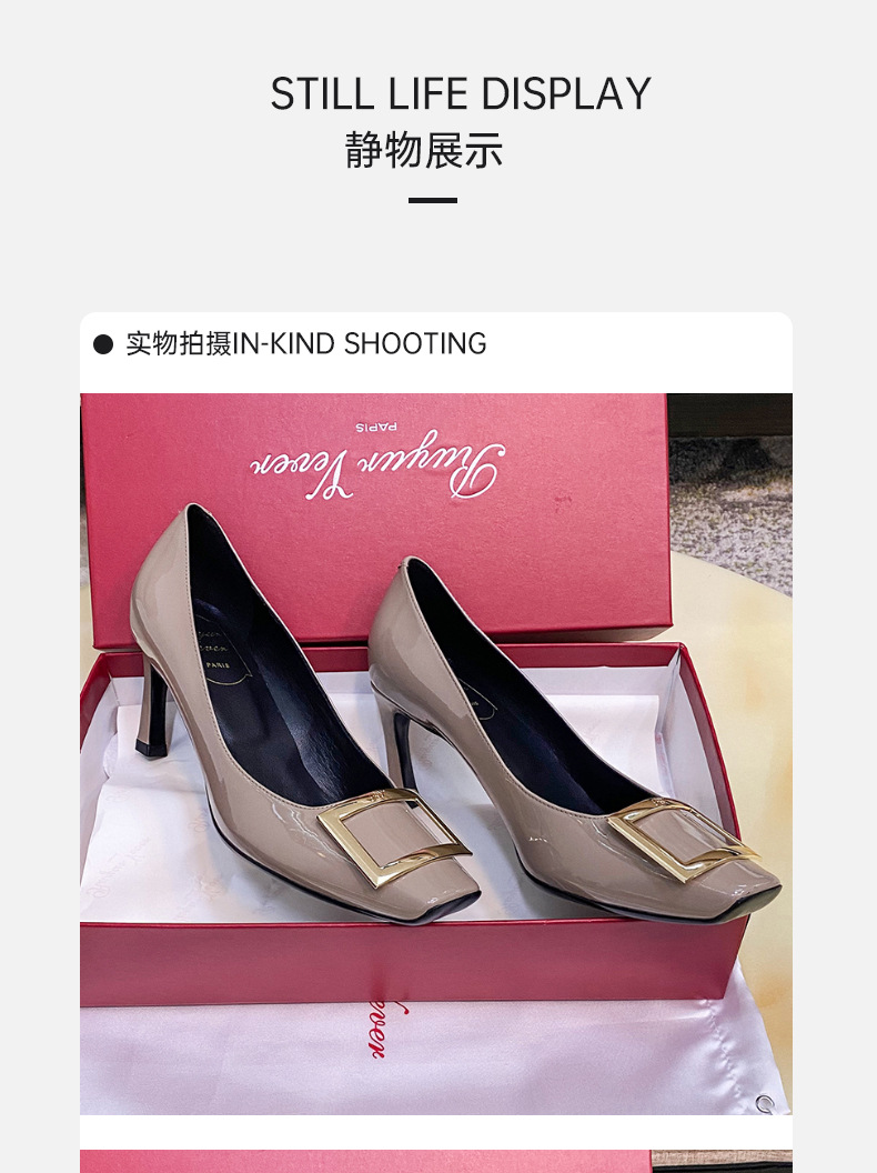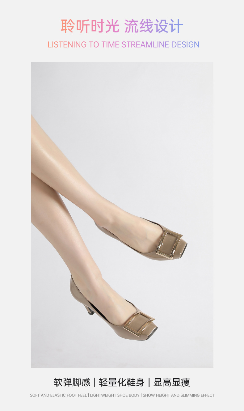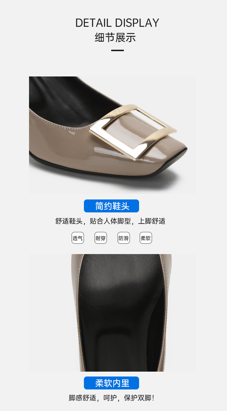 2026년 초봄 신상 rv 페이턴트 가죽 사각 버클 하이힐, 직장 출퇴근용 ol 얕은굽 소가죽 여성화, 원피스 드롭쉬핑