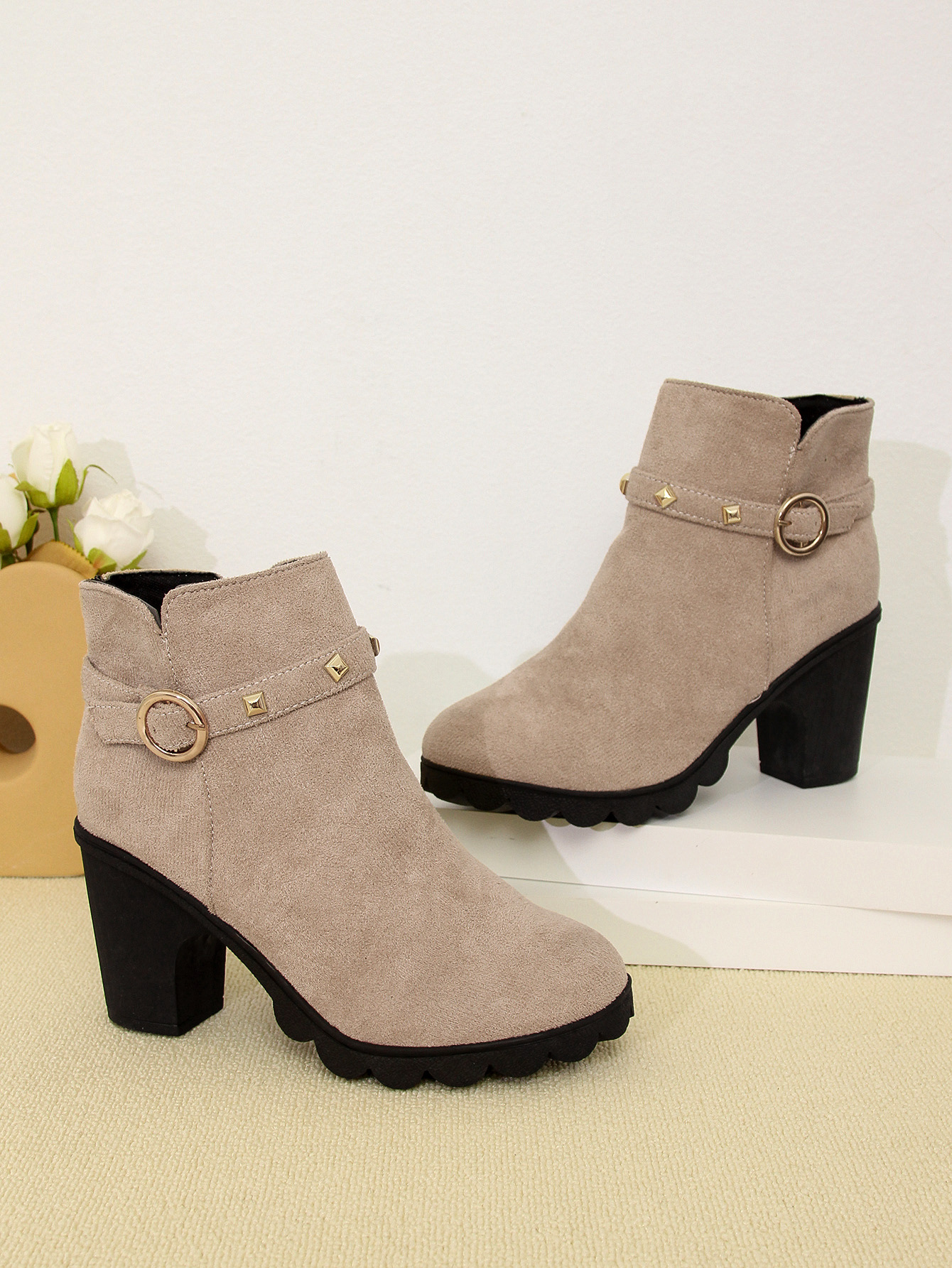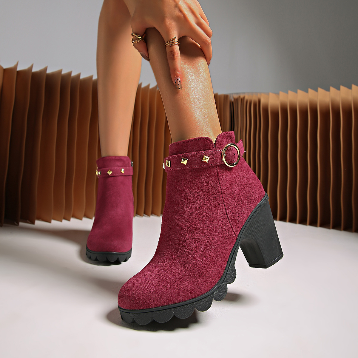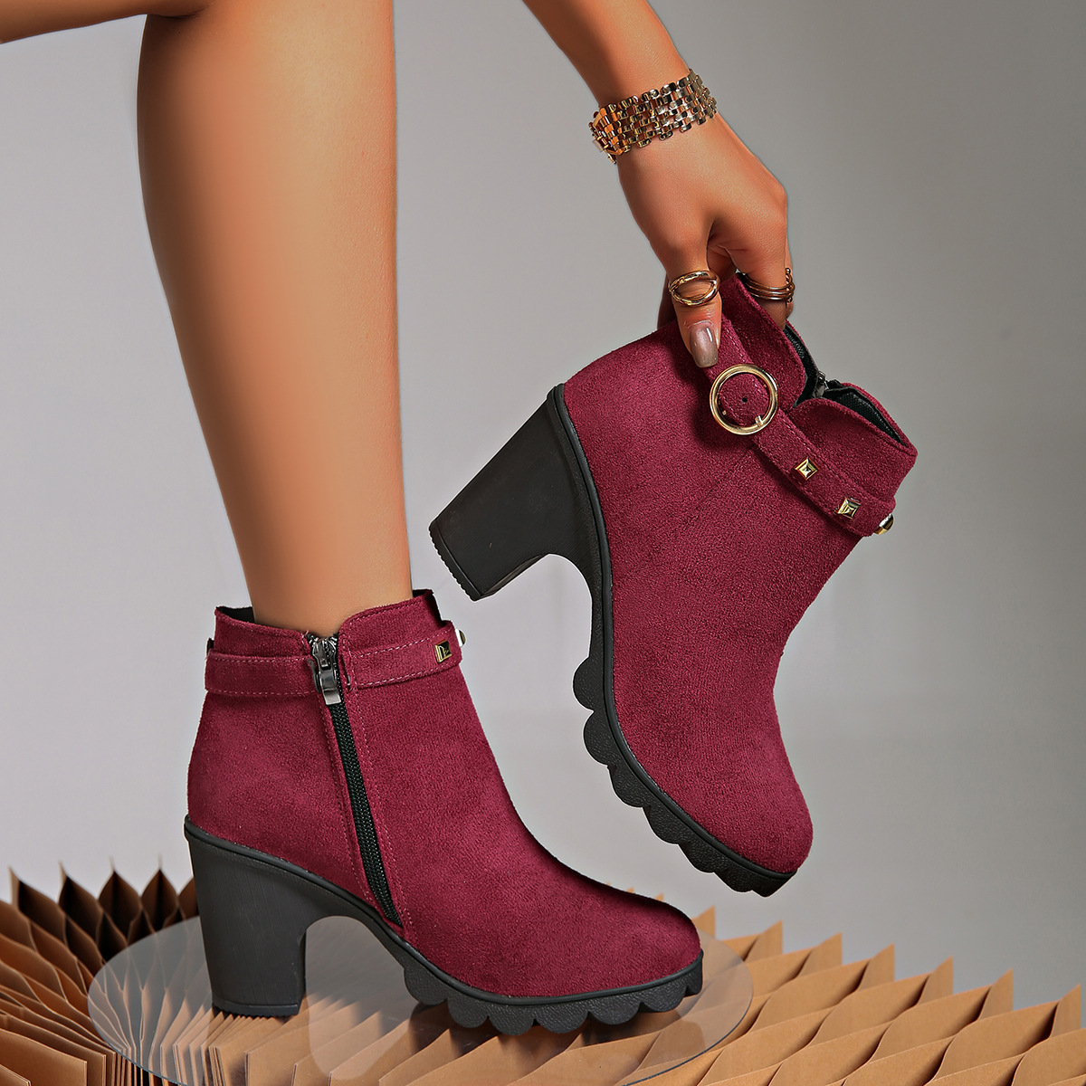 2024 가을과 겨울을위한 대외 무역 플러스 사이즈 하이힐 여성 부츠 새로운 패션 마틴 부츠 두꺼운 힐 라운드 헤드 사이드 지퍼 짧은 부츠