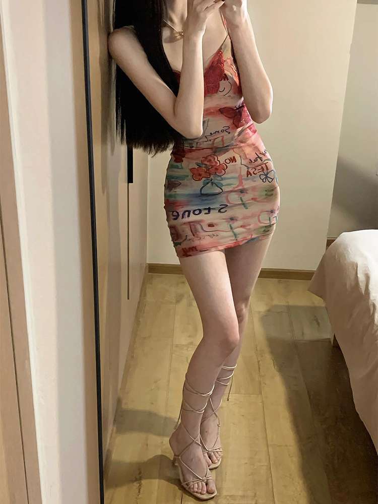 순수한 욕망 달콤한 뜨거운 여자 나비 낙서 인쇄 서스펜더 드레스 여성 여름 틈새 슬림 맞는 바디 보여주는 엉덩이 덮는 짧은 스커트