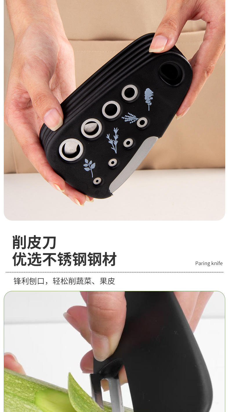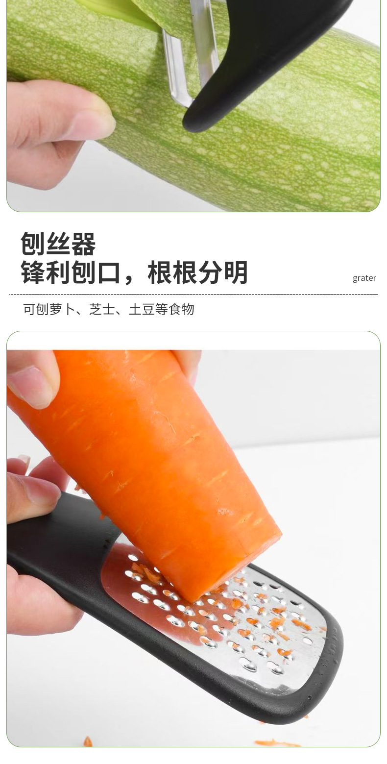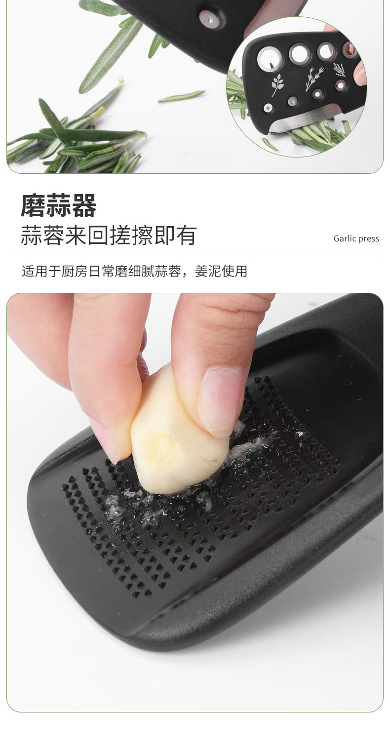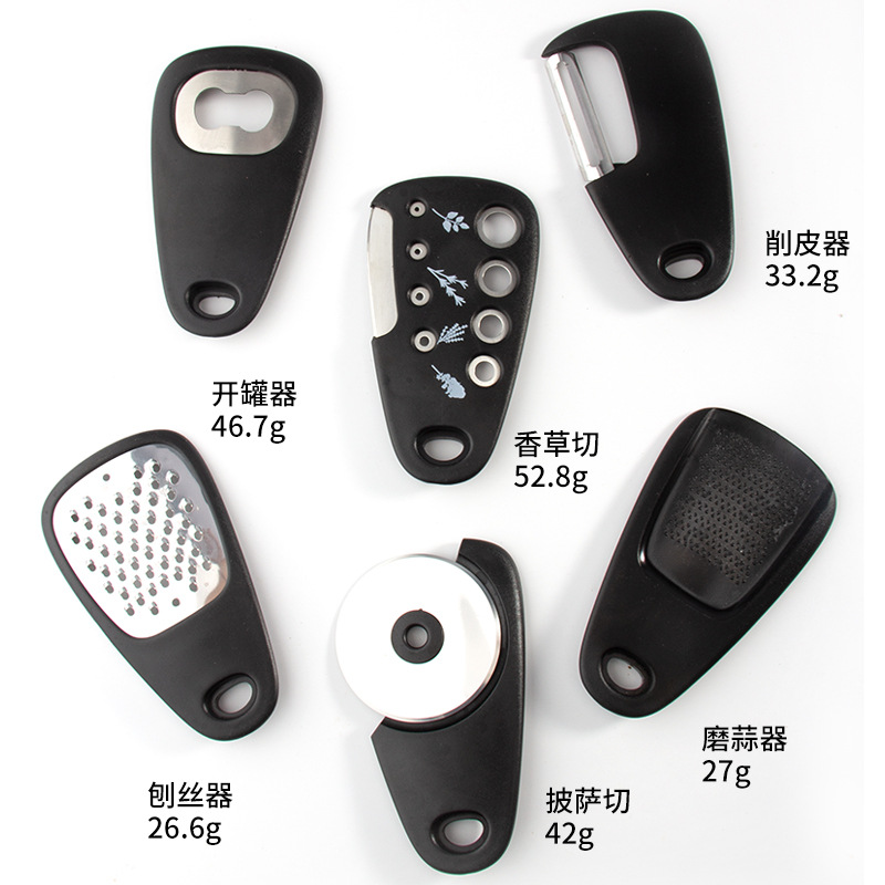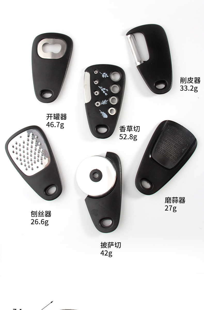 【品名】厨房小工具6件套(刨丝器、磨蒜器、削皮器、香草切、开瓶器、披萨刀);送清洁刷