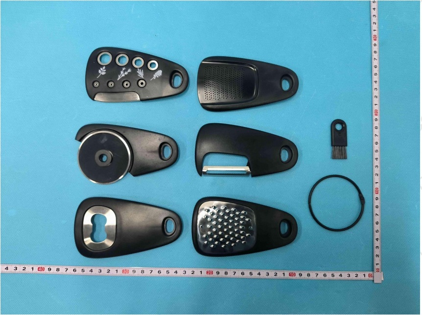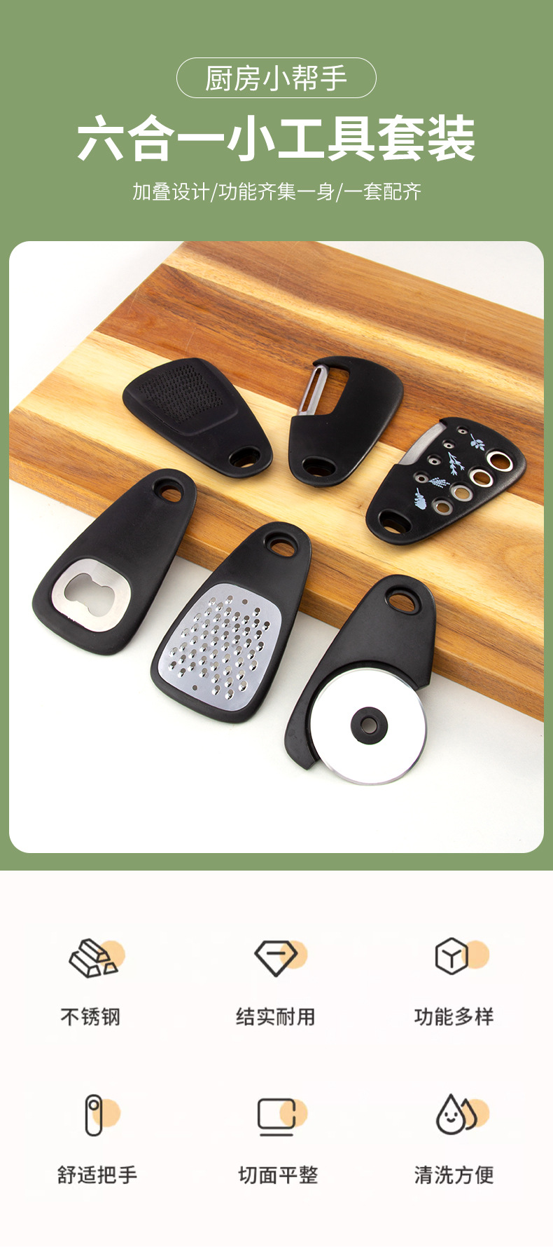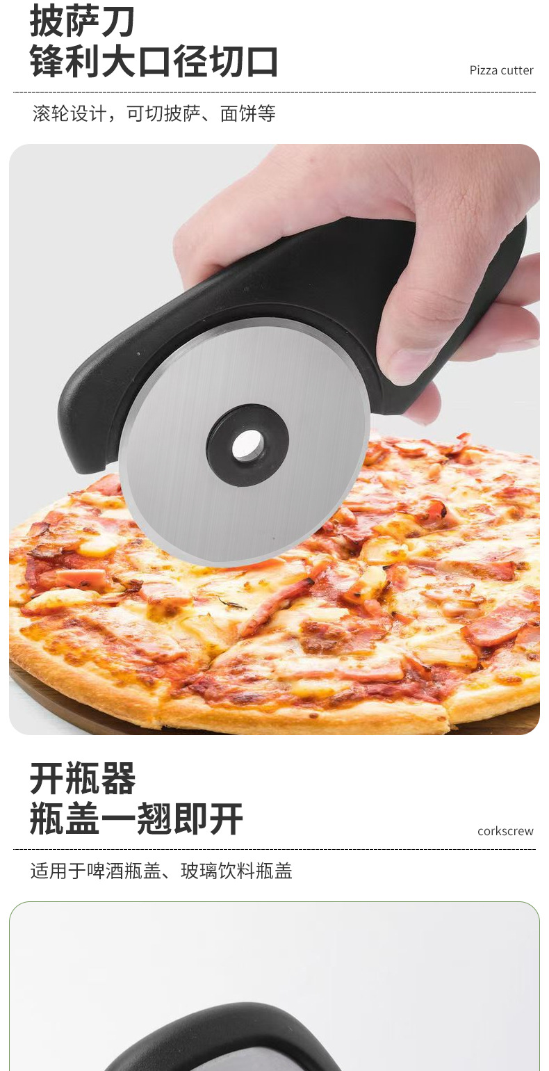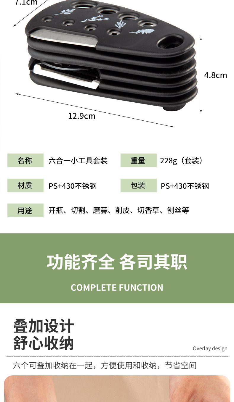 【品名】厨房小工具6件套(刨丝器、磨蒜器、削皮器、香草切、开瓶器、披萨刀);送清洁刷