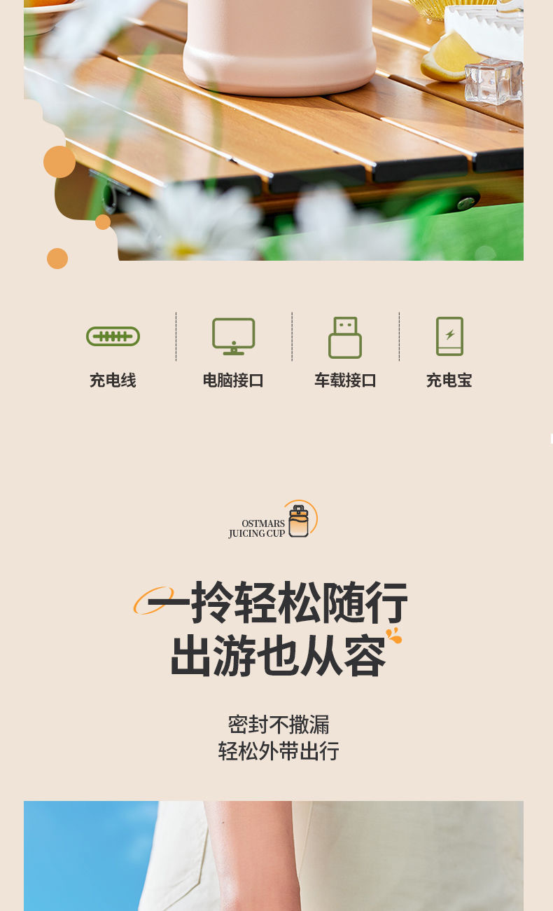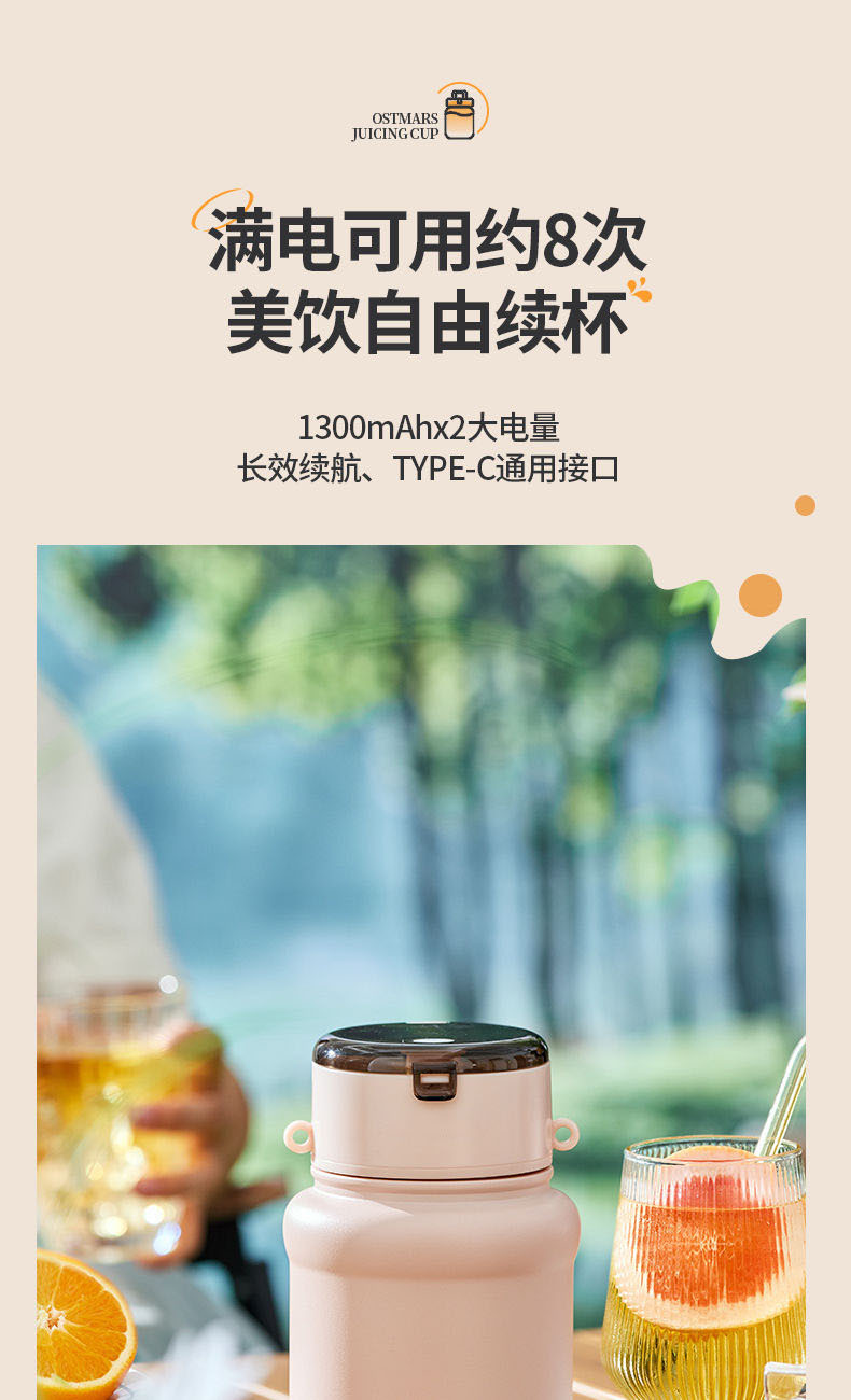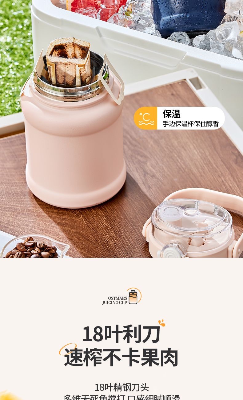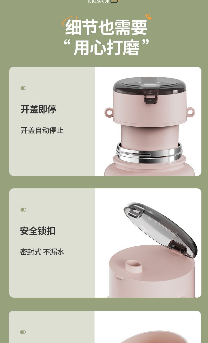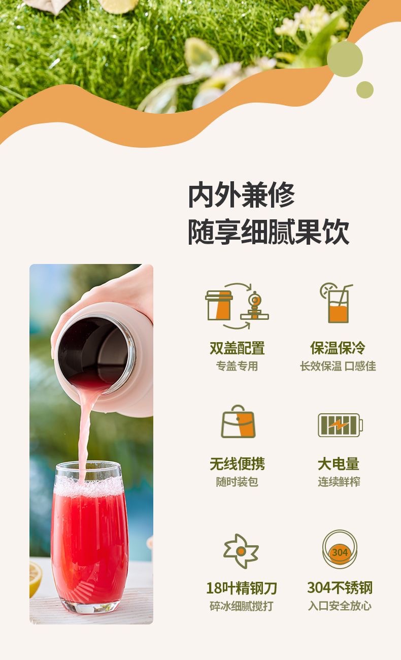 1.室内户外均可 2.充电便携 3.10叶304精钢刀片 4.800ml大容量 5.超长续航,满电8-10杯 6.精致提绳 7.榨汁直饮双盖 8.运动健身榨汁 备注:可定制客户LOGO 专色2000台起