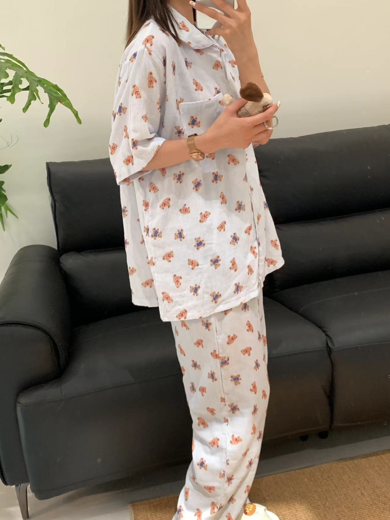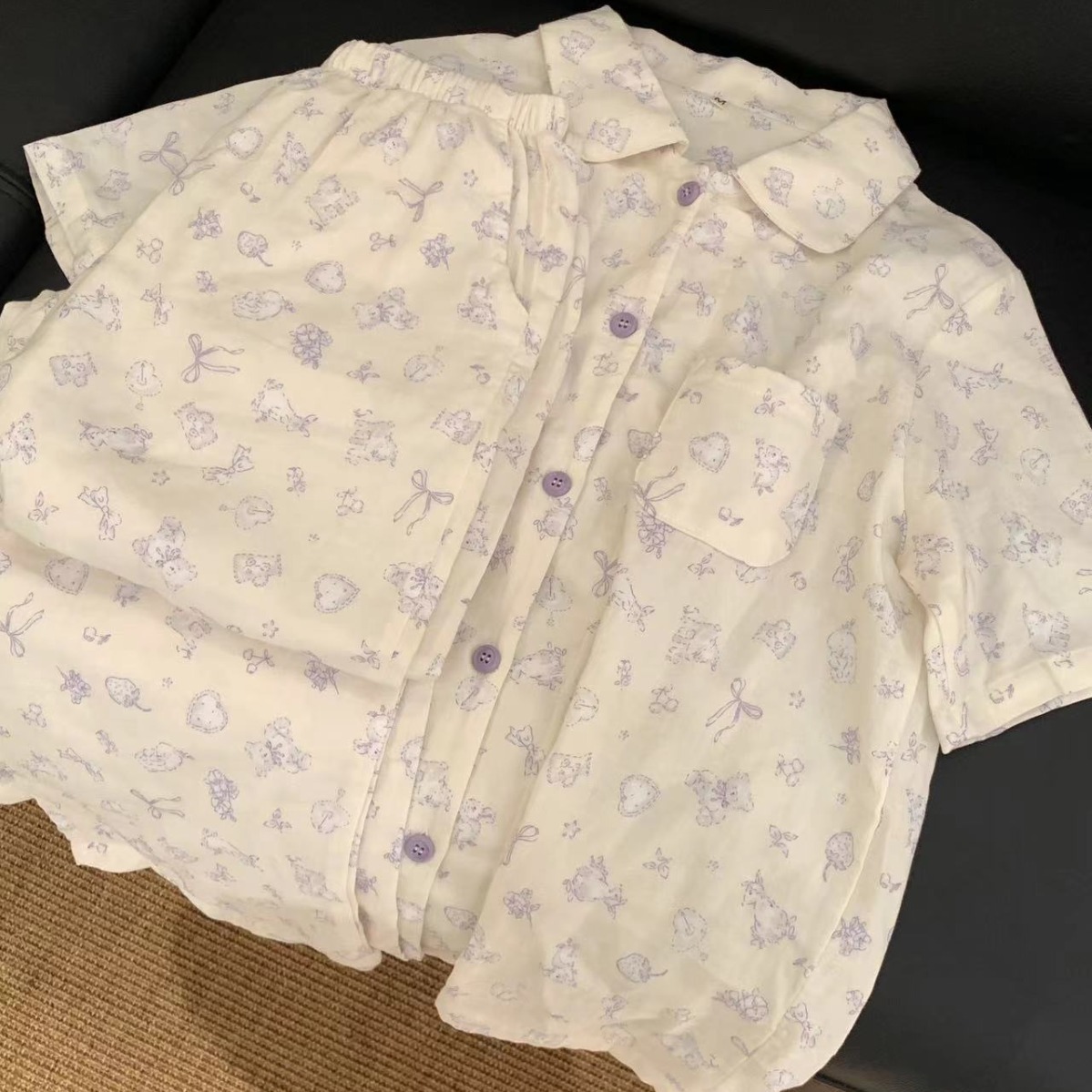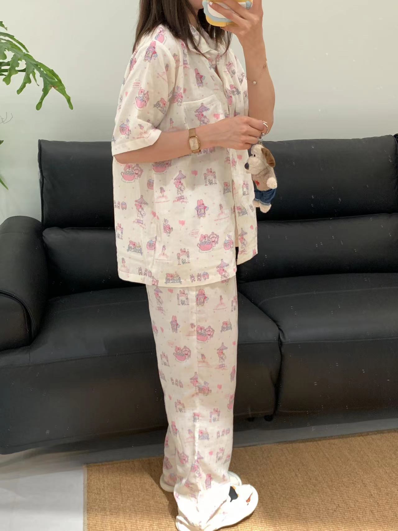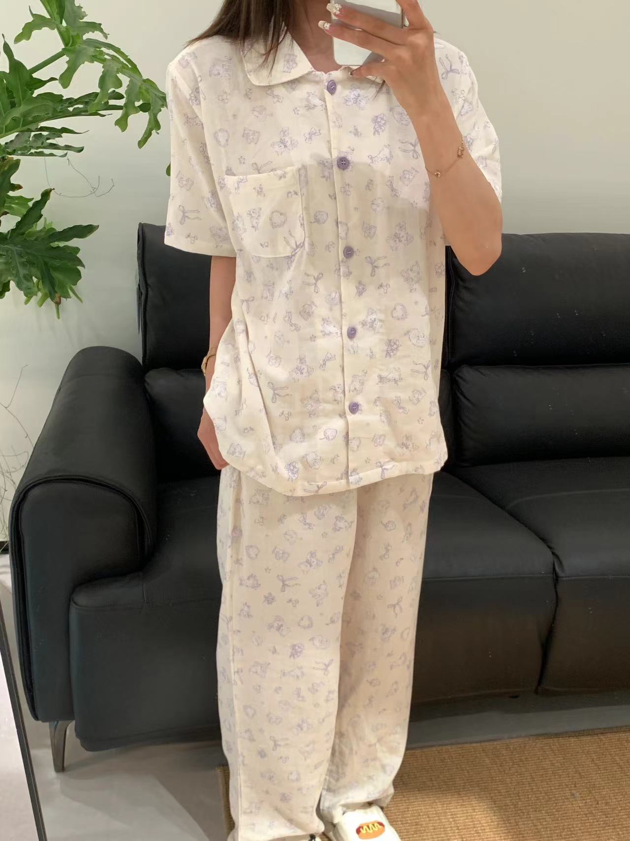반팔 바지 세트 면 더블 레이어 거즈 잠옷 귀여운 달콤한 홈 옷 느슨한 느긋한 면화 잠옷