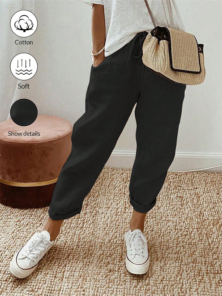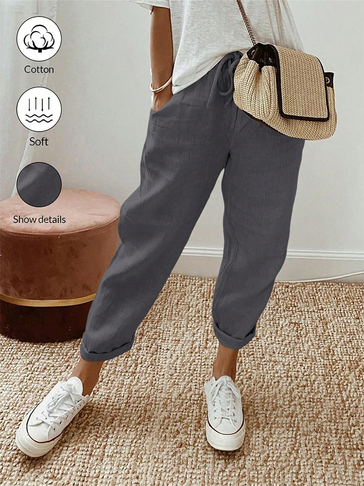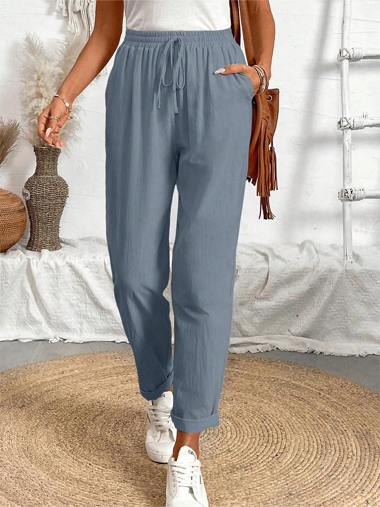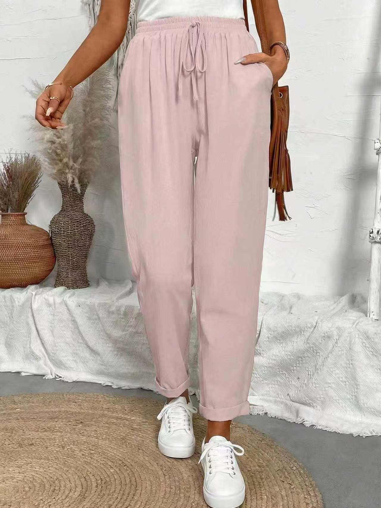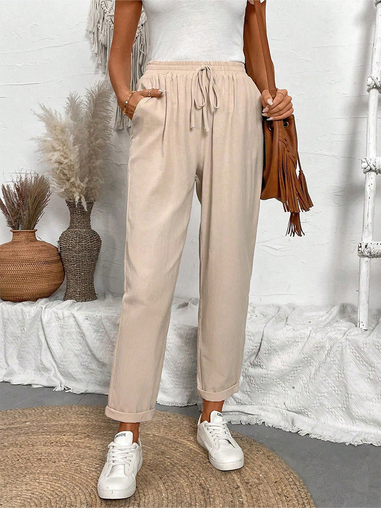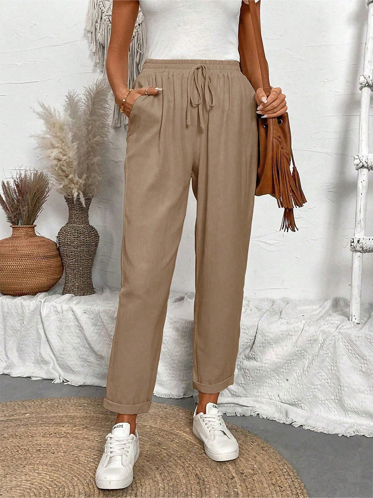 알리익스프레스 아마존 독립 사이트 봄 가을 면마 포켓 밴딩 허리 캐주얼 팬츠 여성용 통근복 루즈핏 9부 바지