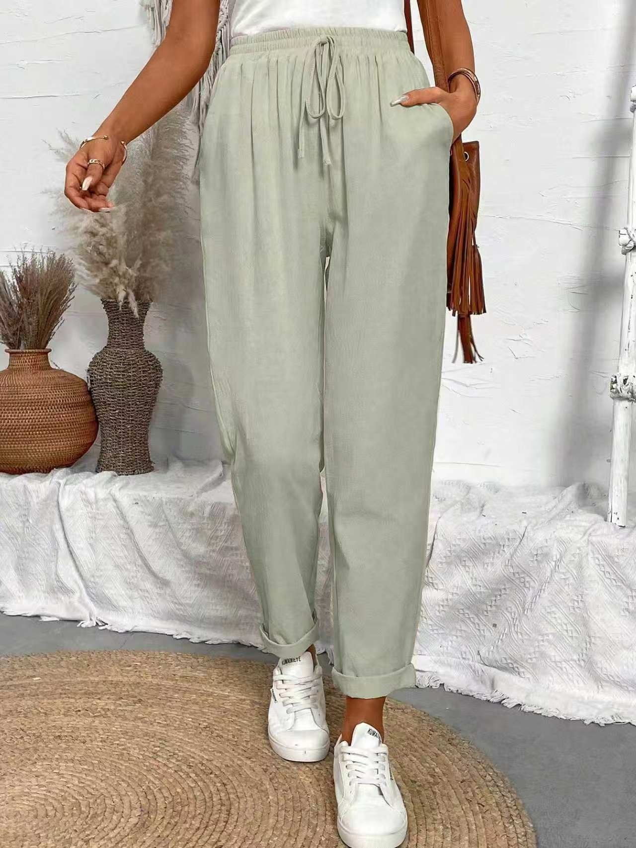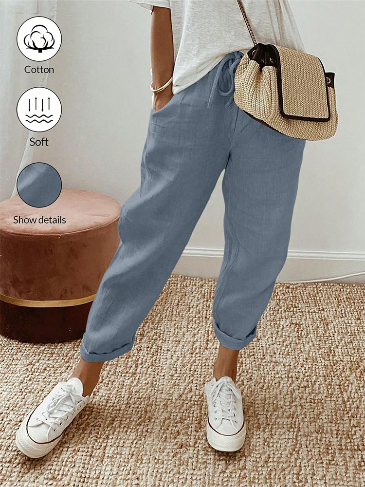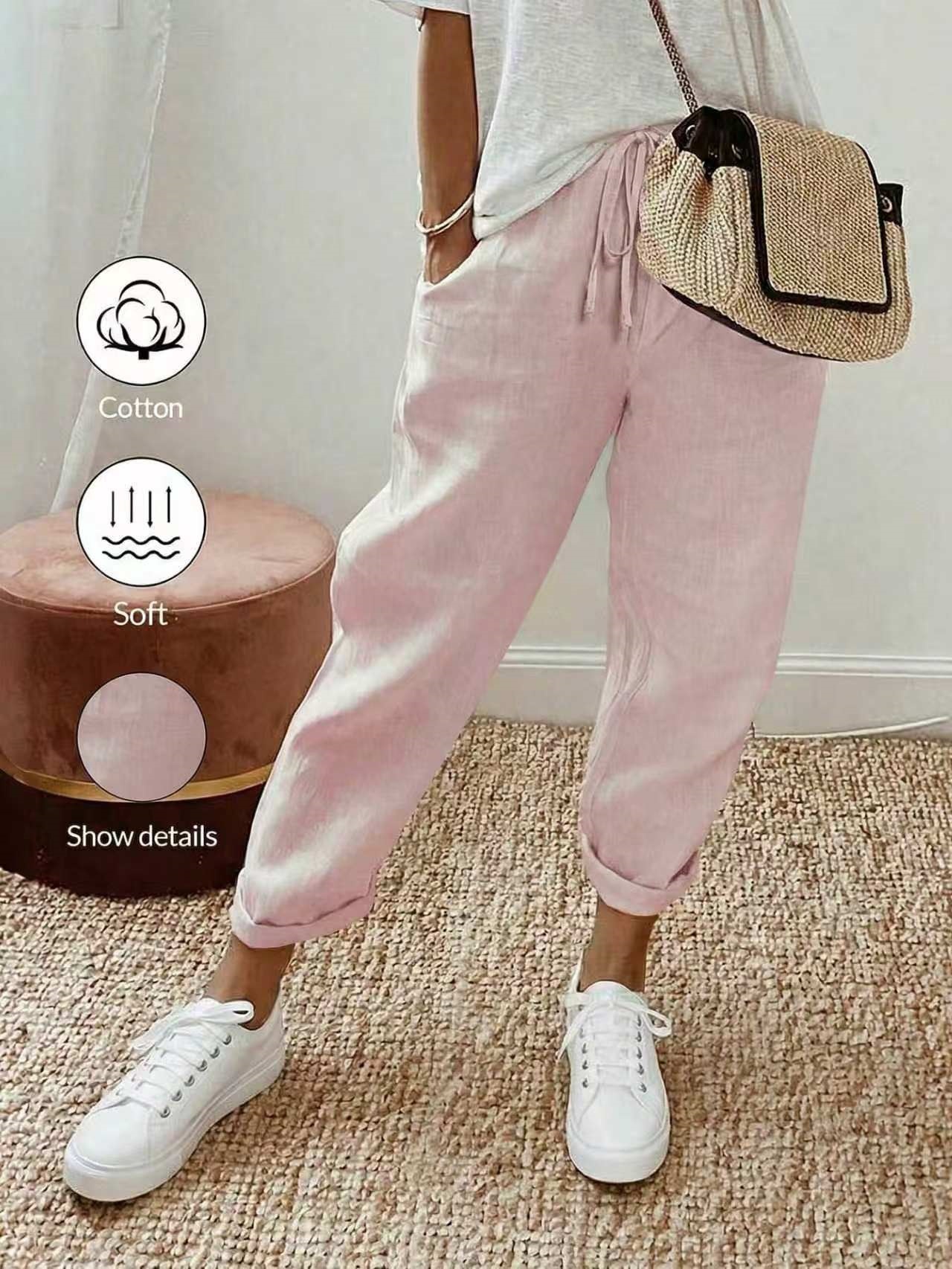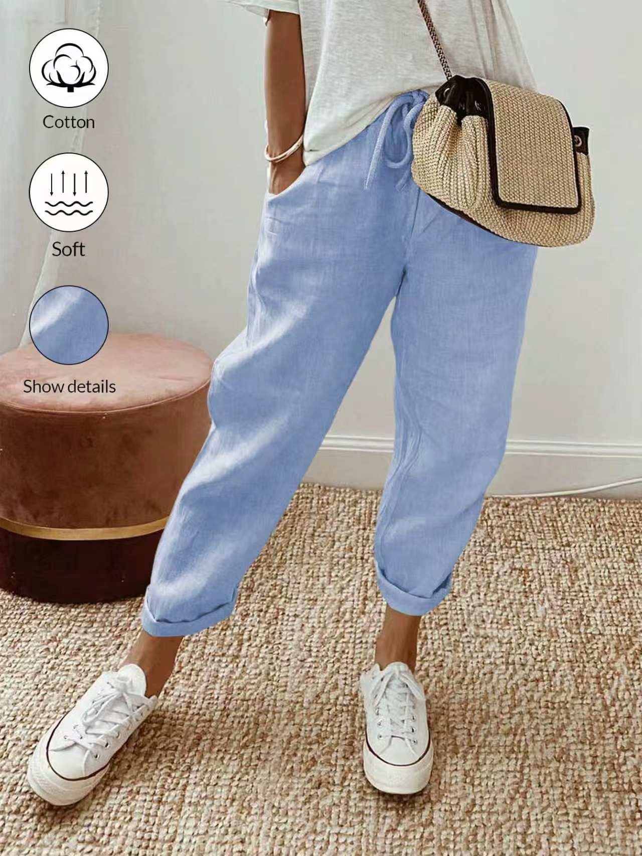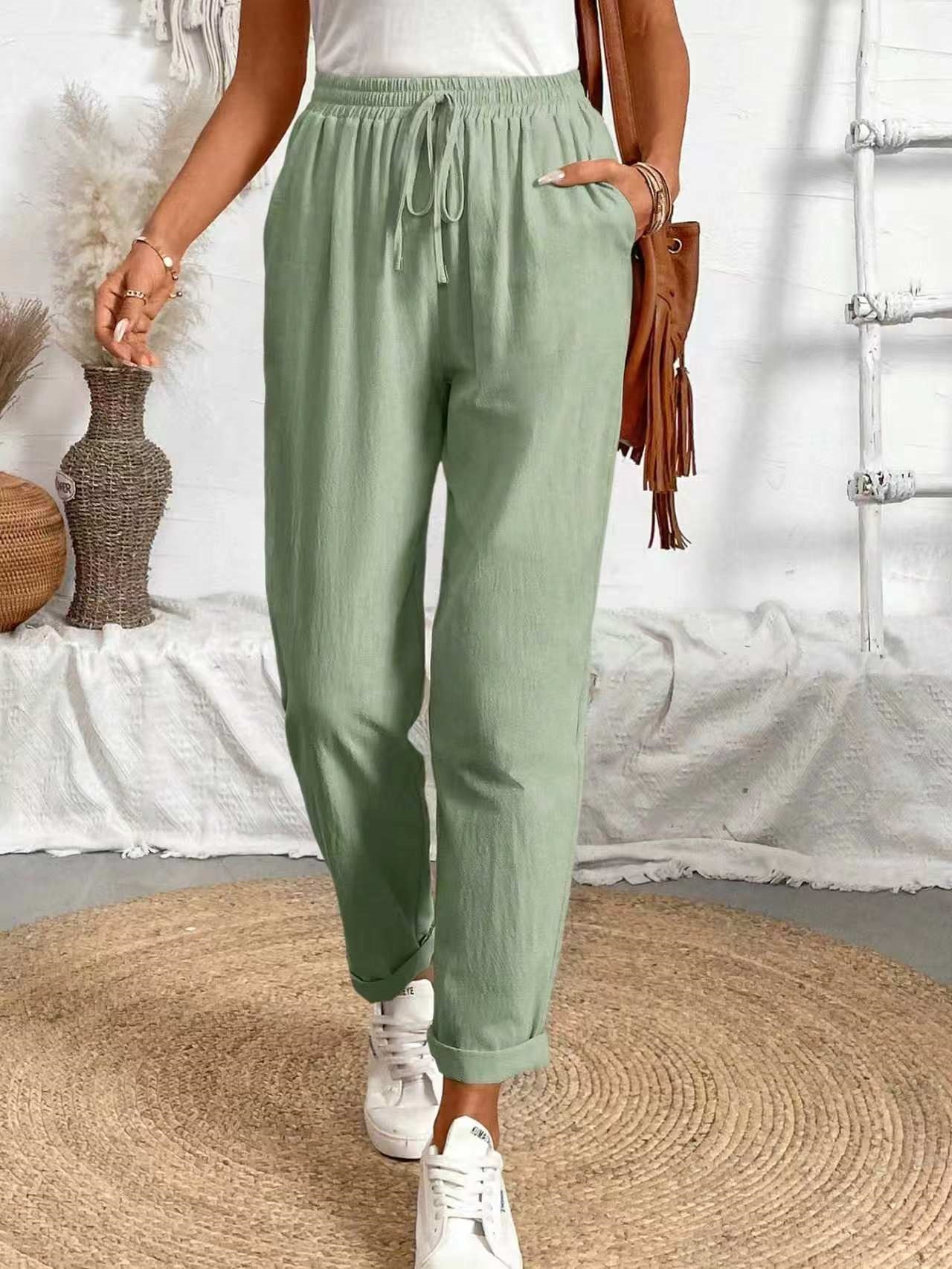 알리익스프레스 아마존 독립 사이트 봄 가을 면마 포켓 밴딩 허리 캐주얼 팬츠 여성용 통근복 루즈핏 9부 바지