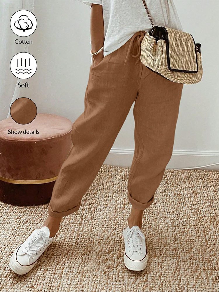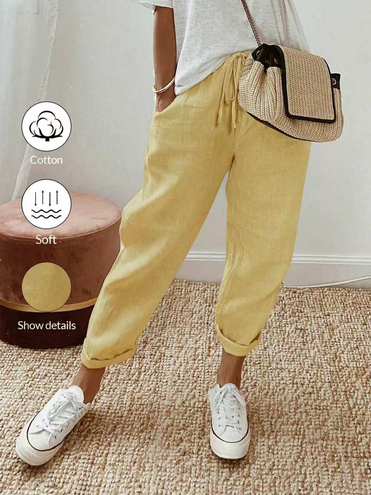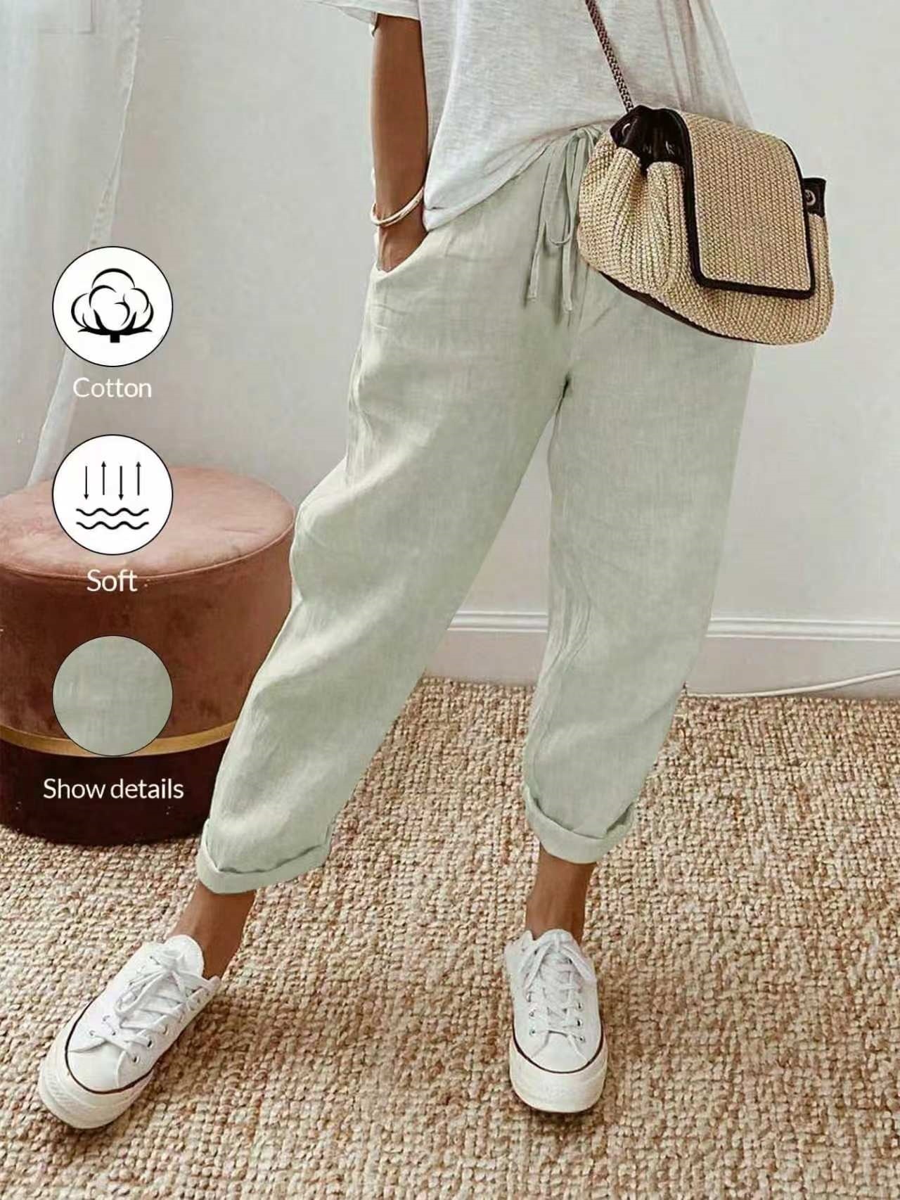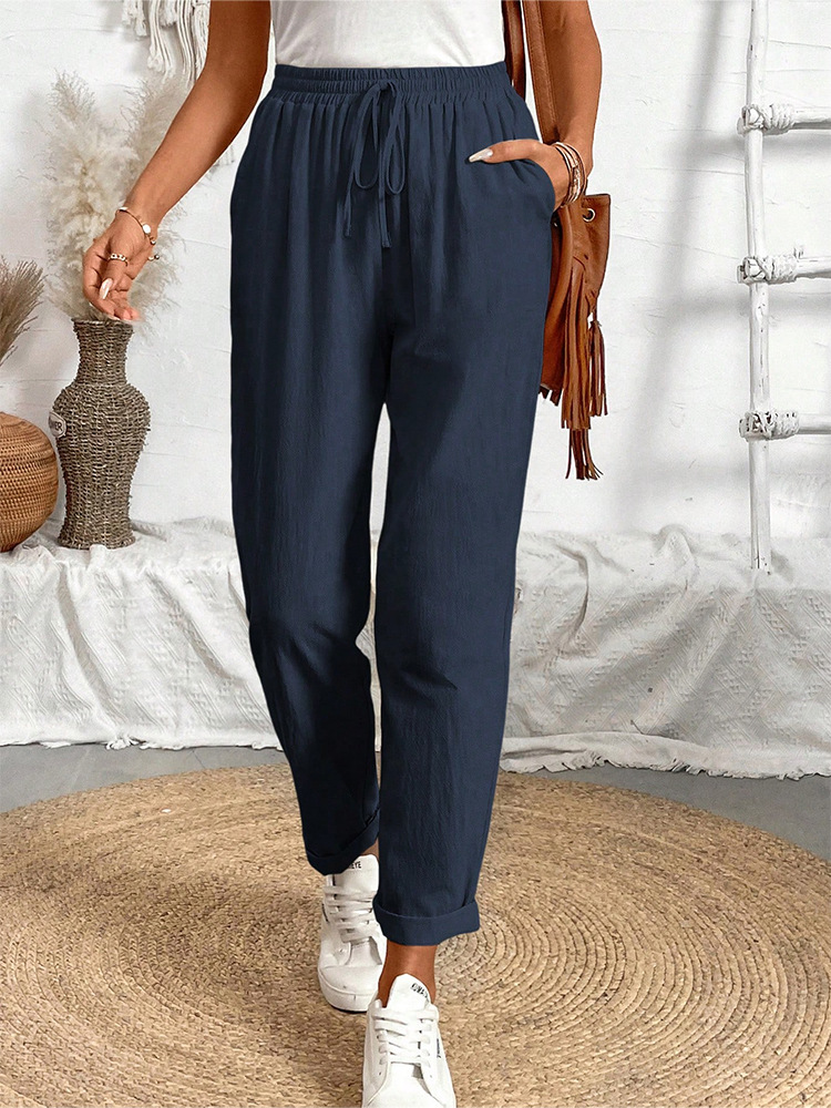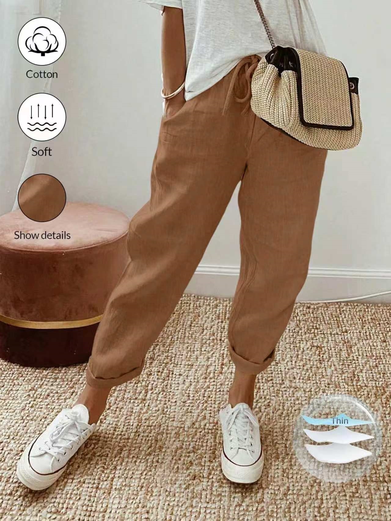 알리익스프레스 아마존 독립 사이트 봄 가을 면마 포켓 밴딩 허리 캐주얼 팬츠 여성용 통근복 루즈핏 9부 바지