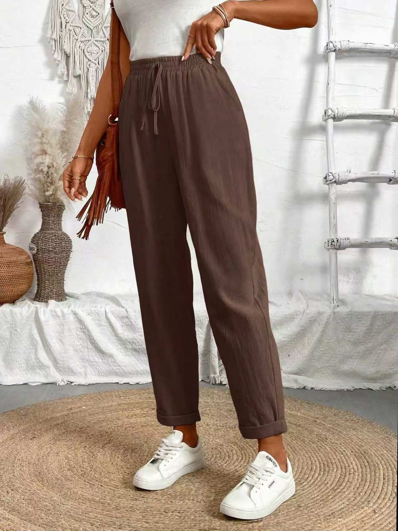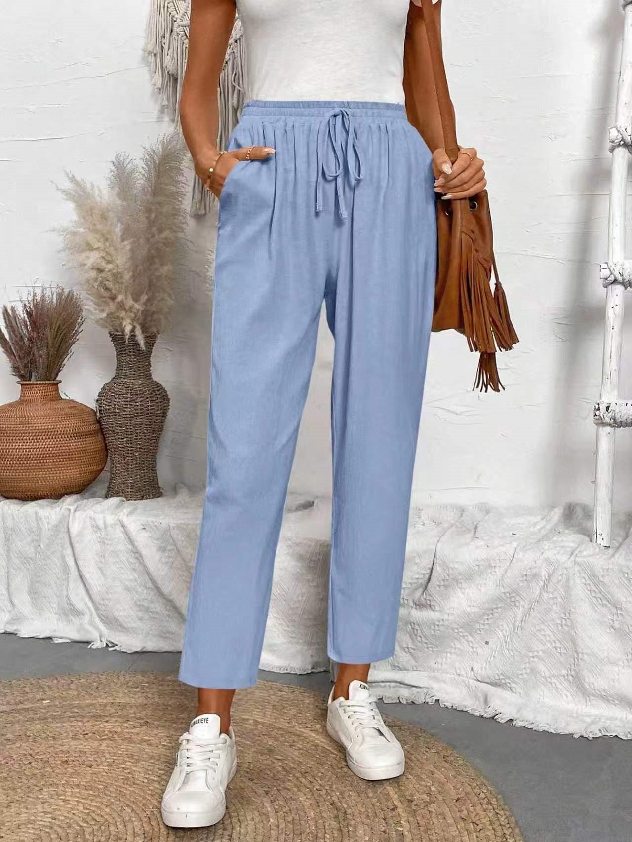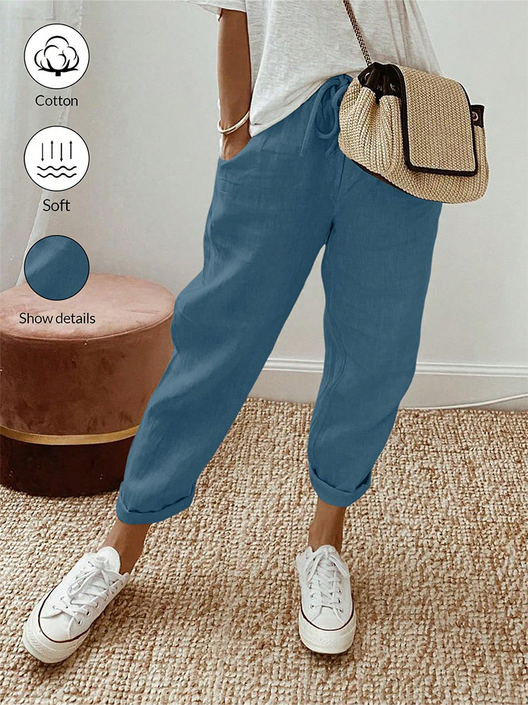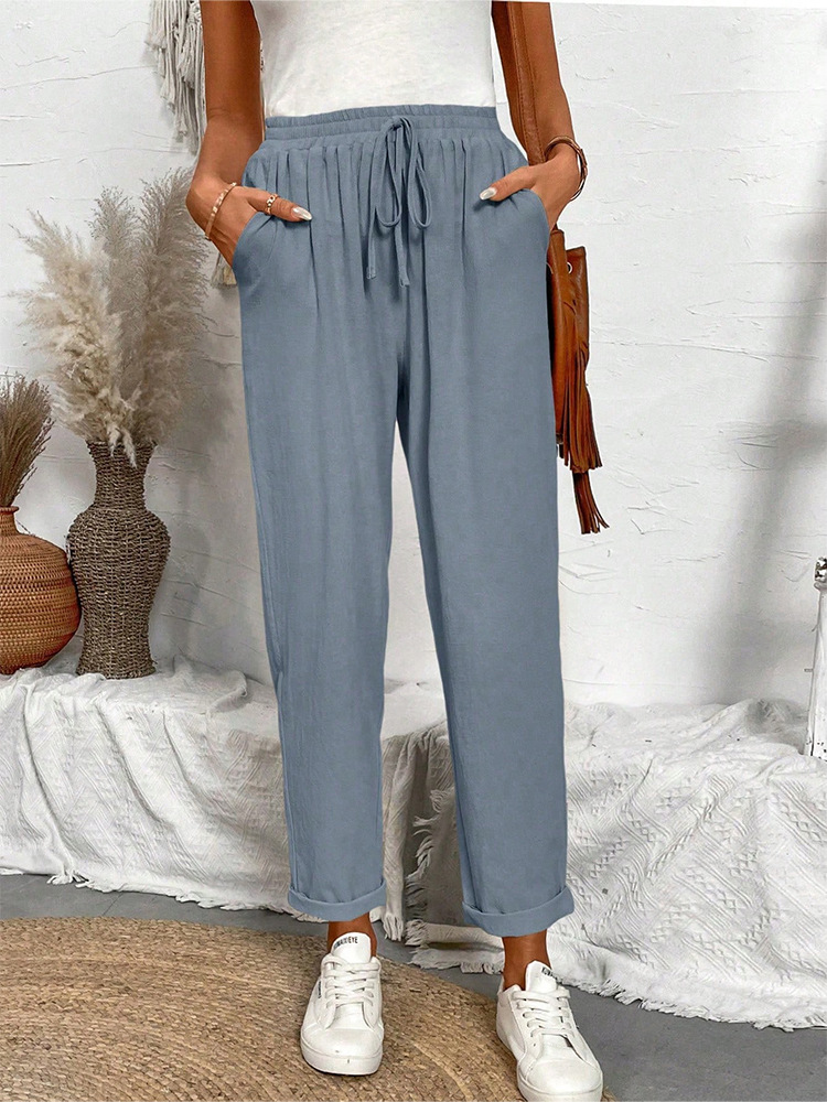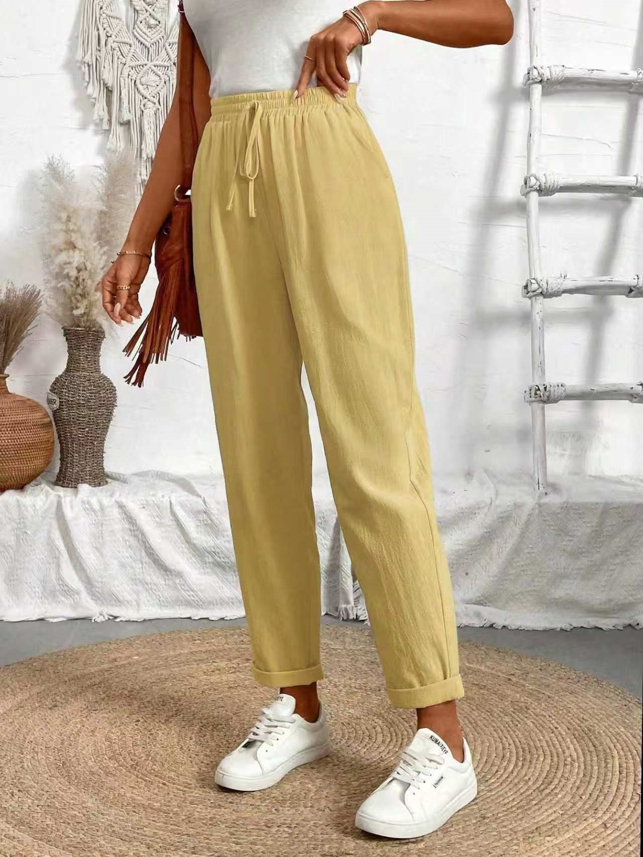 알리익스프레스 아마존 독립 사이트 봄 가을 면마 포켓 밴딩 허리 캐주얼 팬츠 여성용 통근복 루즈핏 9부 바지