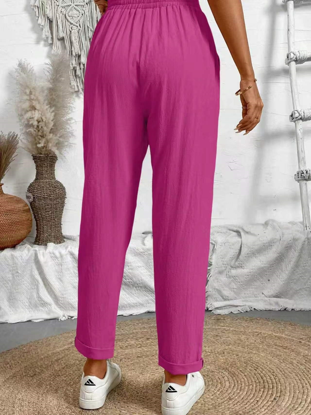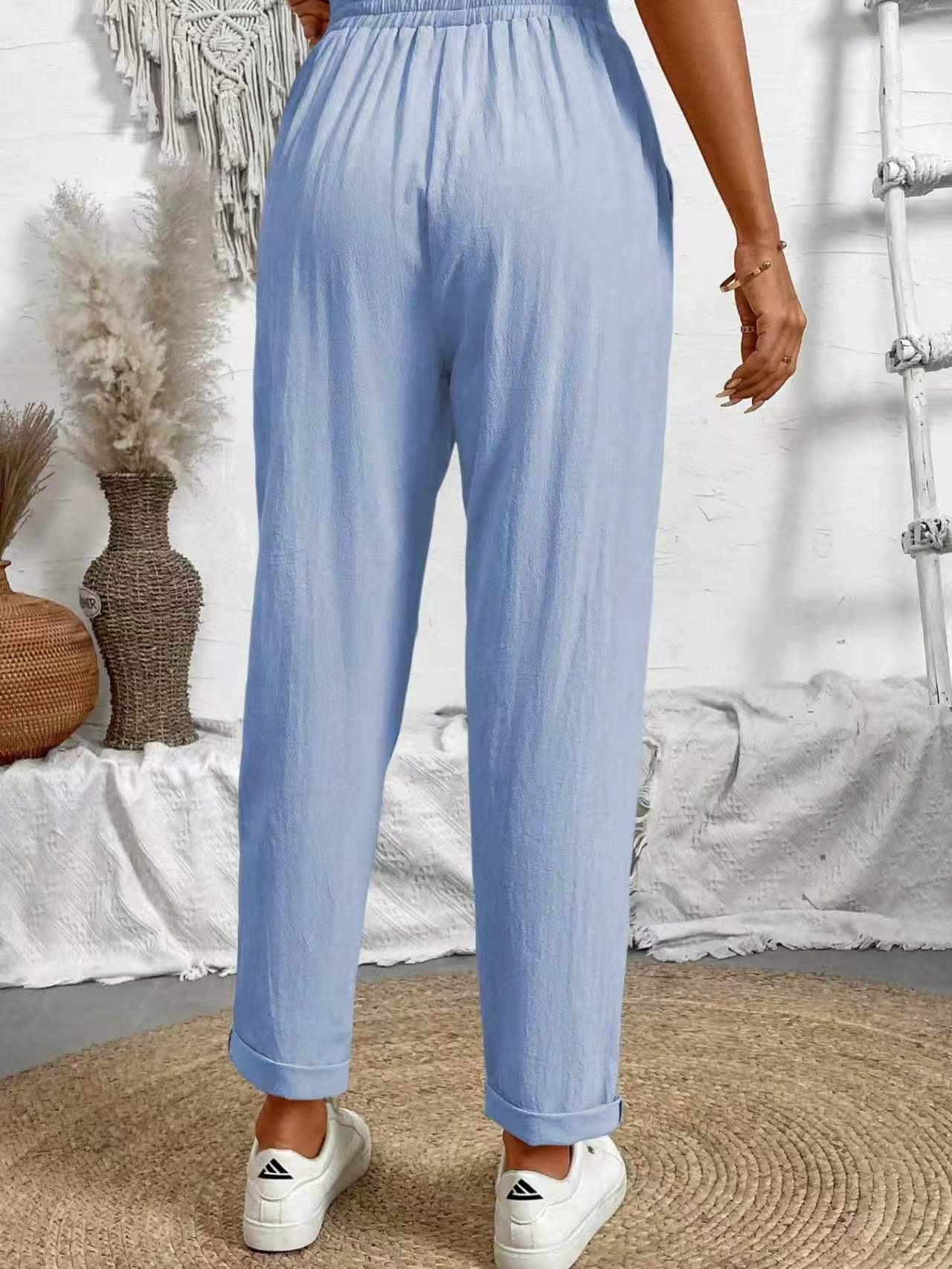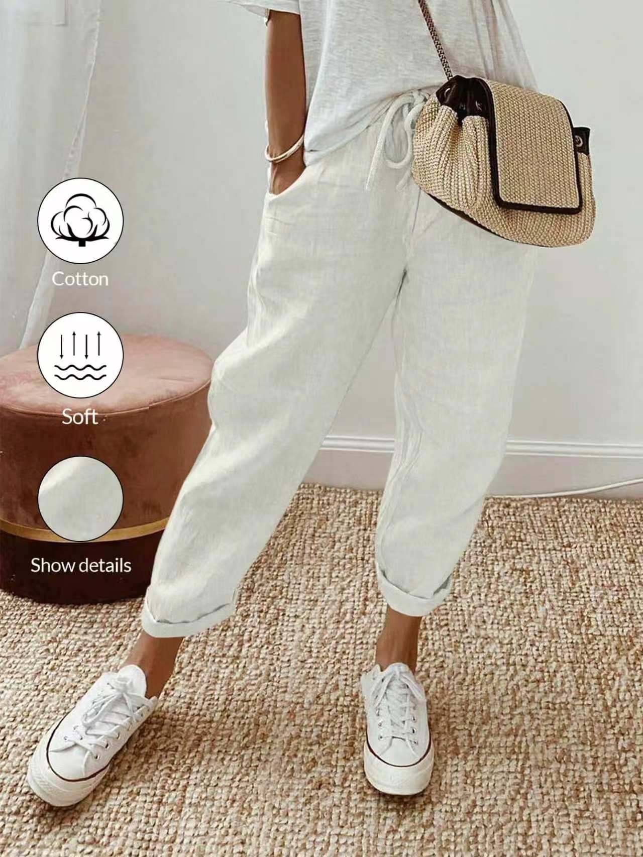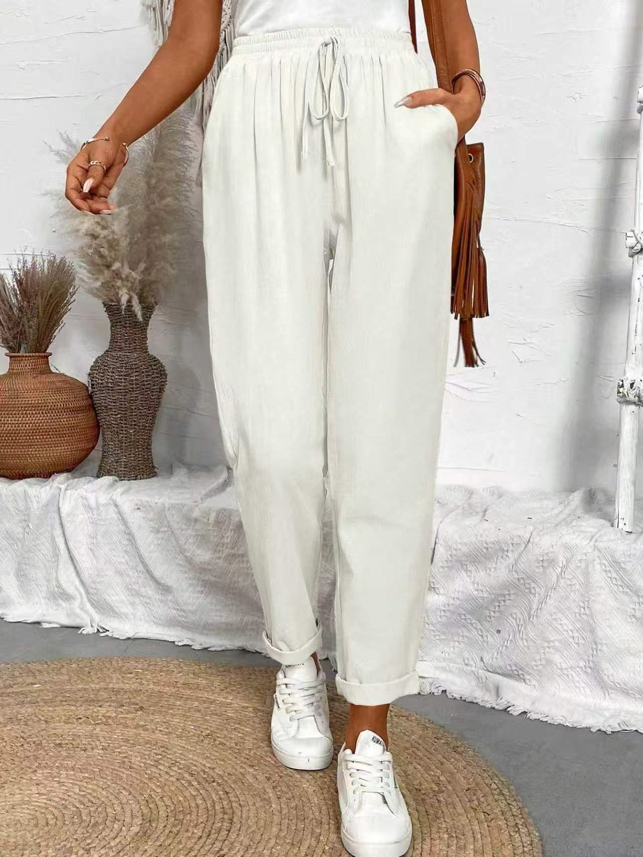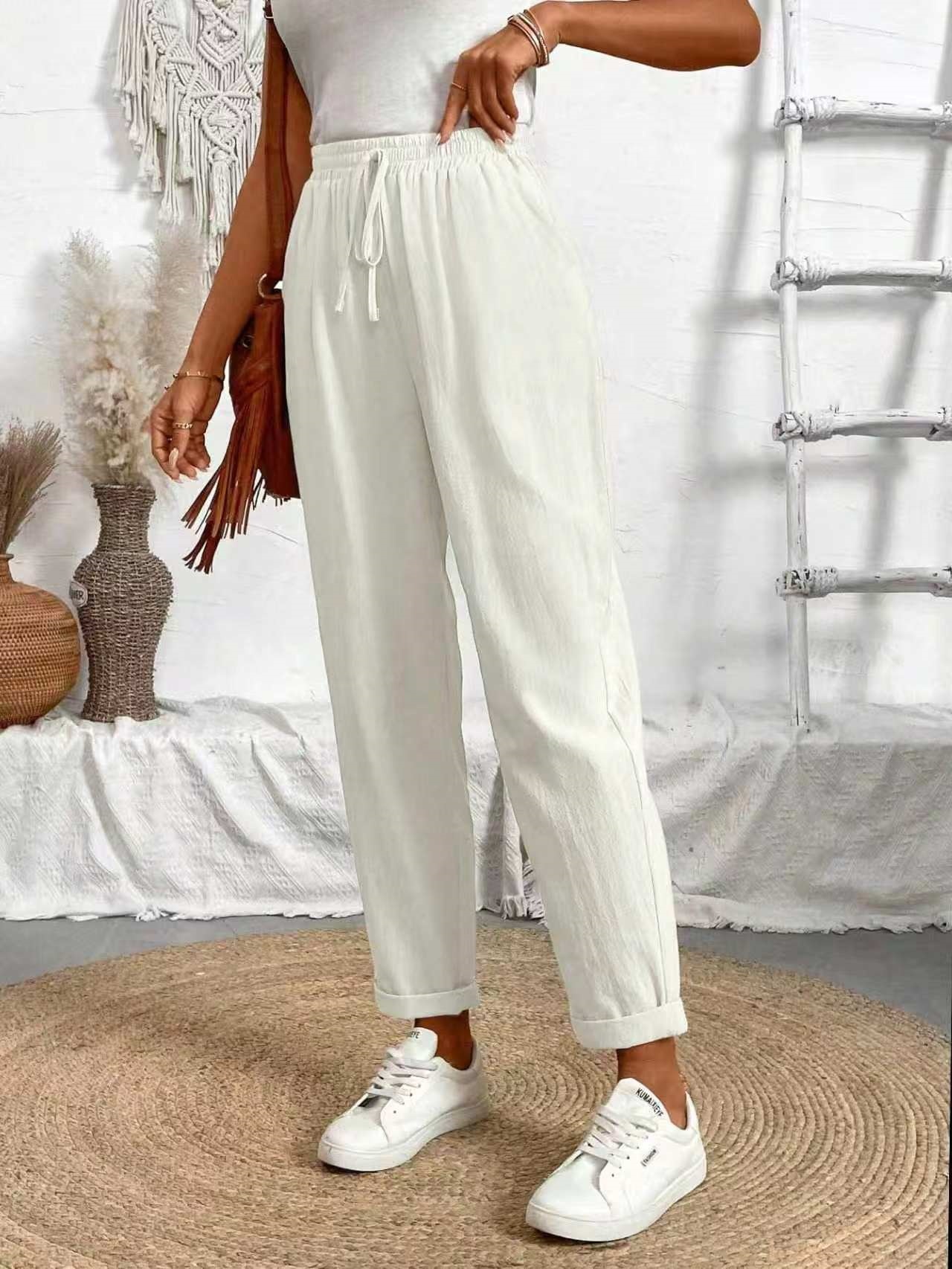 알리익스프레스 아마존 독립 사이트 봄 가을 면마 포켓 밴딩 허리 캐주얼 팬츠 여성용 통근복 루즈핏 9부 바지