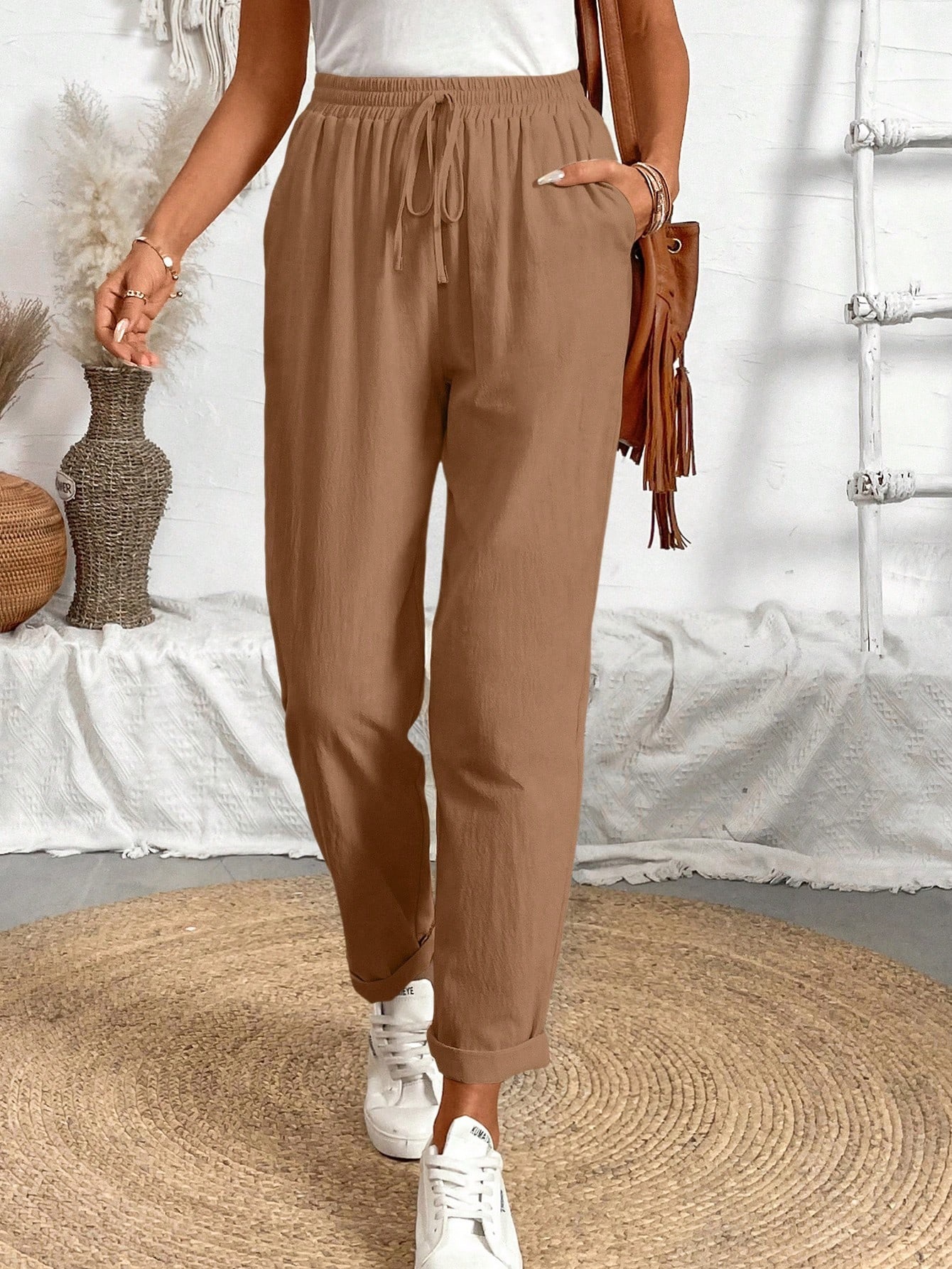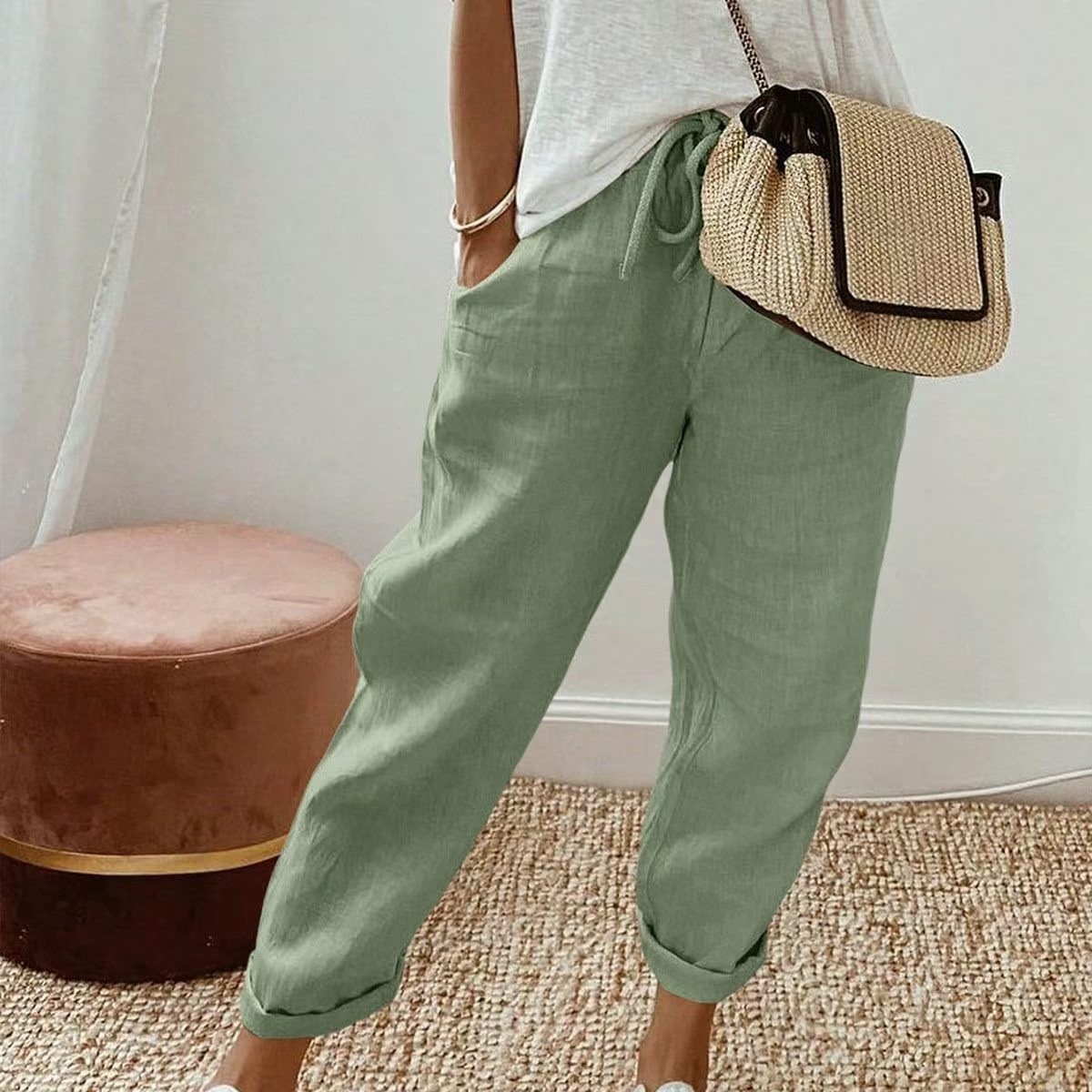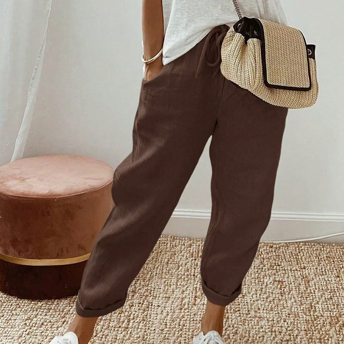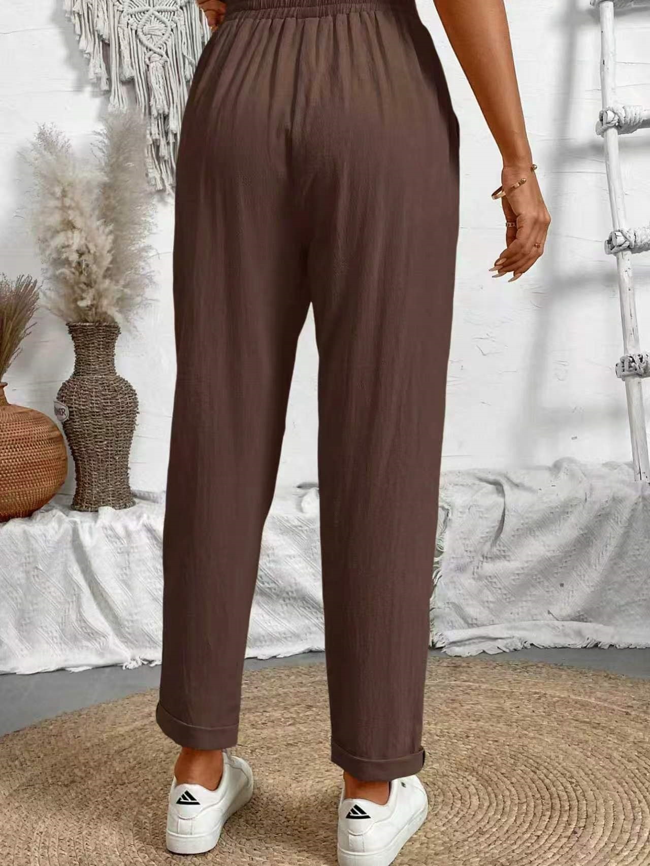 알리익스프레스 아마존 독립 사이트 봄 가을 면마 포켓 밴딩 허리 캐주얼 팬츠 여성용 통근복 루즈핏 9부 바지