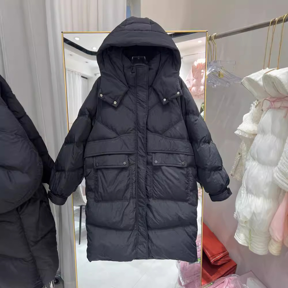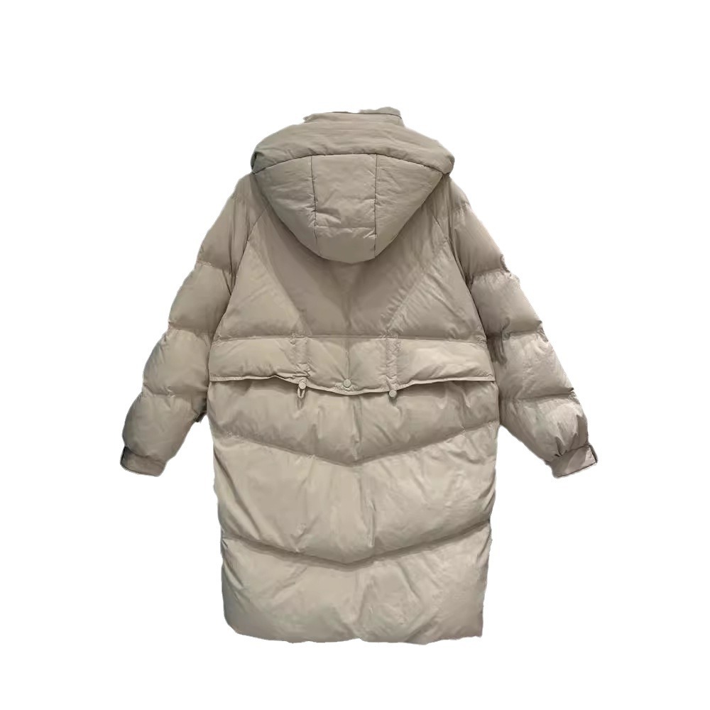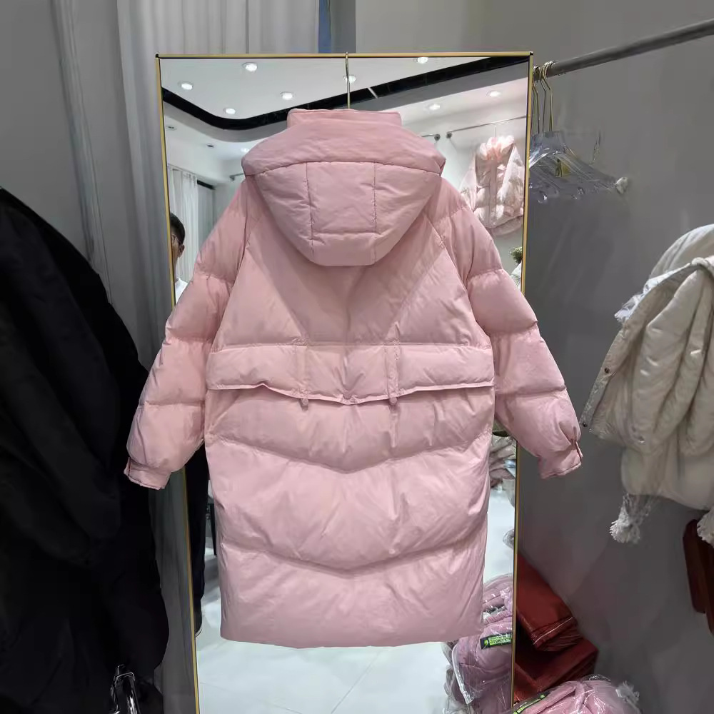2025 겨울 신상 여성용 중간 길이 무릎 위까지 오는 흰색 오리털 루즈핏 후드 두꺼운 따뜻한 코트