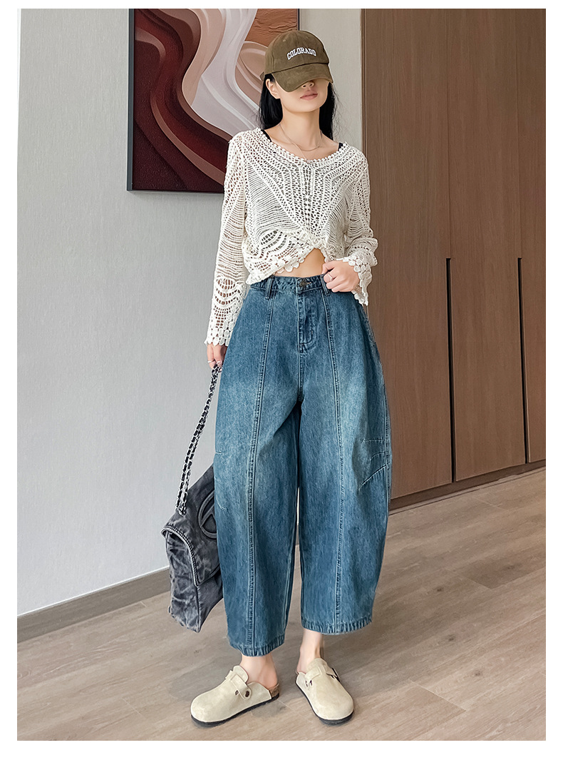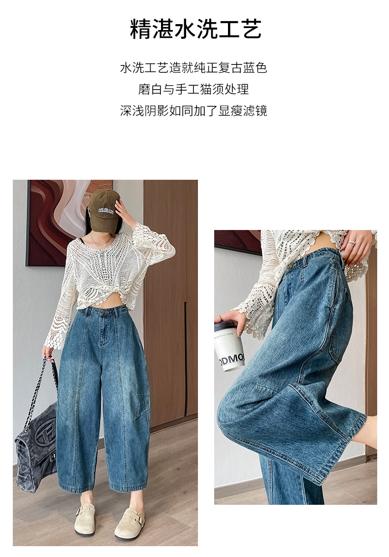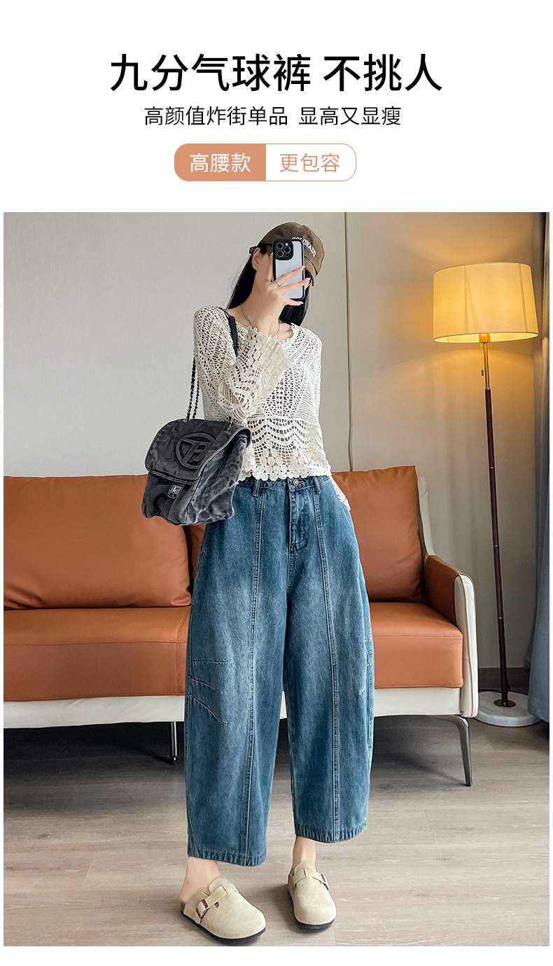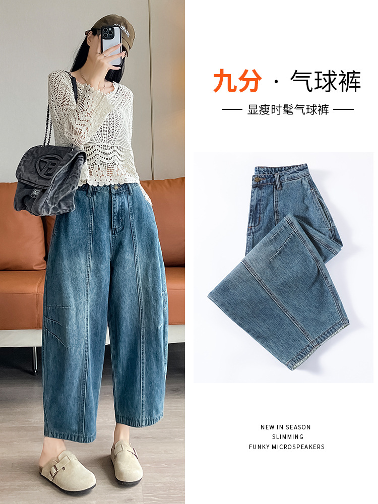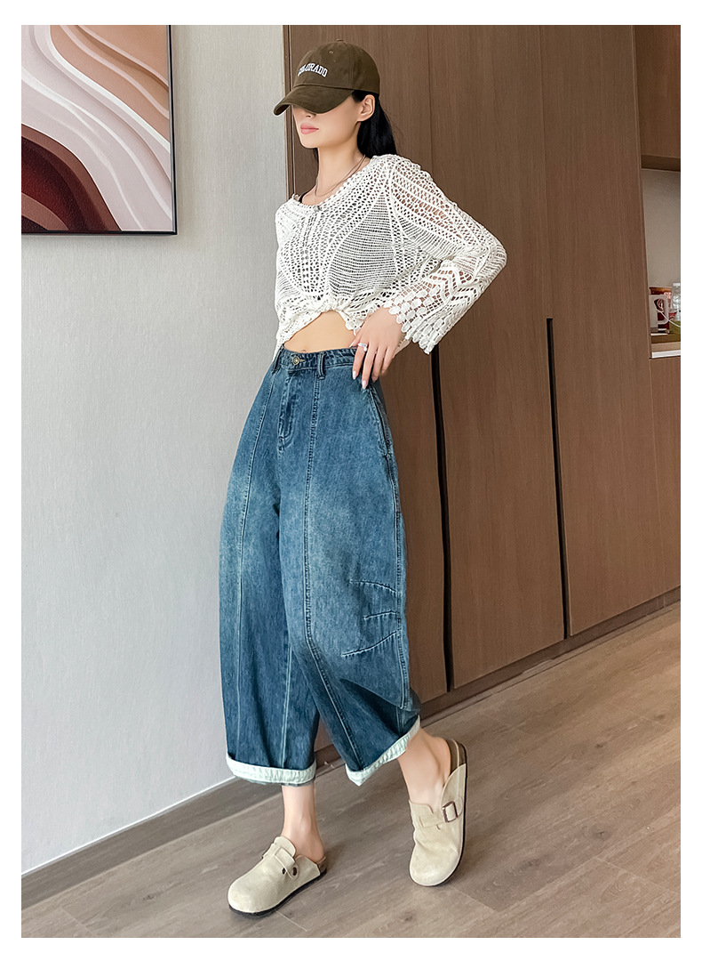 2024 블루 디자인 워시 빈티지 풍선 넓은 다리 자른 청바지 여성의 여름 새로운 높은 허리 당근 바지