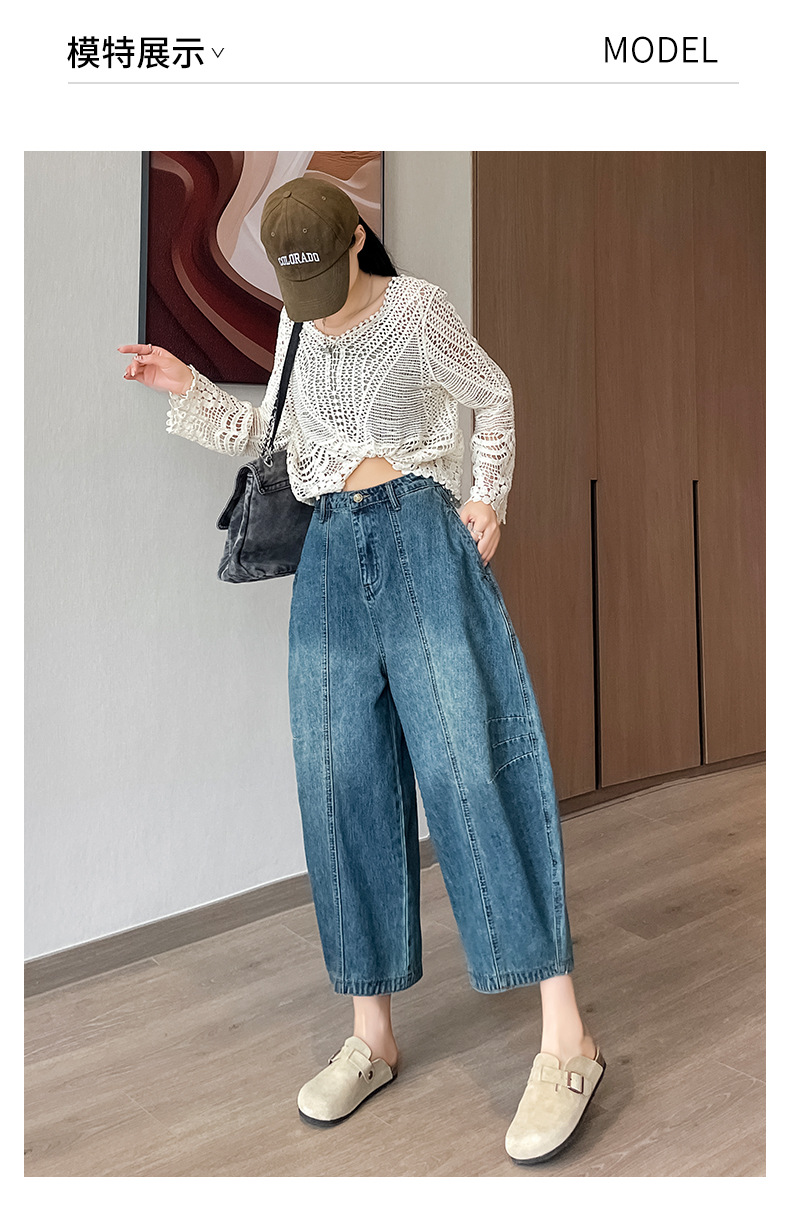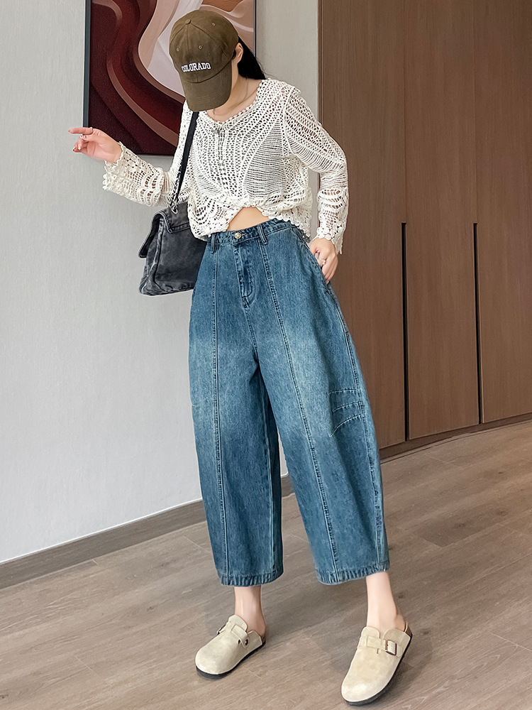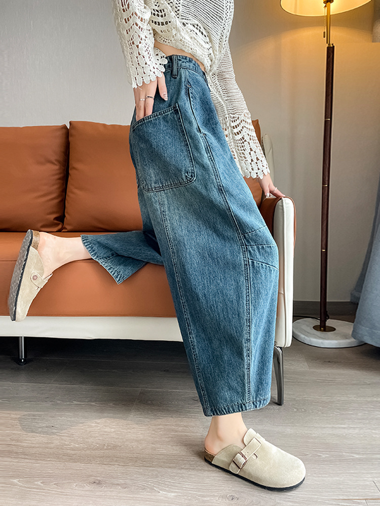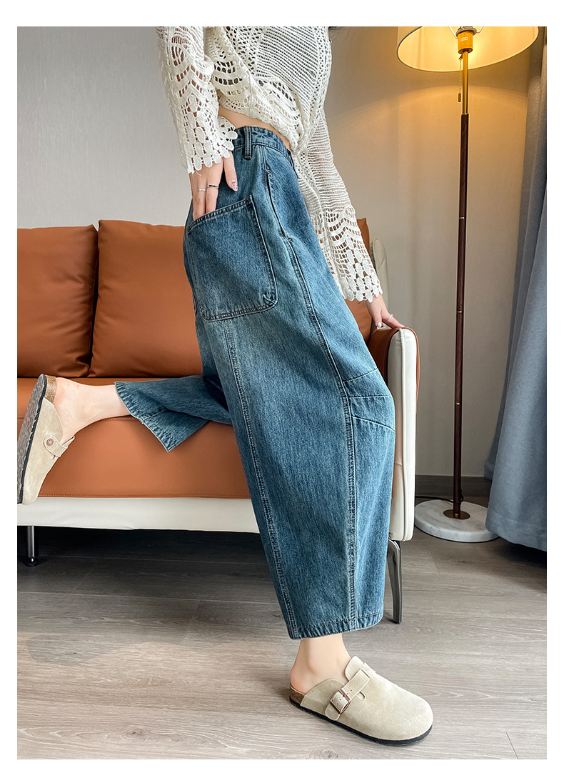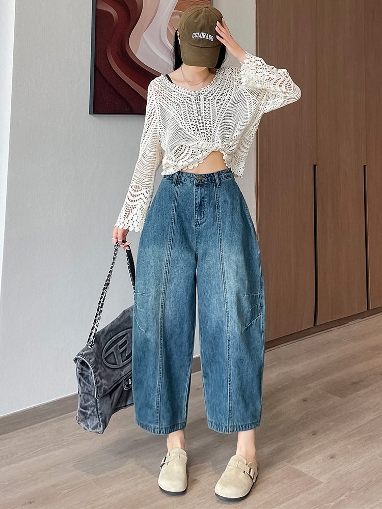 2024 블루 디자인 워시 빈티지 풍선 넓은 다리 자른 청바지 여성의 여름 새로운 높은 허리 당근 바지