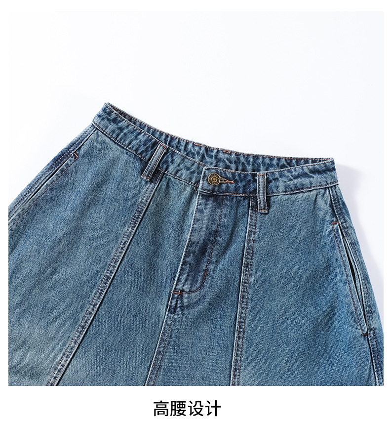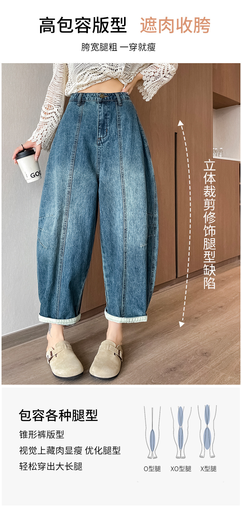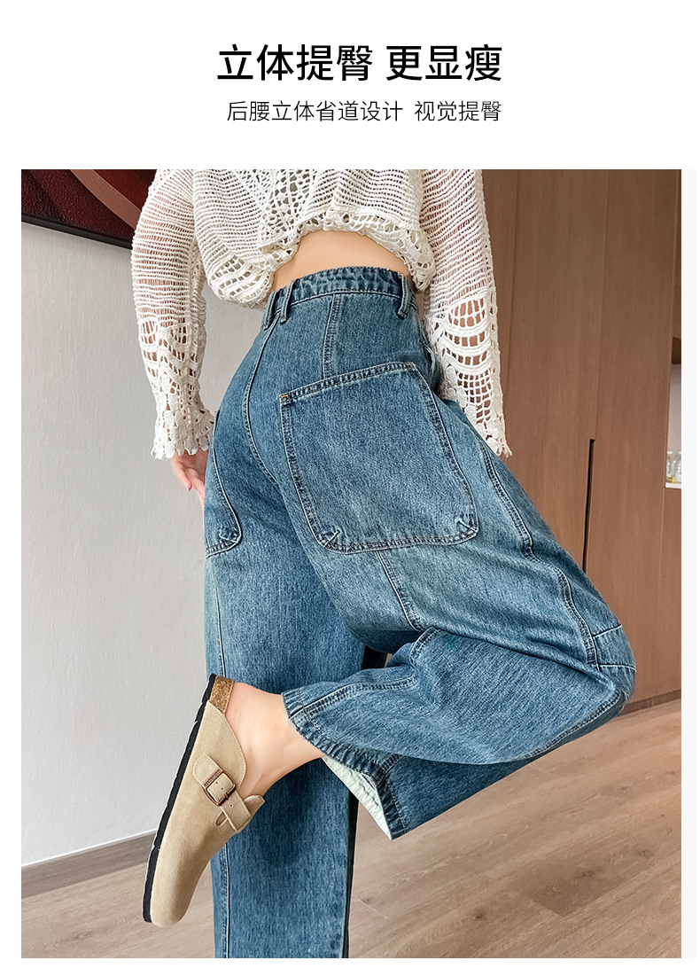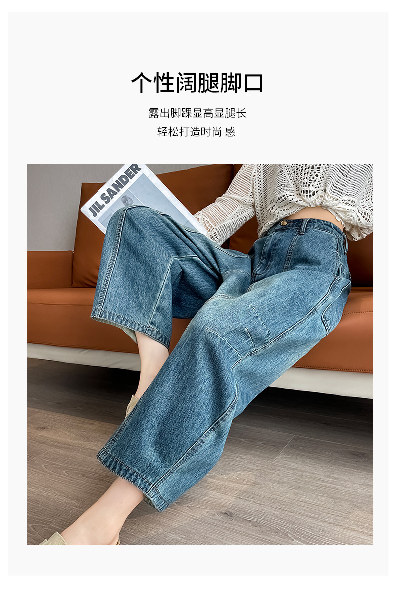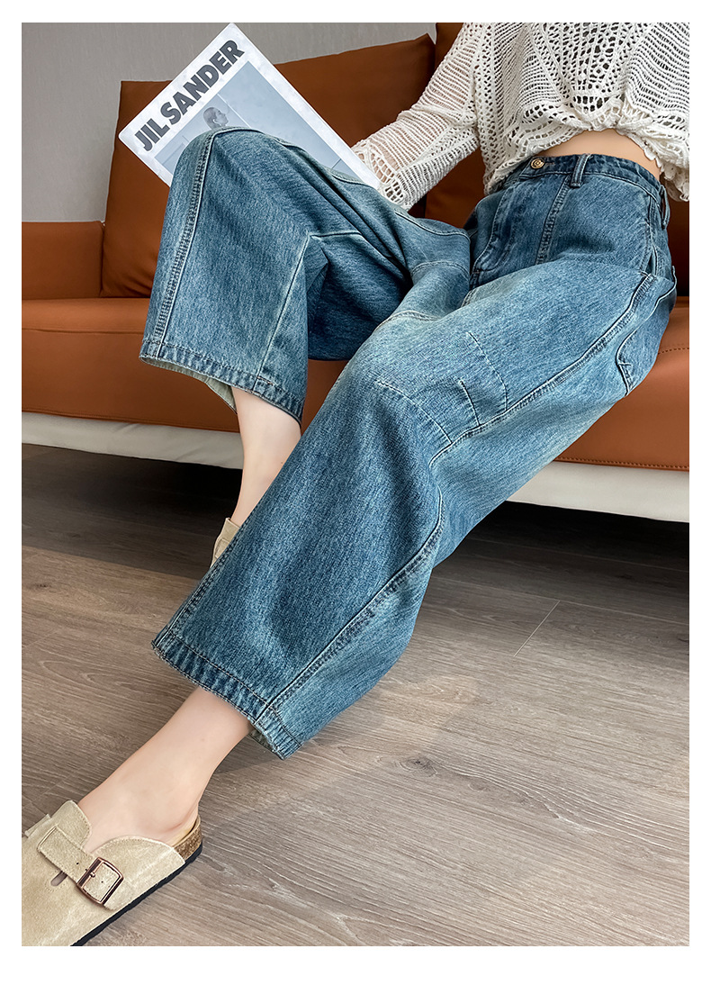 2024 블루 디자인 워시 빈티지 풍선 넓은 다리 자른 청바지 여성의 여름 새로운 높은 허리 당근 바지