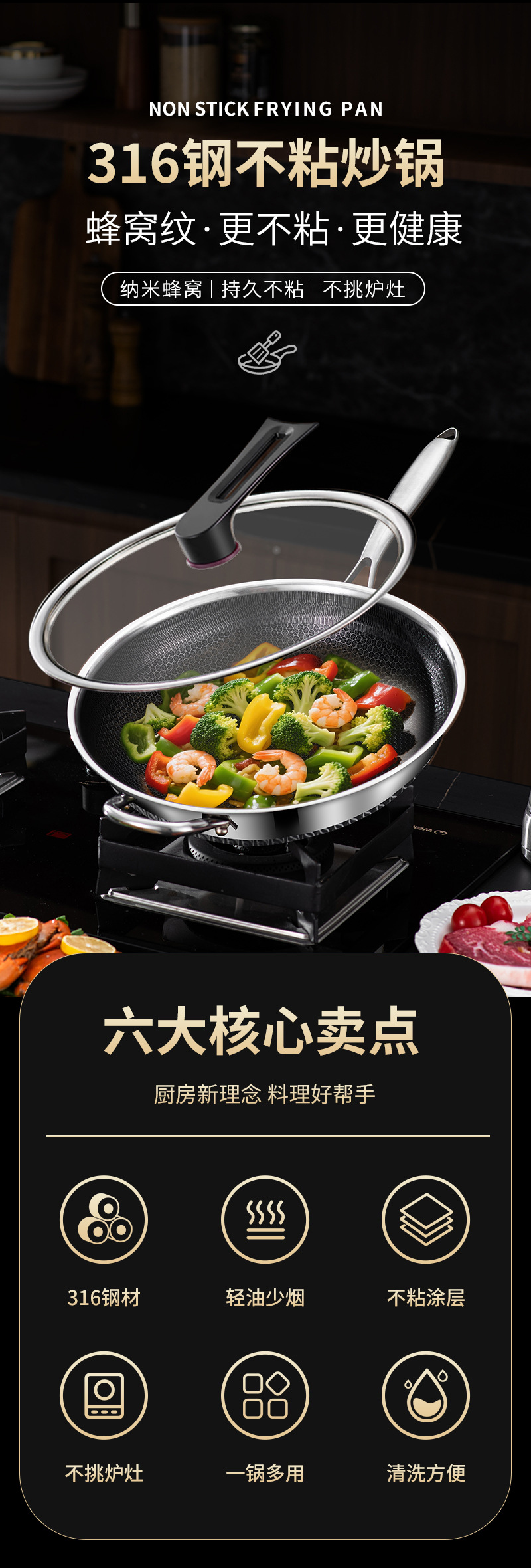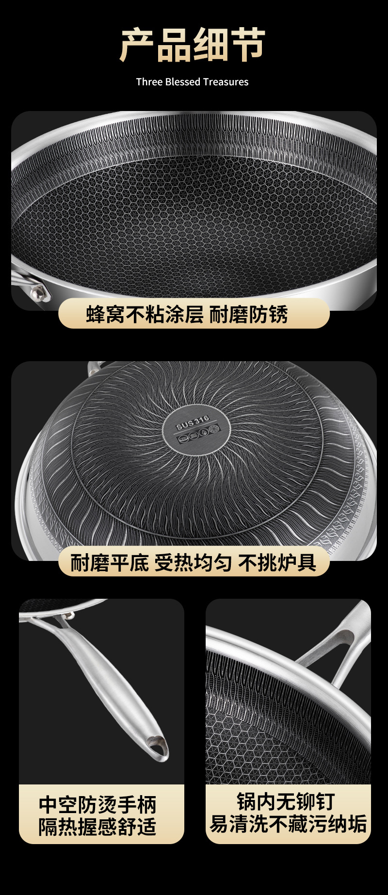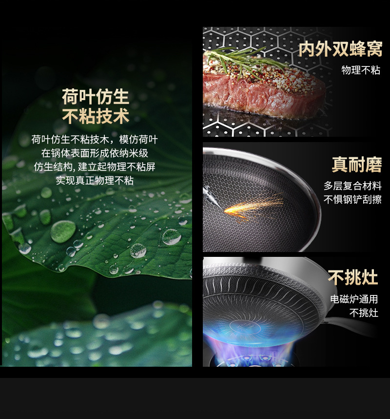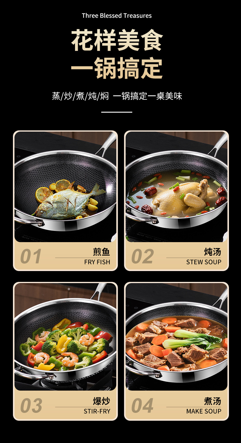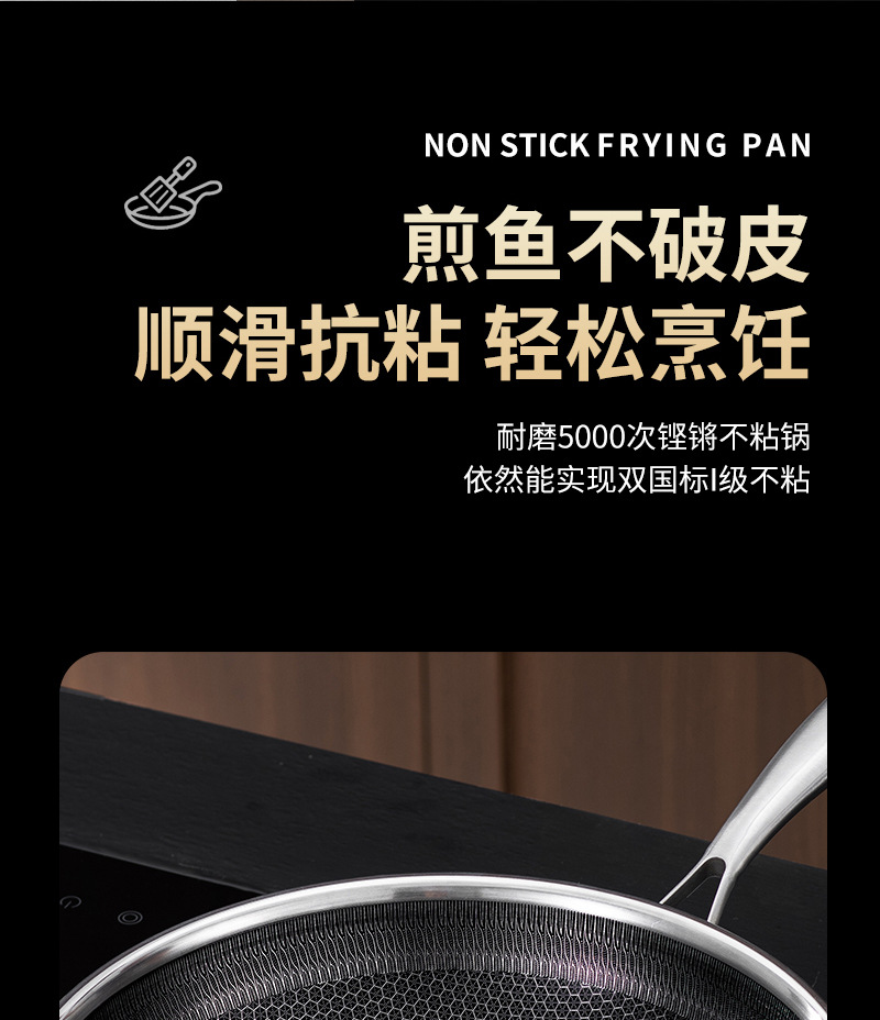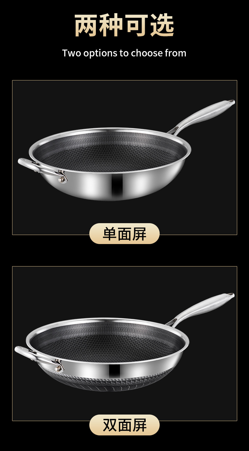 엄선된 316 스테인리스 스틸 프라이팬, 양면 벌집 무늬, 논스틱, 가정용, 인덕션 사용 가능, 튀김팬, 볶음팬