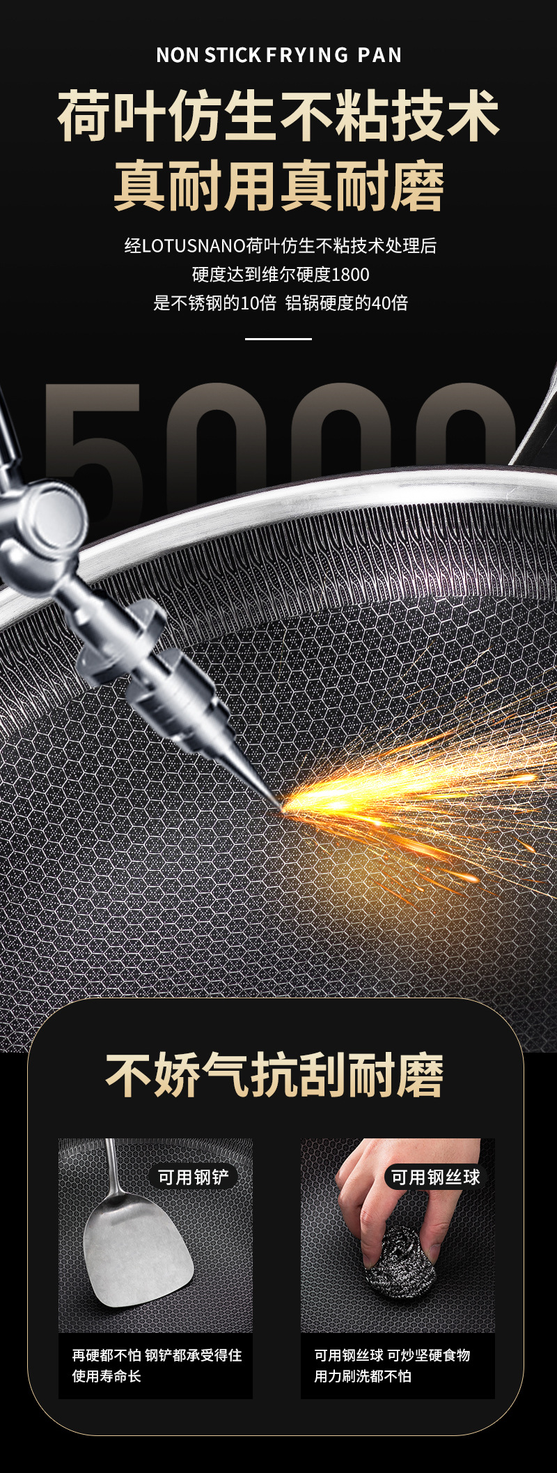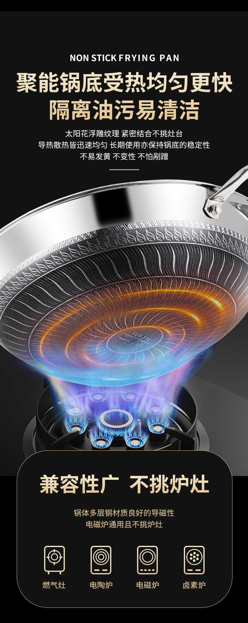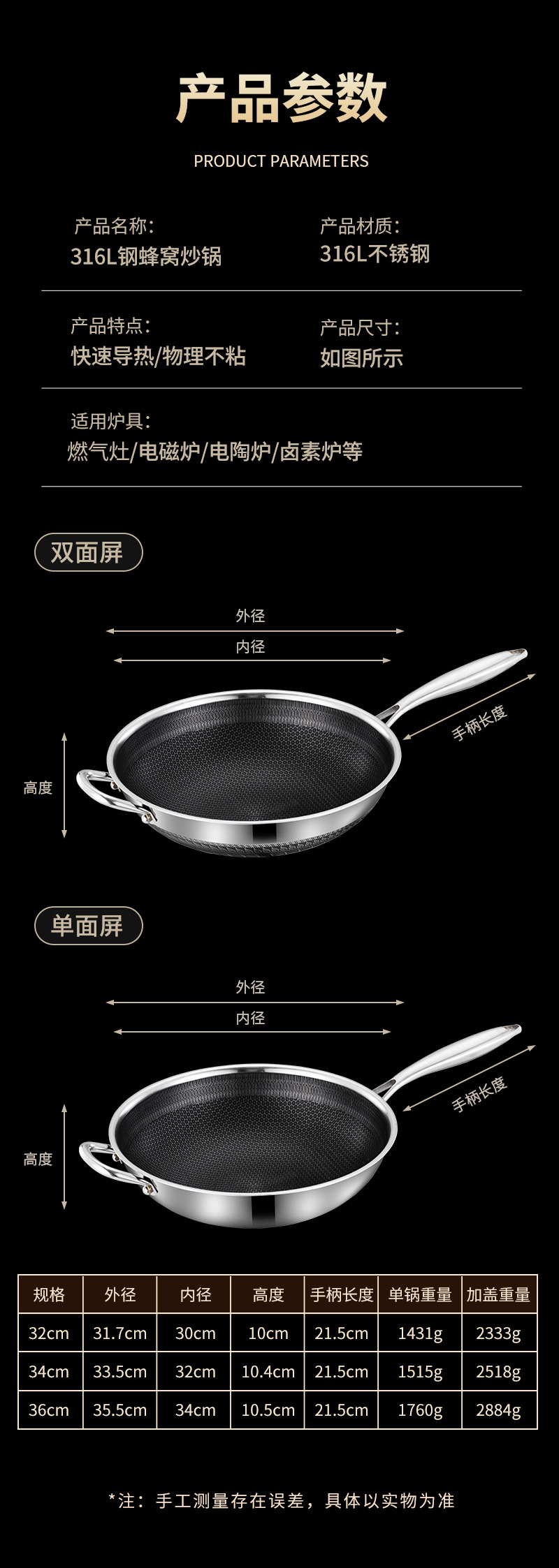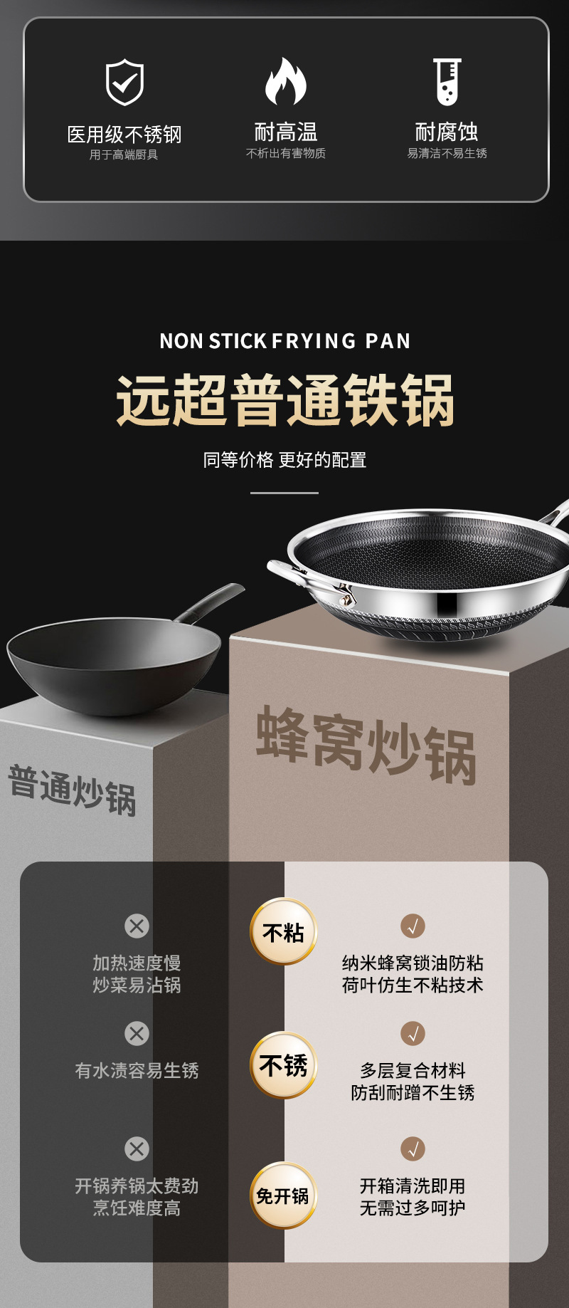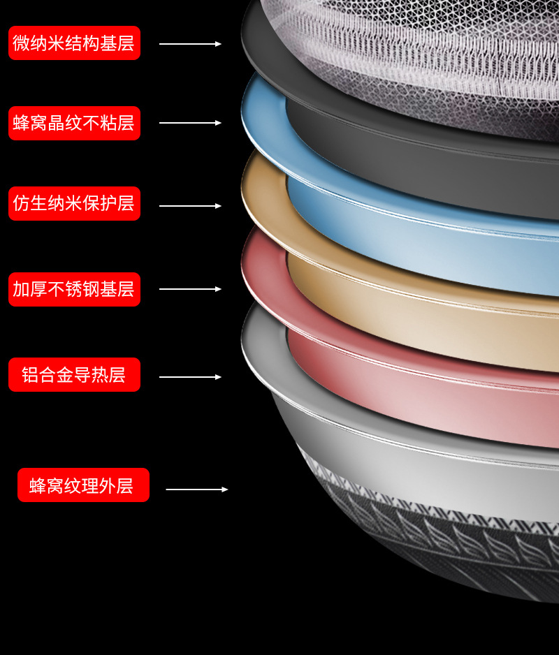 엄선된 316 스테인리스 스틸 프라이팬, 양면 벌집 무늬, 논스틱, 가정용, 인덕션 사용 가능, 튀김팬, 볶음팬