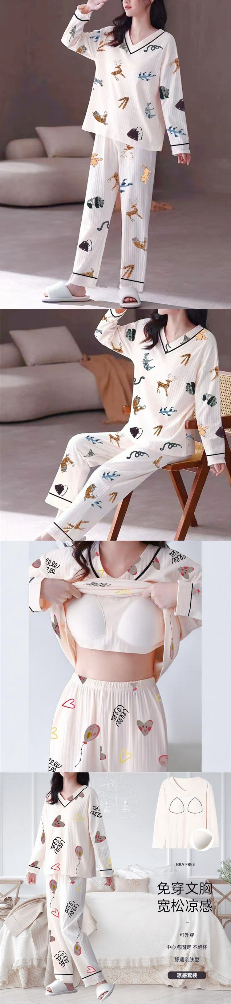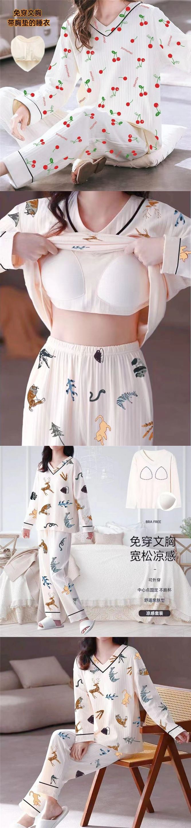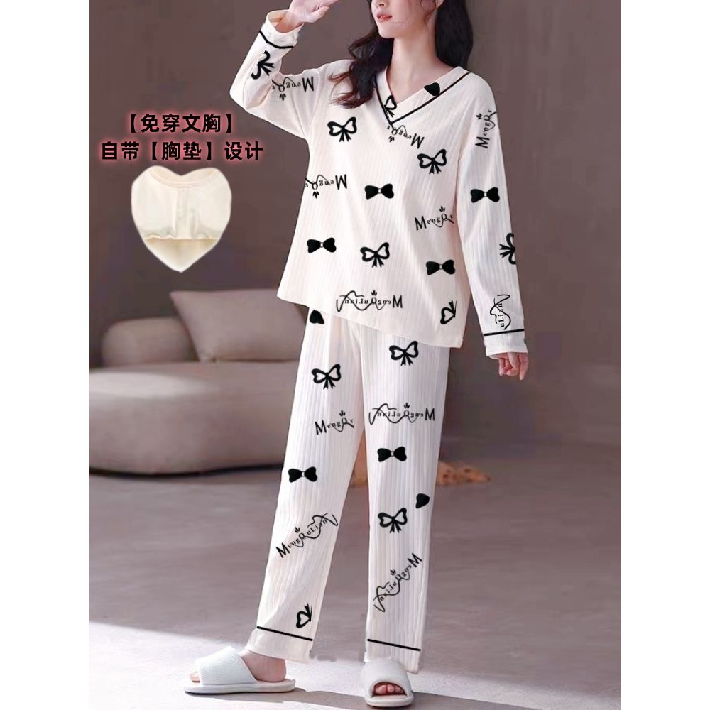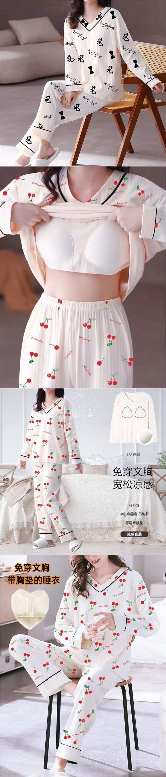 가을 봄과 가을을위한 가슴 패드가 달린 여성용 긴팔 잠옷 작은 여성을위한 Collared V 넥은 세트 위해 집 옷을 나갈 수 있습니다.