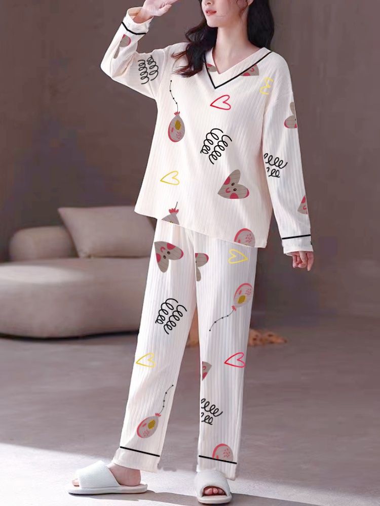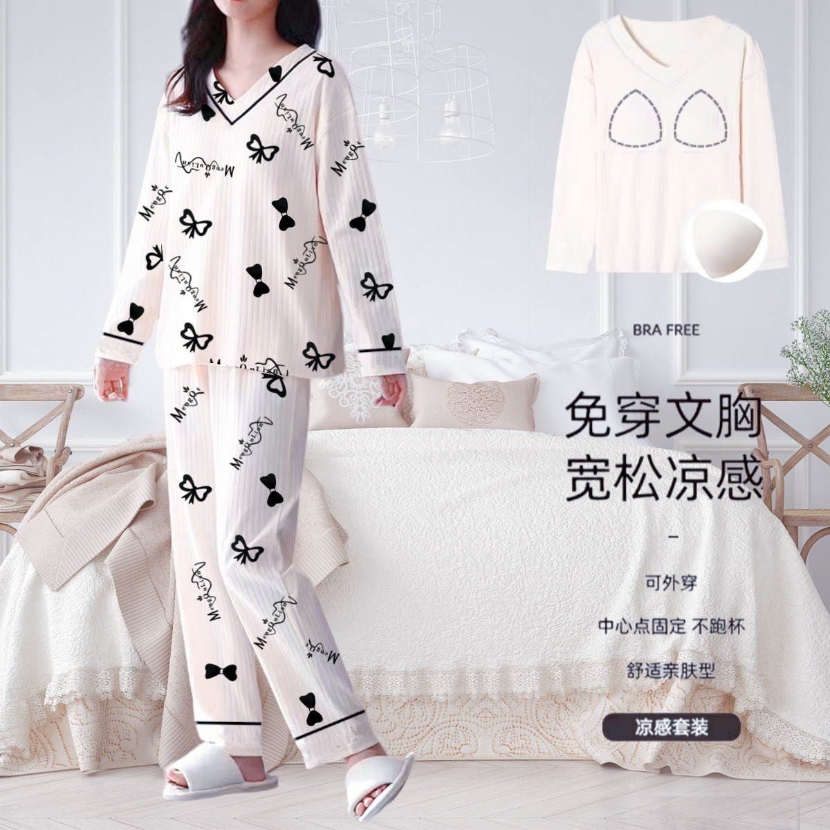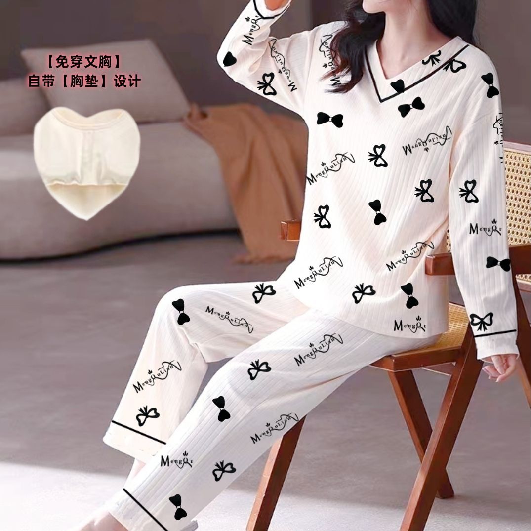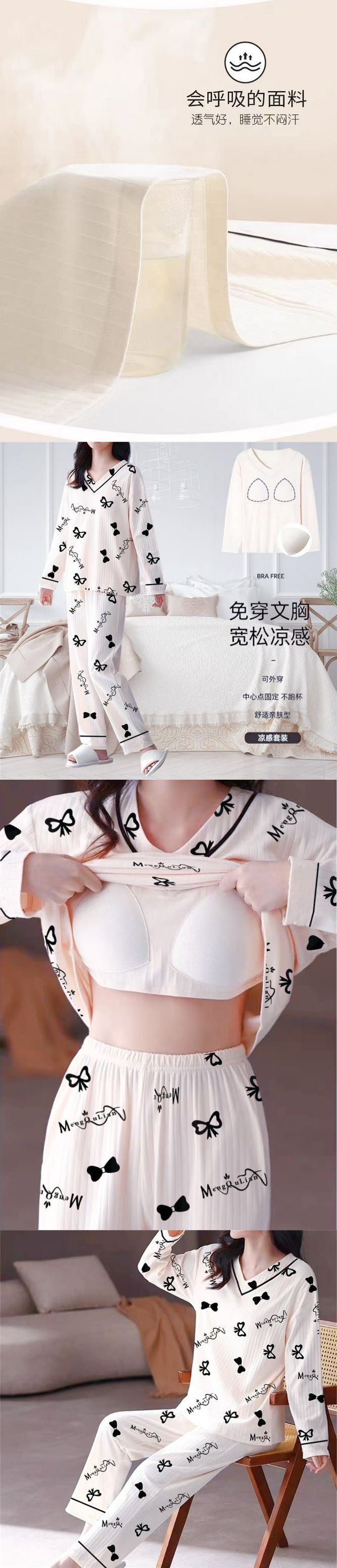 가을 봄과 가을을위한 가슴 패드가 달린 여성용 긴팔 잠옷 작은 여성을위한 Collared V 넥은 세트 위해 집 옷을 나갈 수 있습니다.
