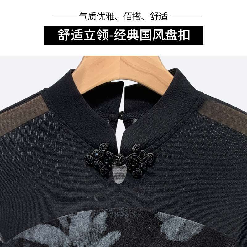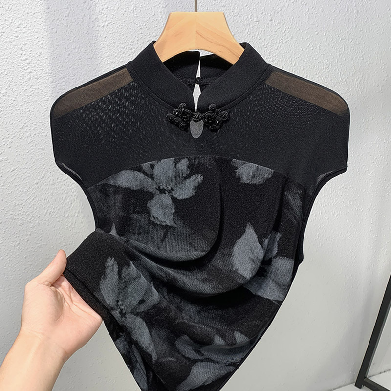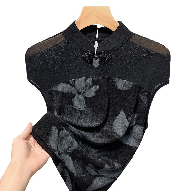 여성을위한 새로운 중국 스타일 국가 스타일 탑 2025 새로운 여성 인쇄 양복 조끼 스탠드 칼라 복고풍 작은 셔츠 패션 메쉬 티셔츠