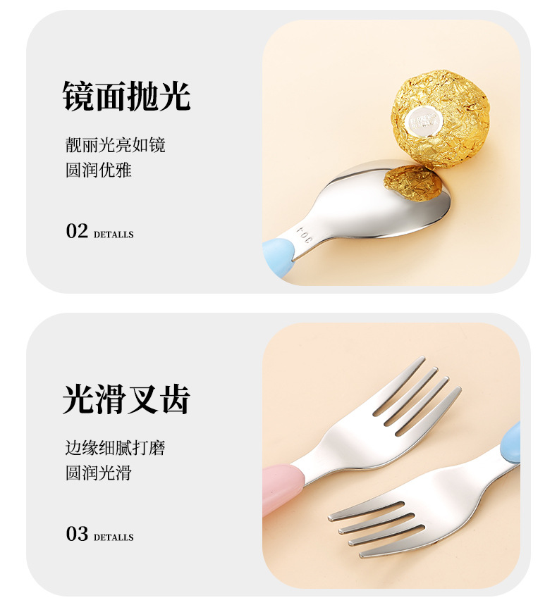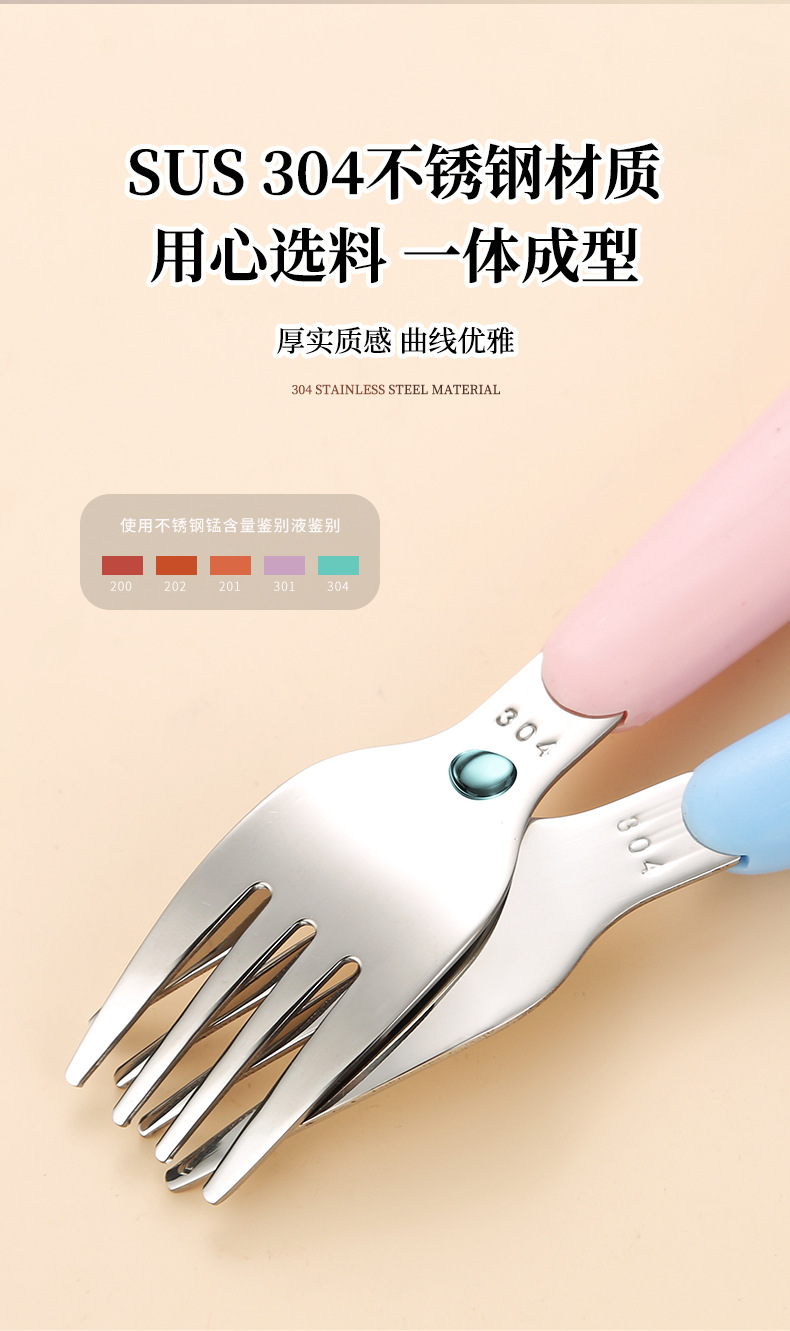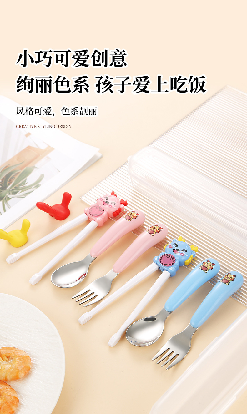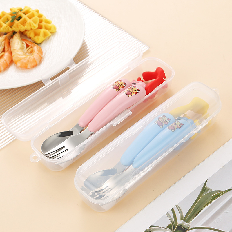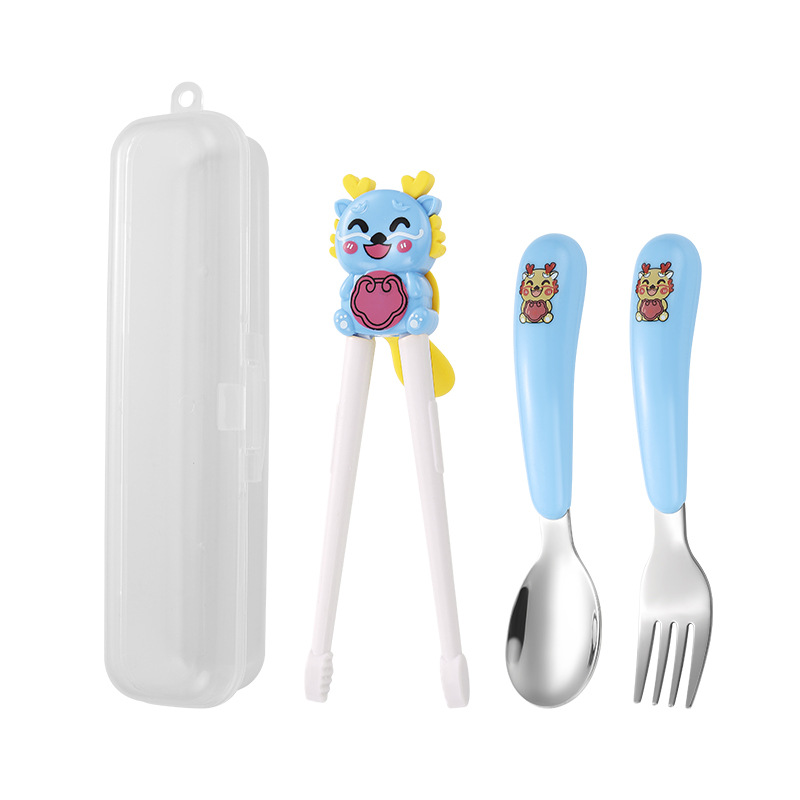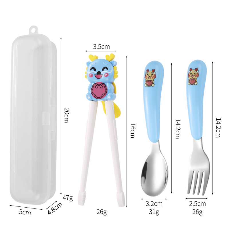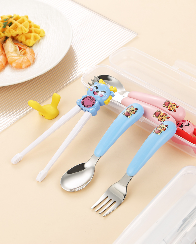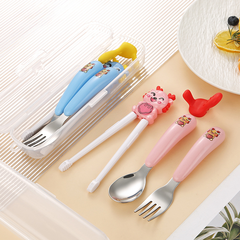 만화 샤오롱 304 스테인레스 스틸 어린이 휴대용 식기 세트 아기 먹는 숟가락 포크 훈련 젓가락
