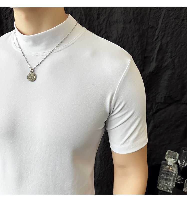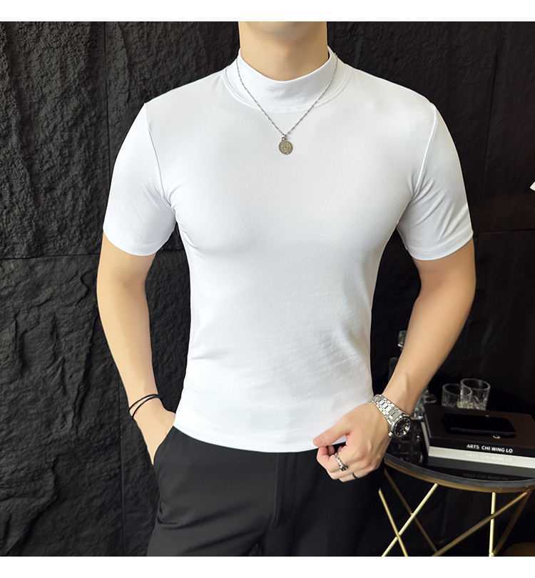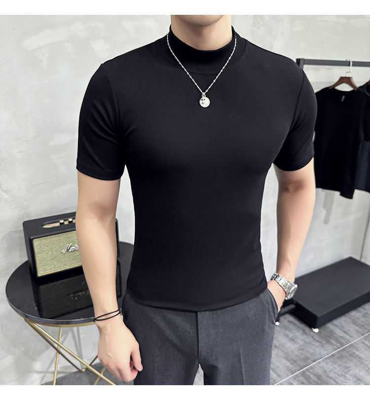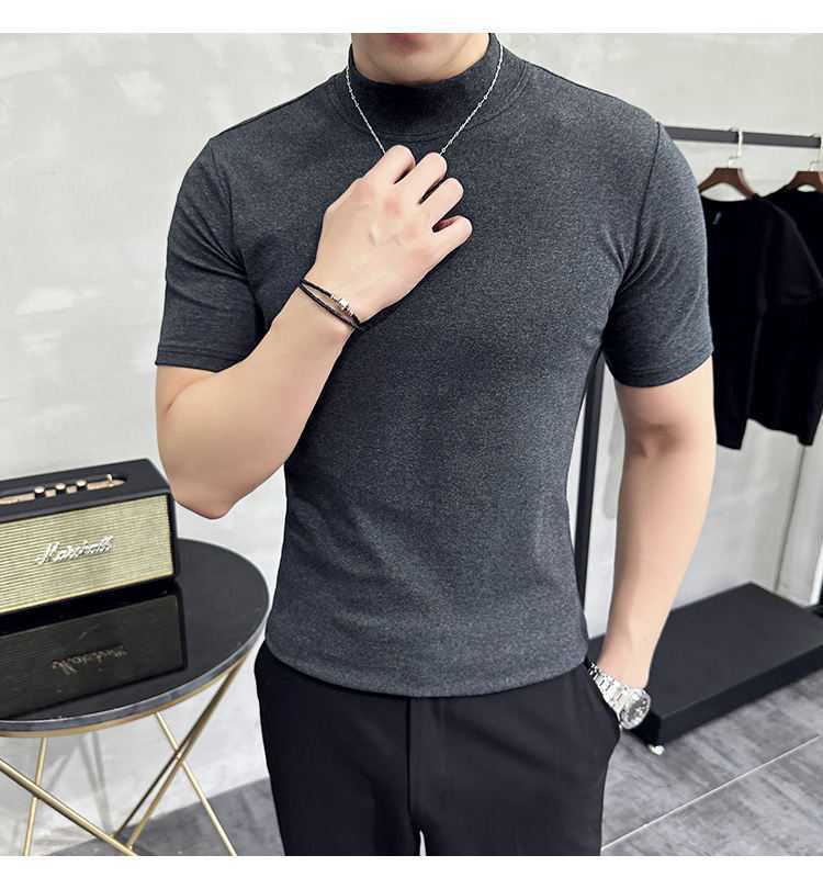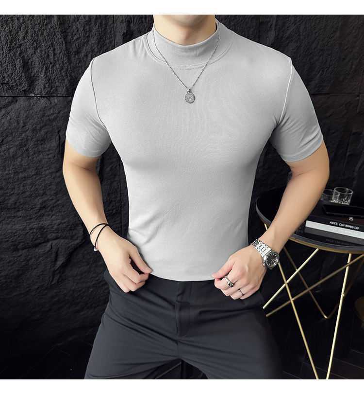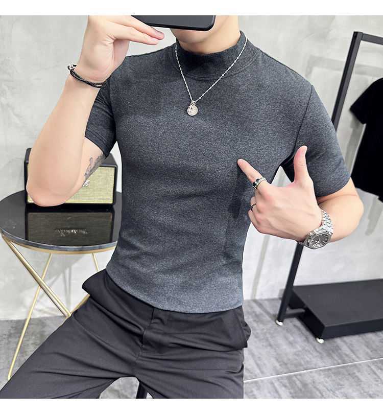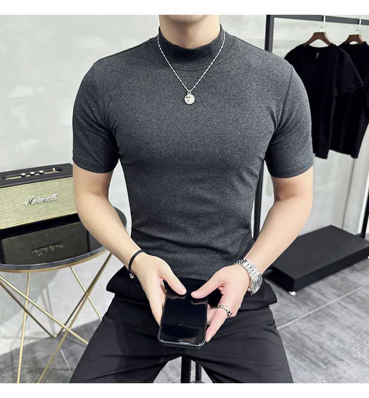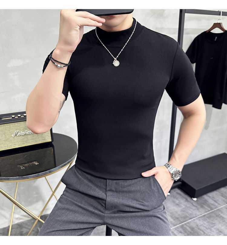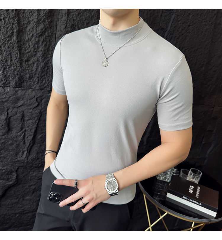 작은 터틀넥 티셔츠 남성용 짧은 소매 2024 년 봄과 가을 새로운 하이 엔드 느낌에 꼭 맞는 내부 스트레치 타이트한 목베이스 셔츠