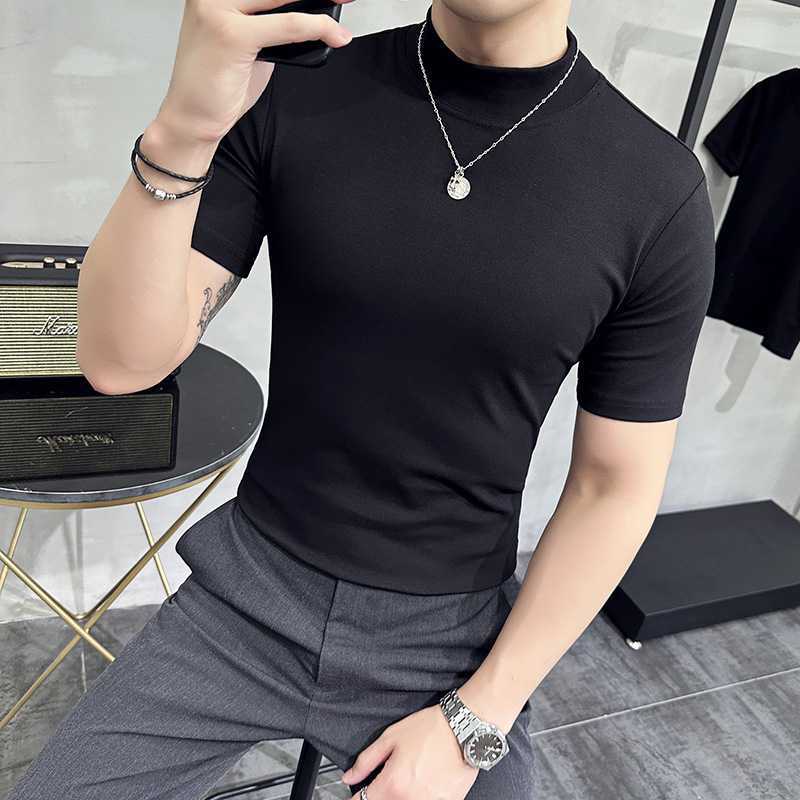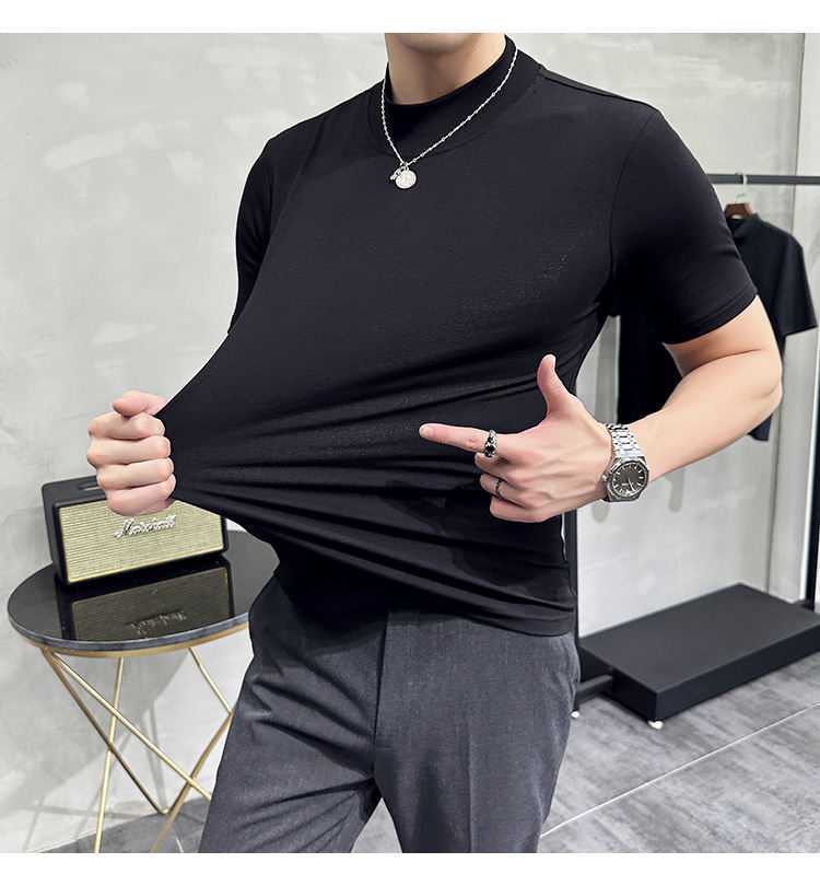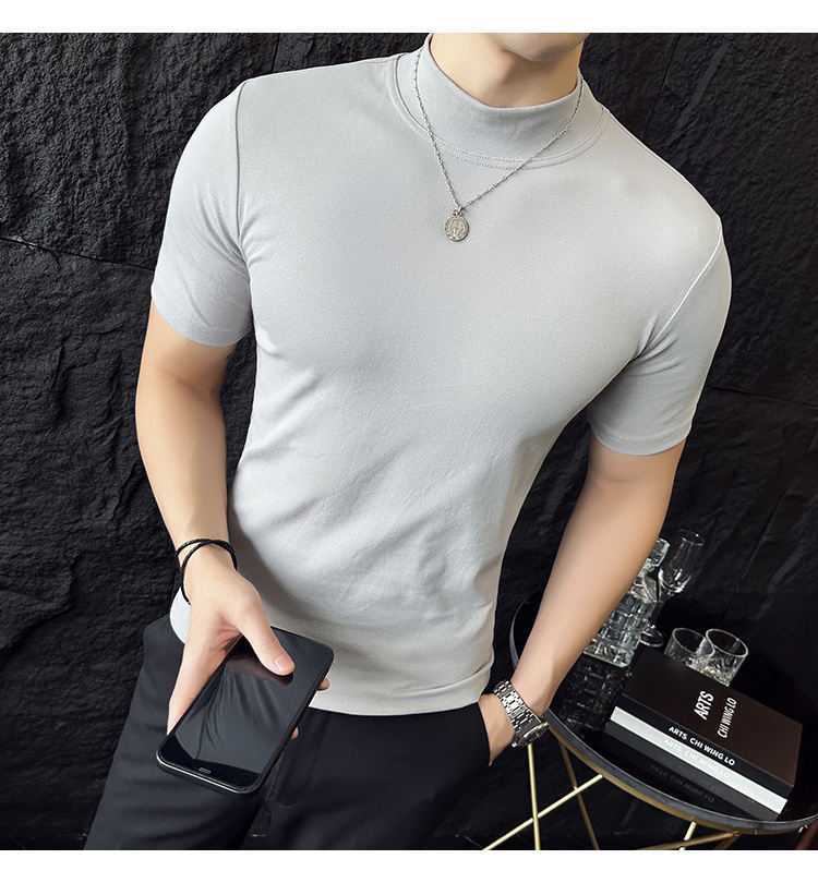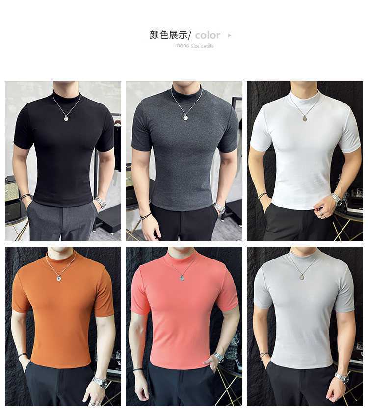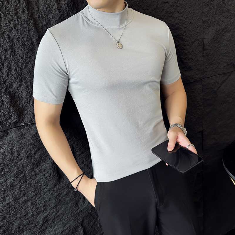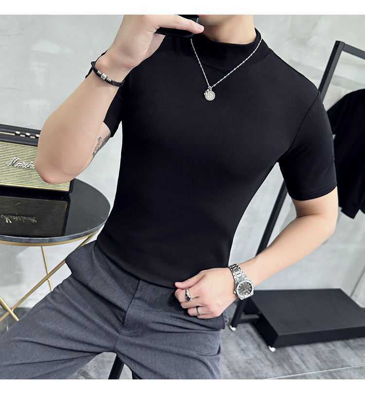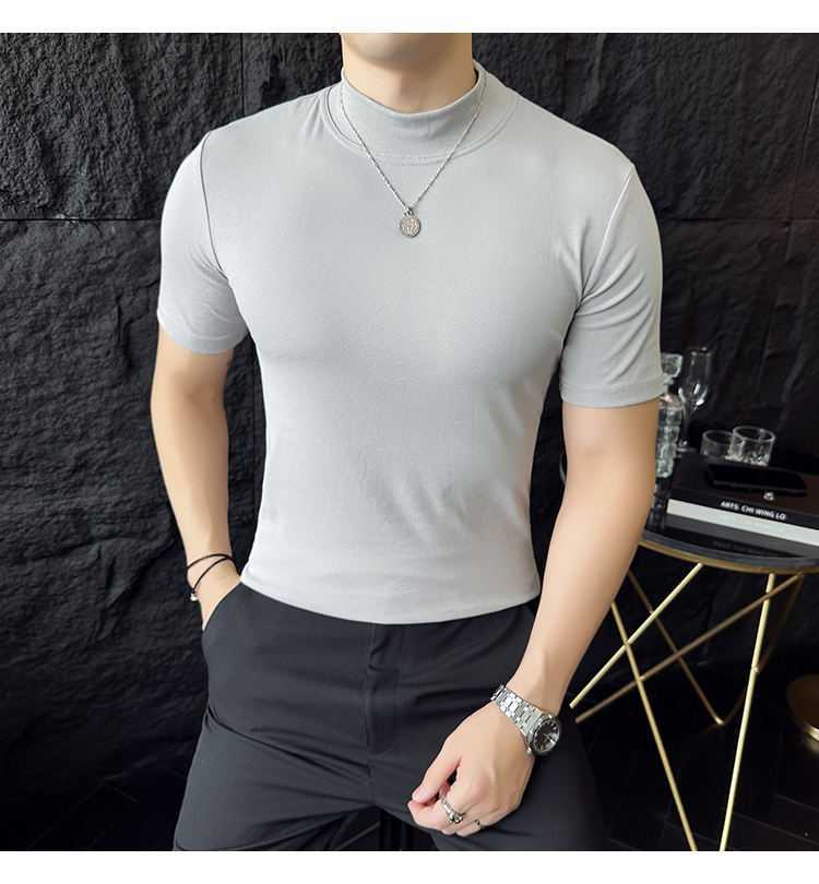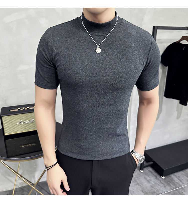 작은 터틀넥 티셔츠 남성용 짧은 소매 2024 년 봄과 가을 새로운 하이 엔드 느낌에 꼭 맞는 내부 스트레치 타이트한 목베이스 셔츠