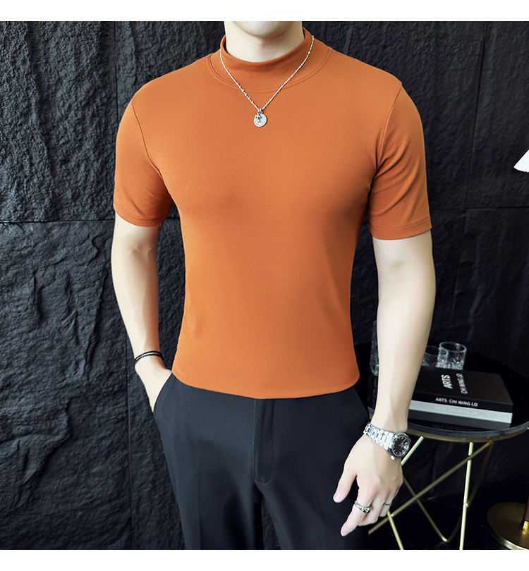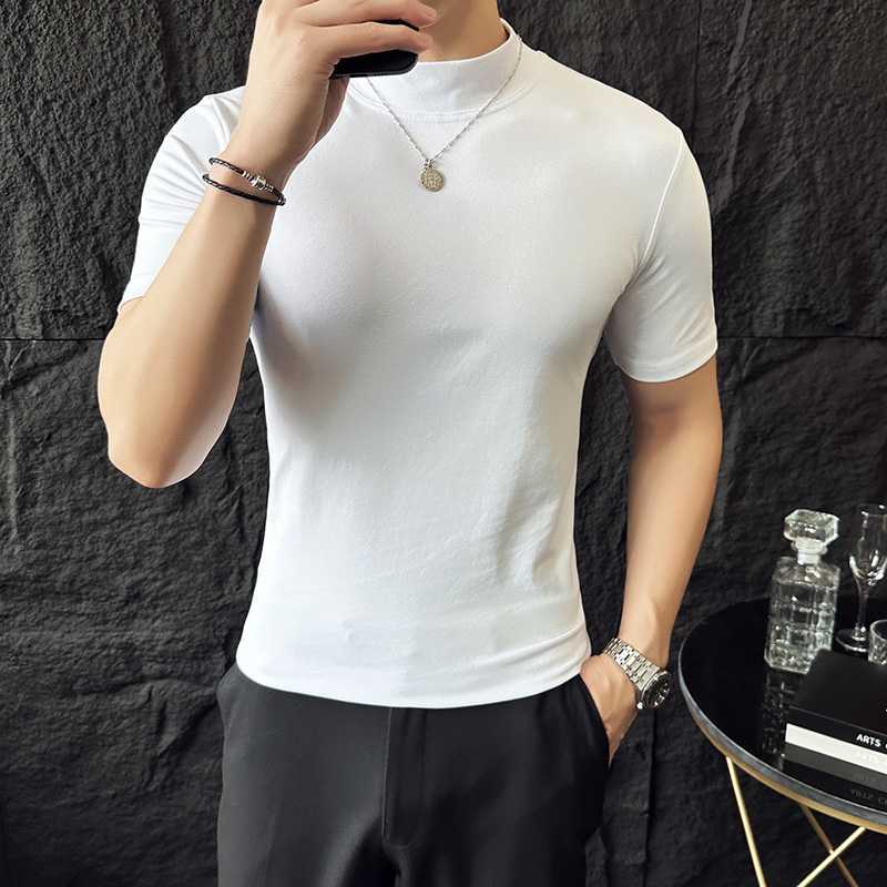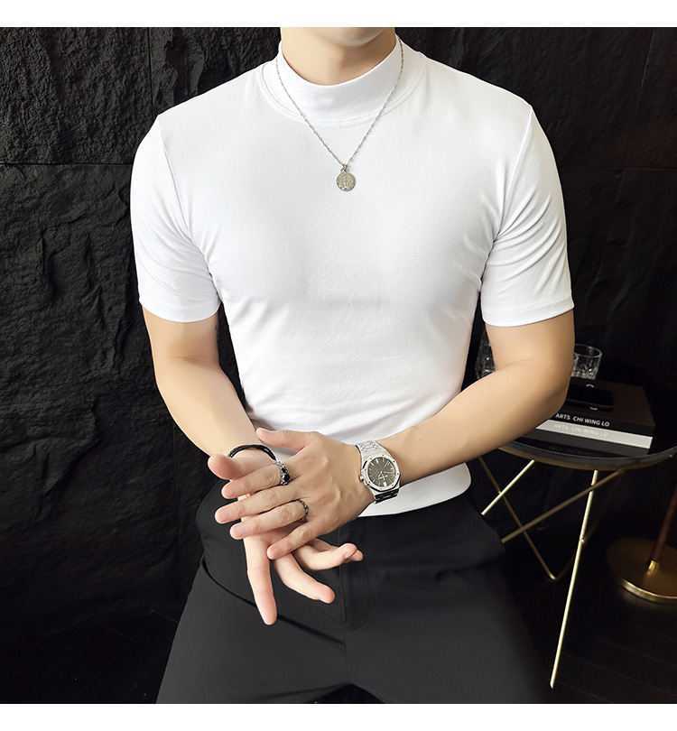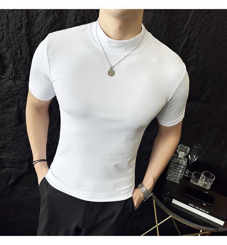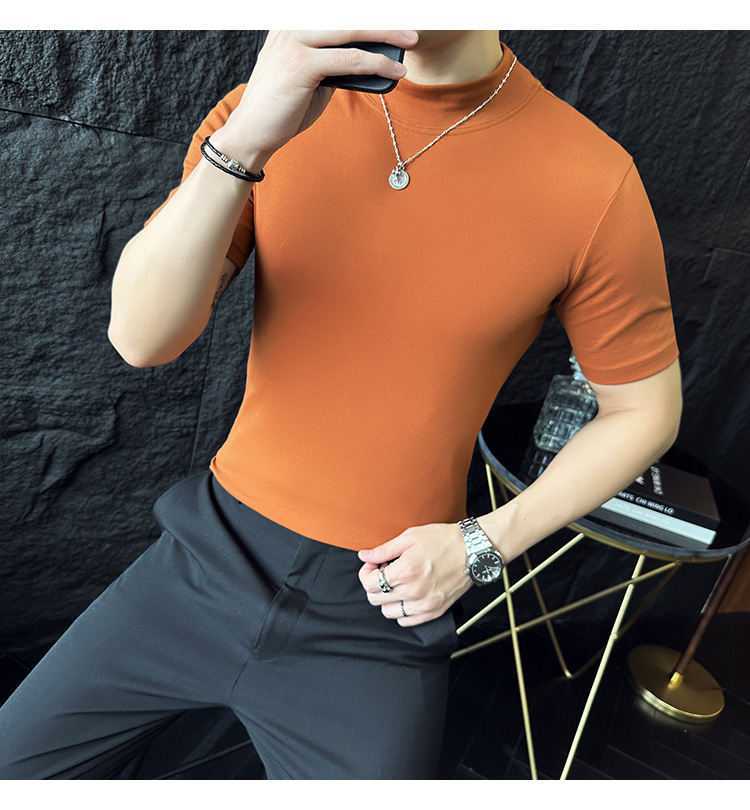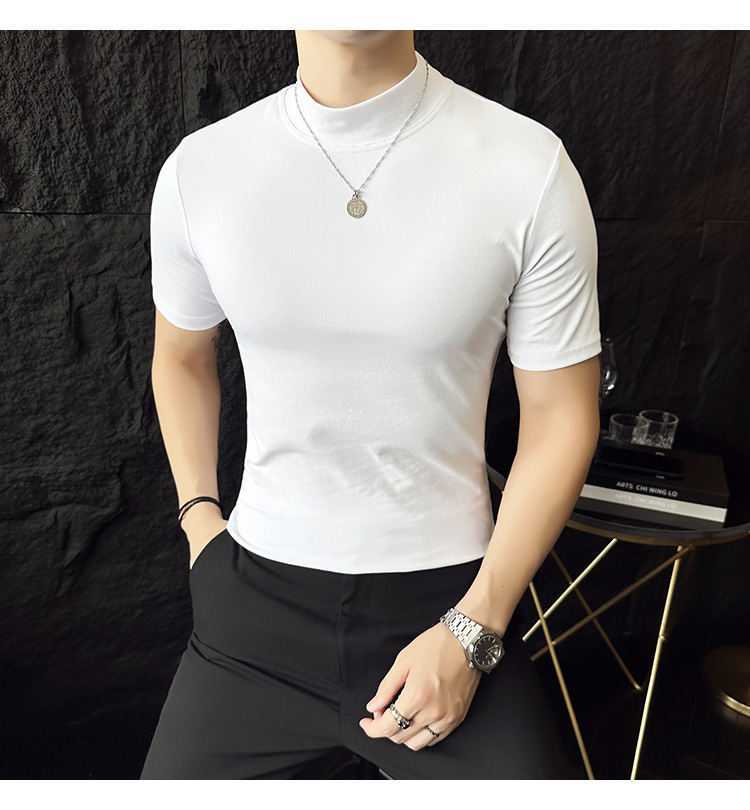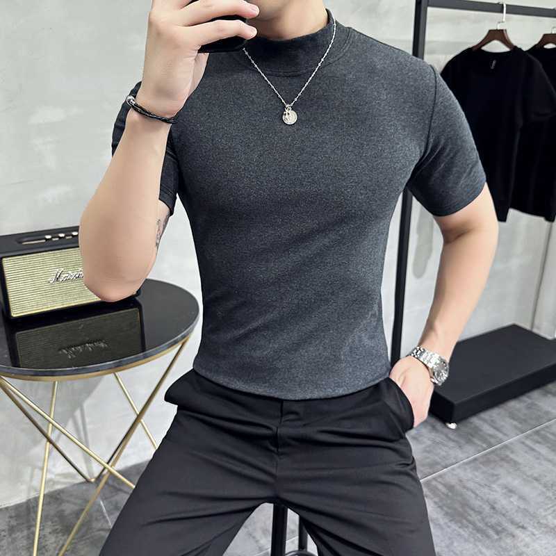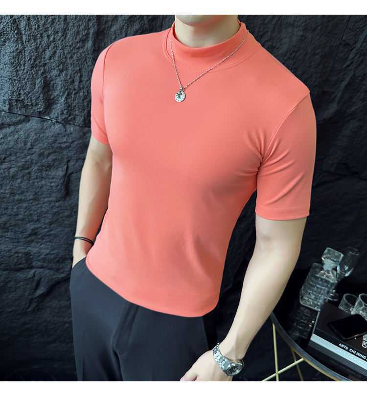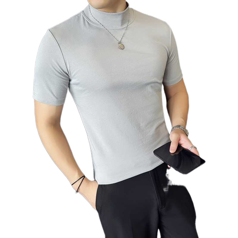작은 터틀넥 티셔츠 남성용 짧은 소매 2024 년 봄과 가을 새로운 하이 엔드 느낌에 꼭 맞는 내부 스트레치 타이트한 목베이스 셔츠