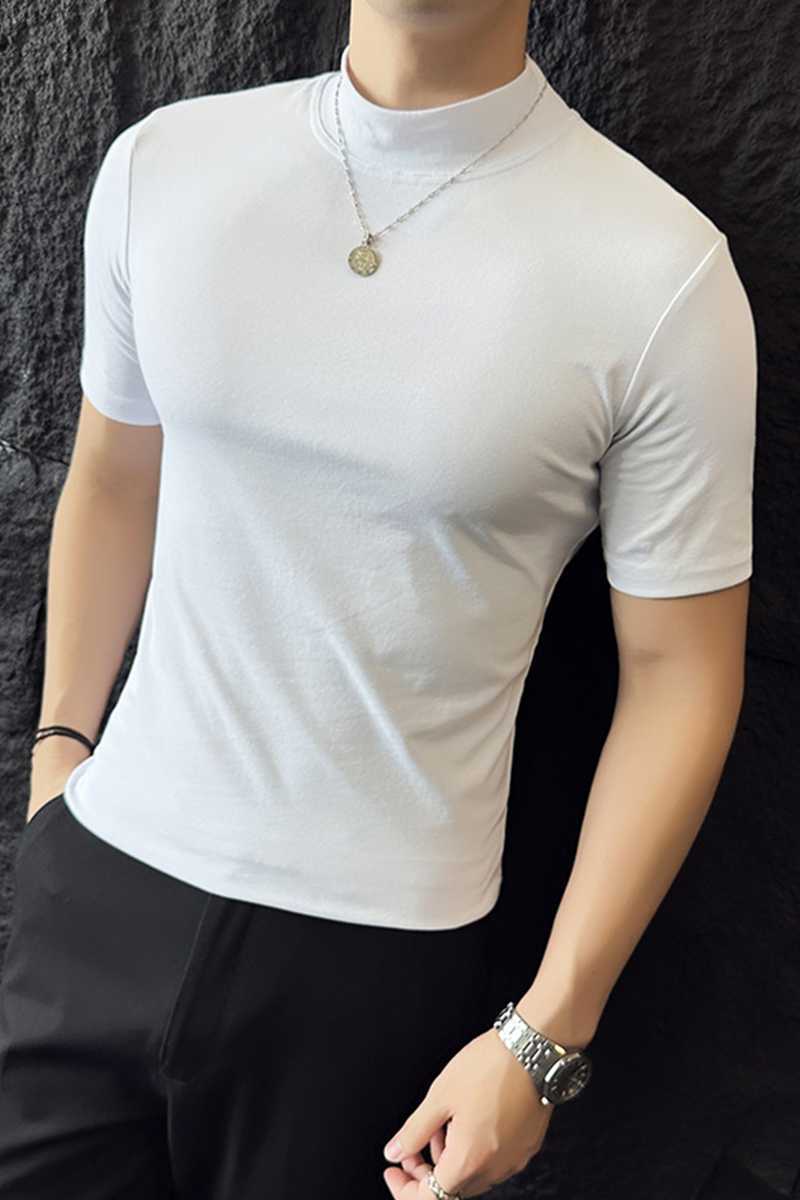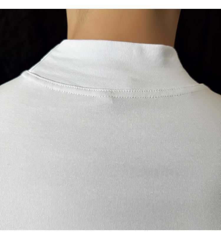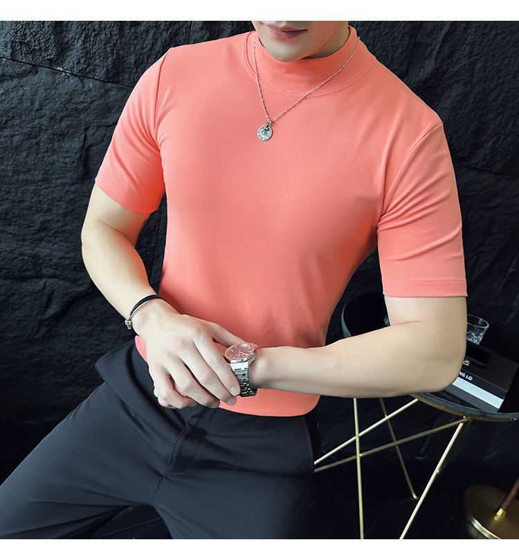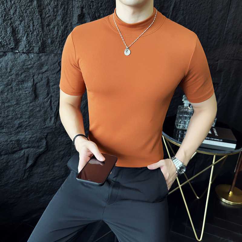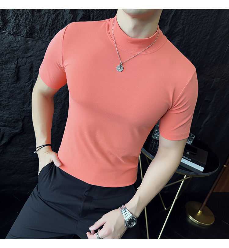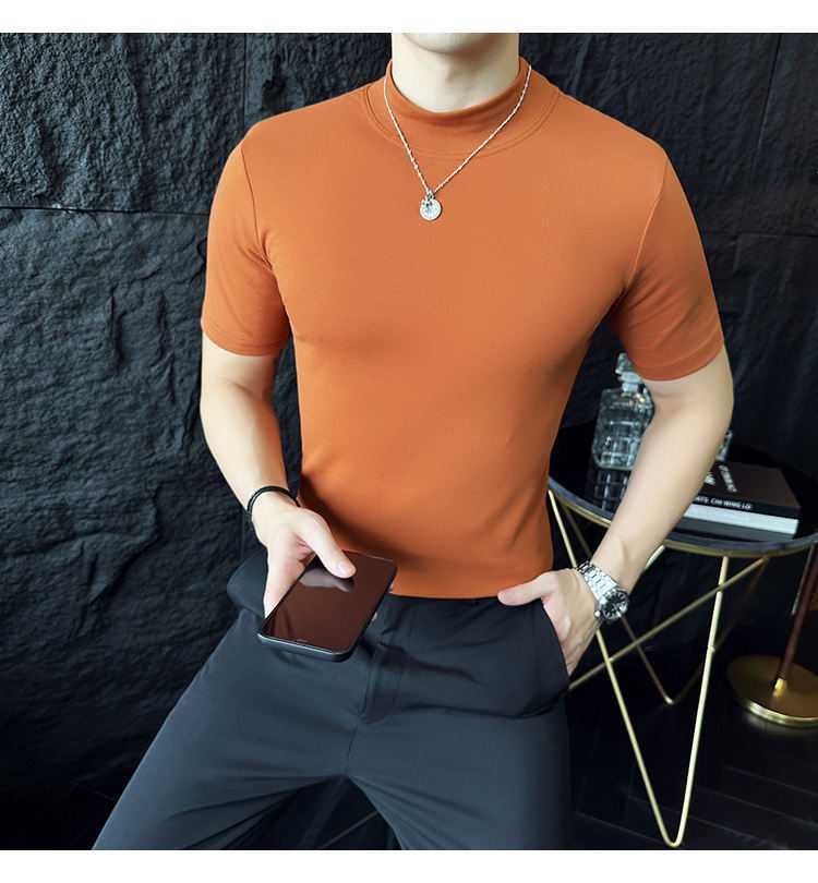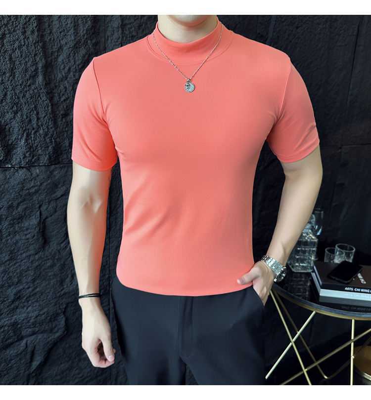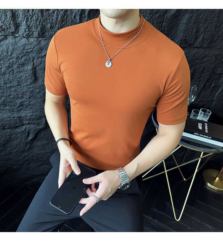 작은 터틀넥 티셔츠 남성용 짧은 소매 2024 년 봄과 가을 새로운 하이 엔드 느낌에 꼭 맞는 내부 스트레치 타이트한 목베이스 셔츠
