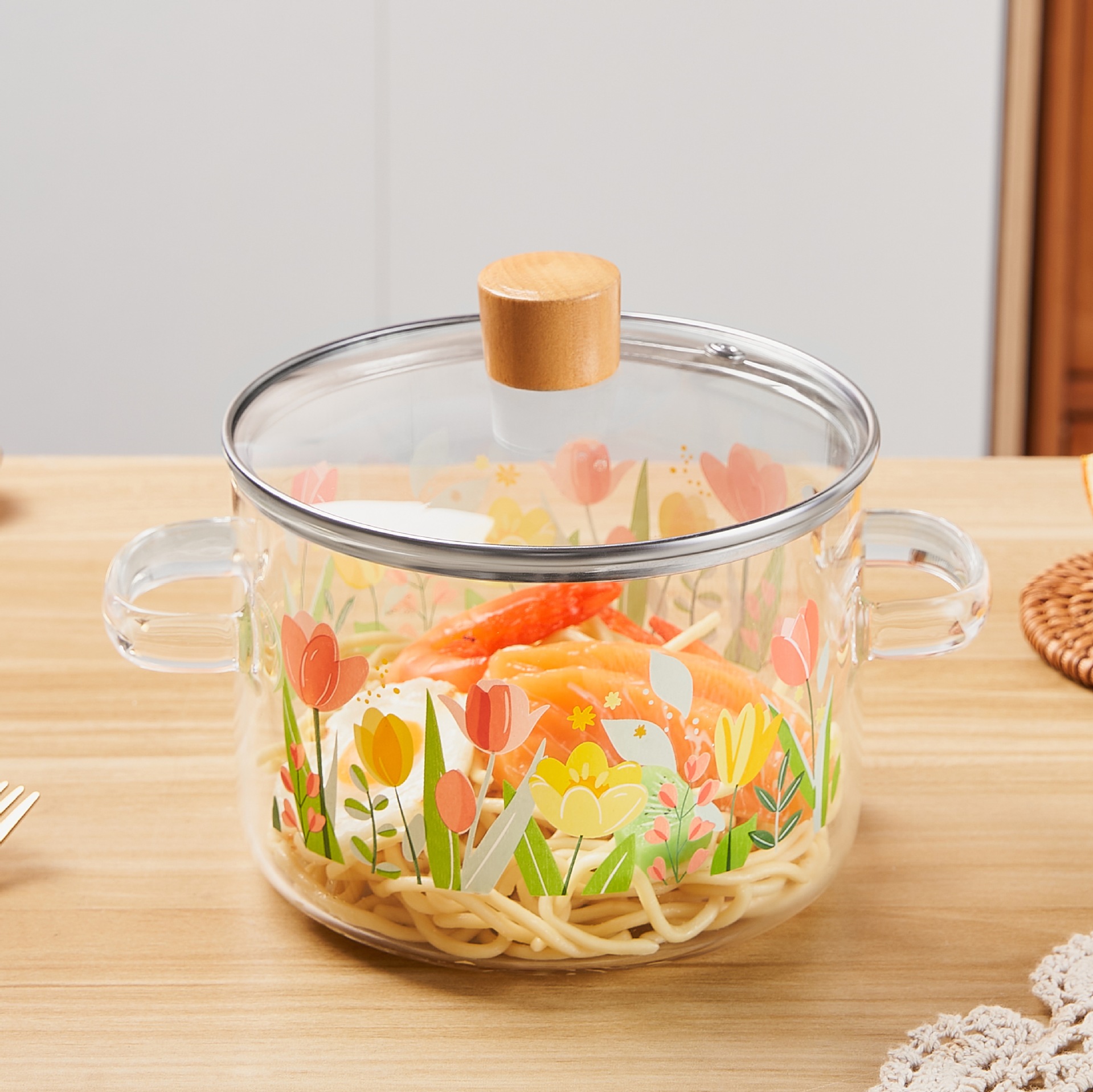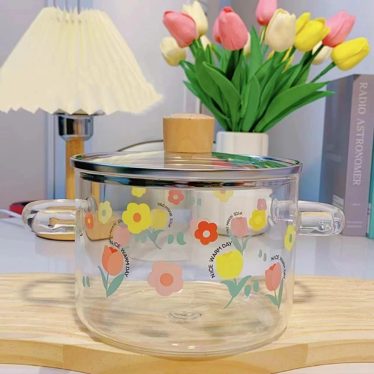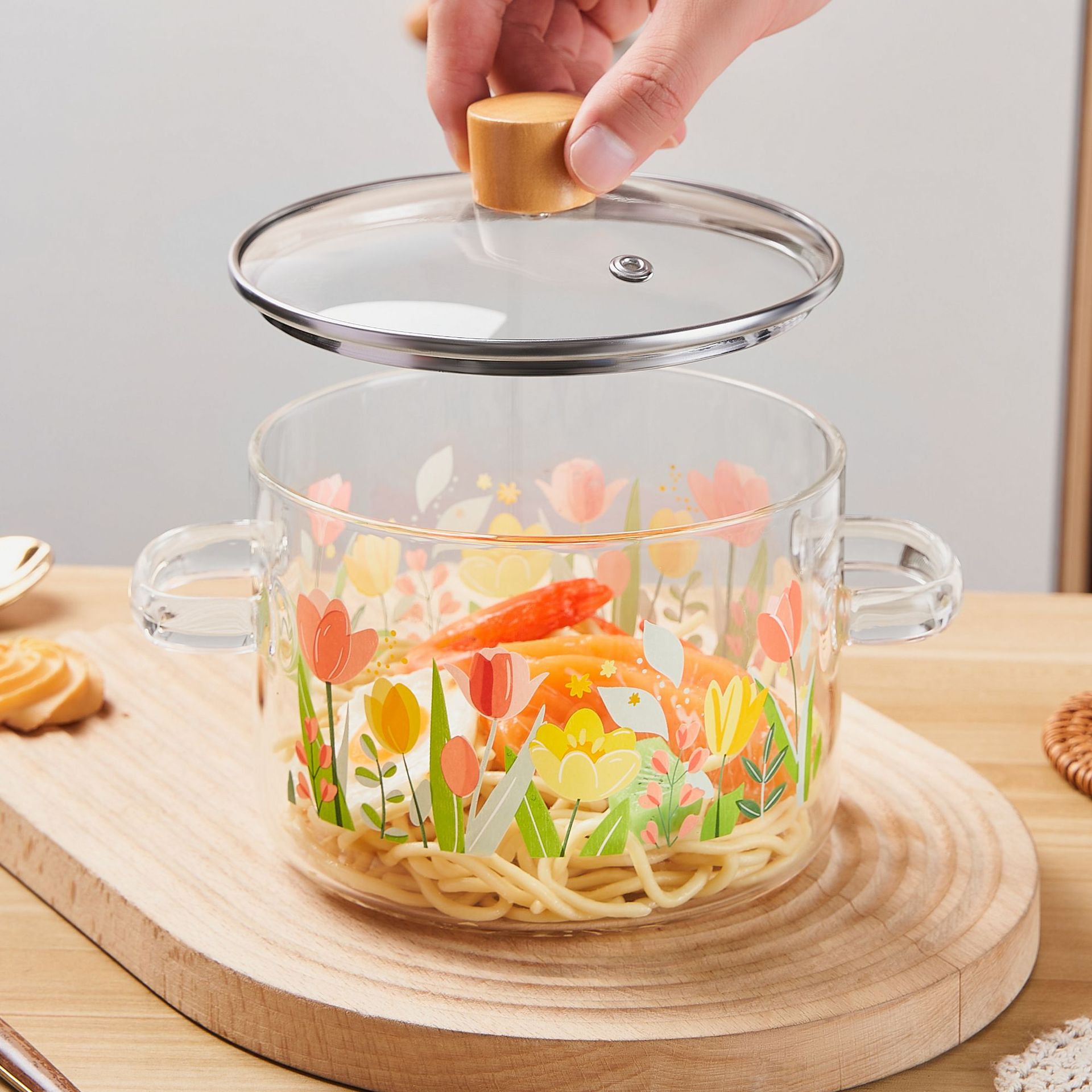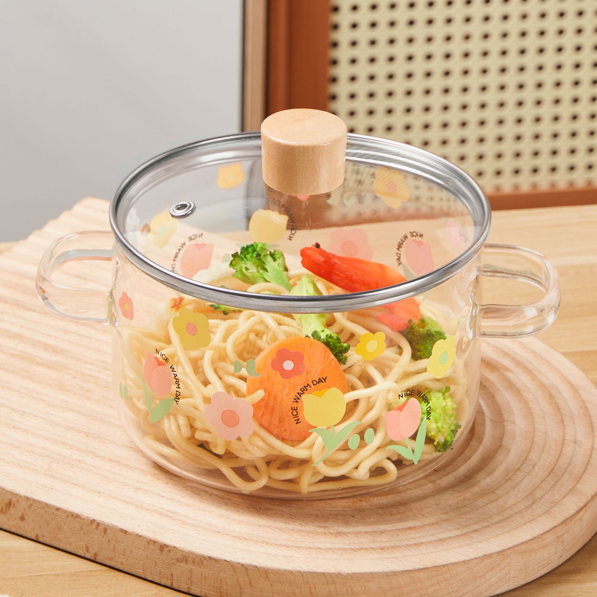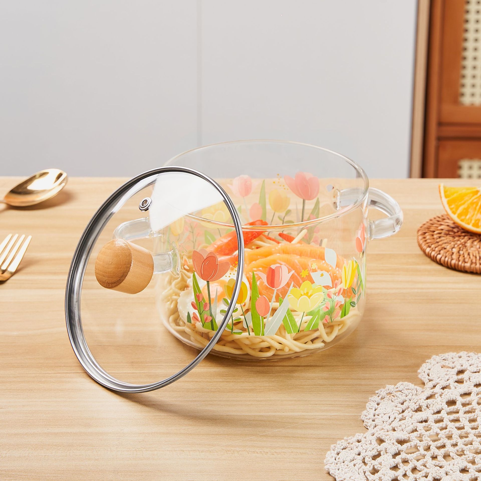 큰 기숙사 국수 수프 냄비를 요리하기위한 뚜껑이 달린 튤립 대용량 고용량 이중 귀 오픈 불꽃 유리 내열성 인스턴트 국수 그릇