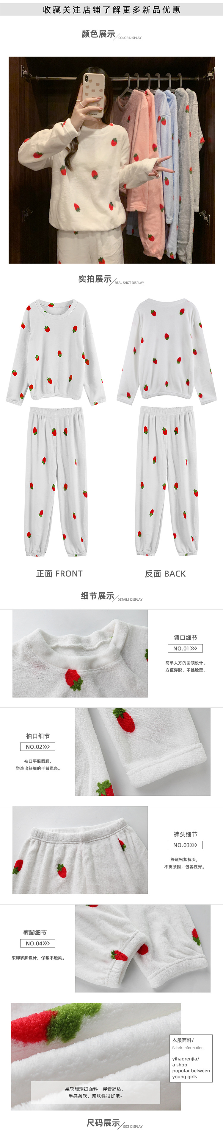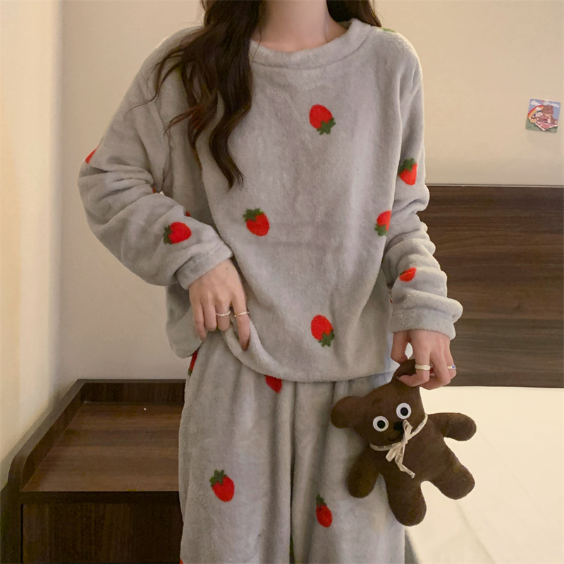 산호 양털 잠옷 여성의 겨울 귀여운 딸기 기모 두꺼운 따뜻한 플란넬 2023 새 홈 의류 세트