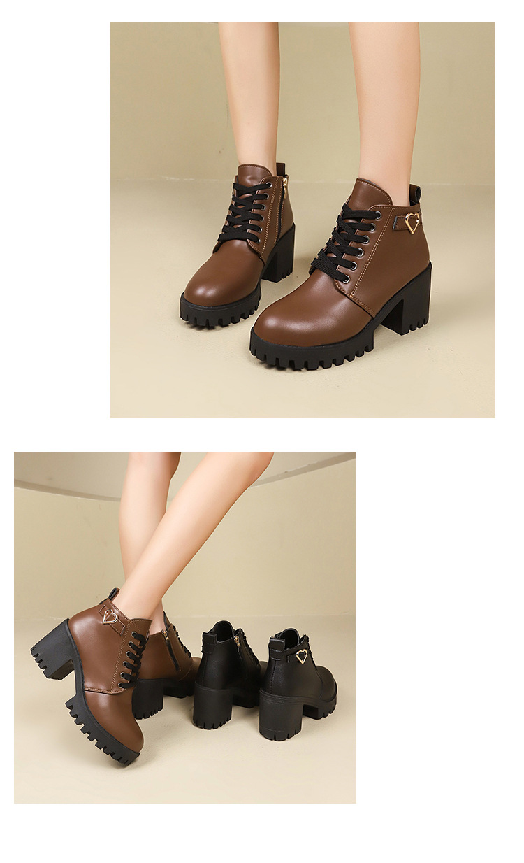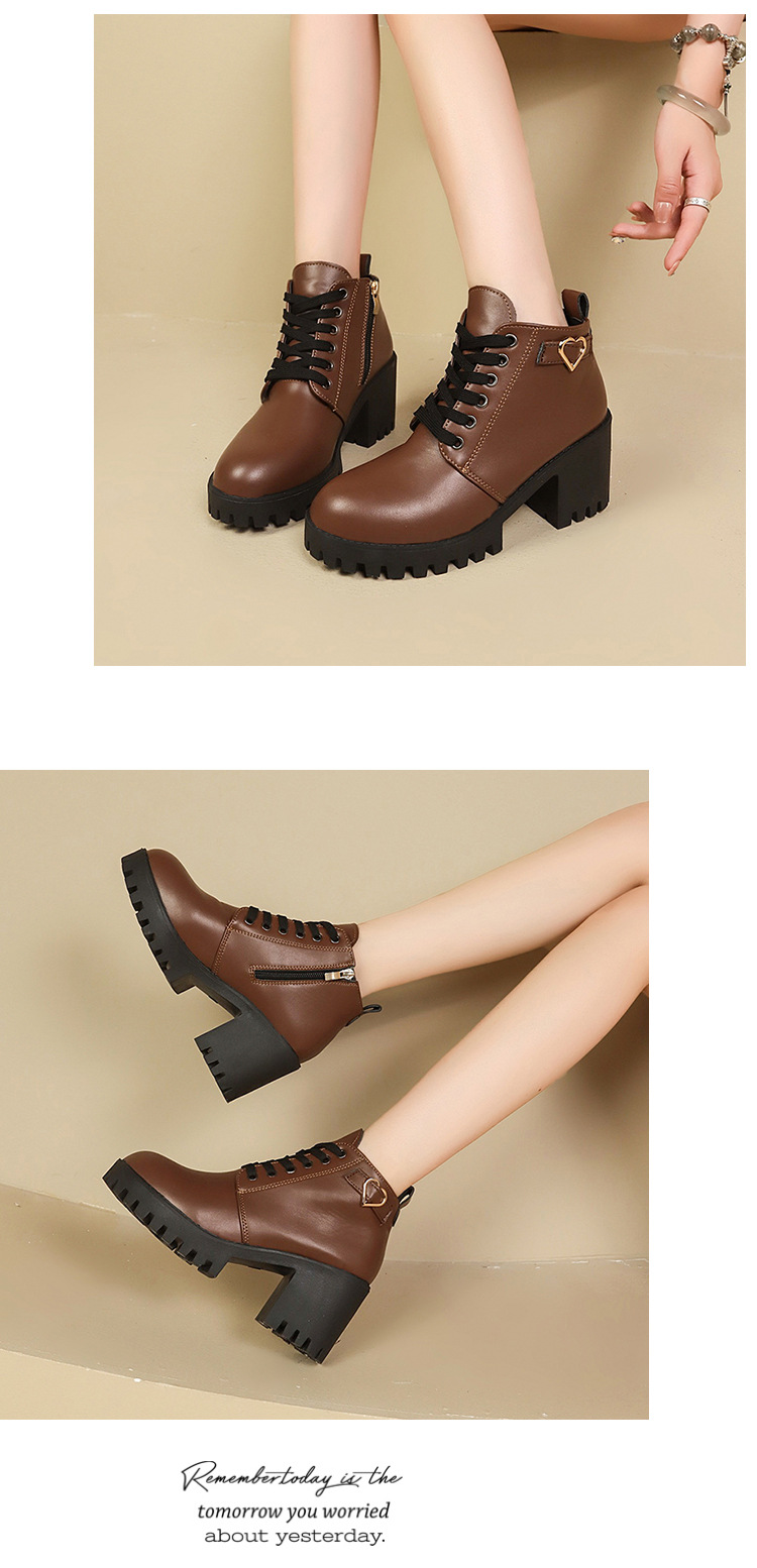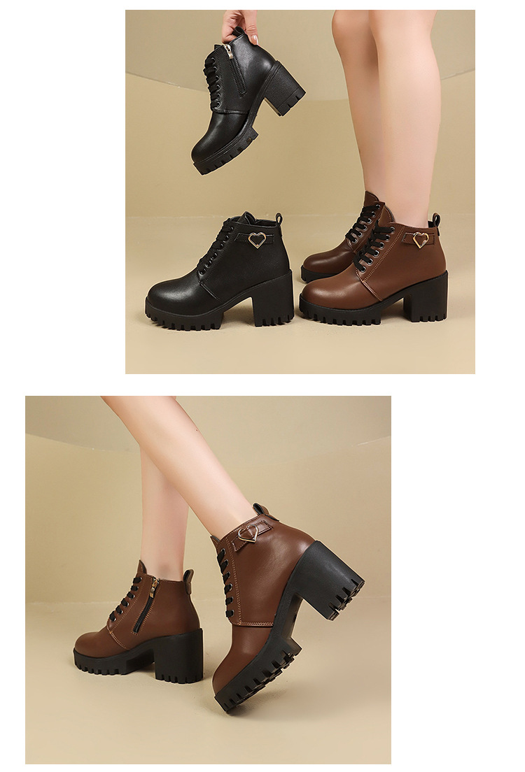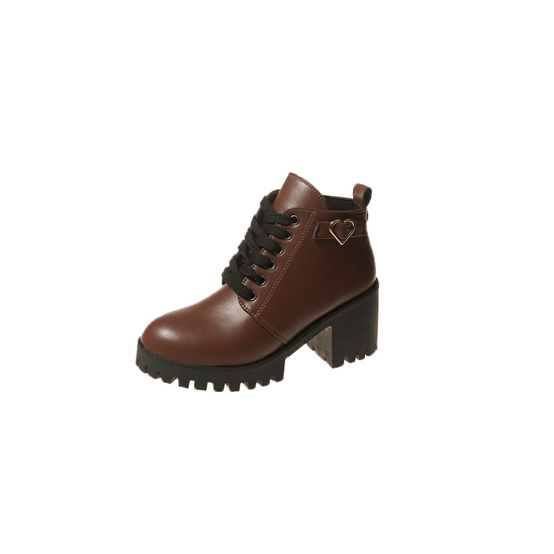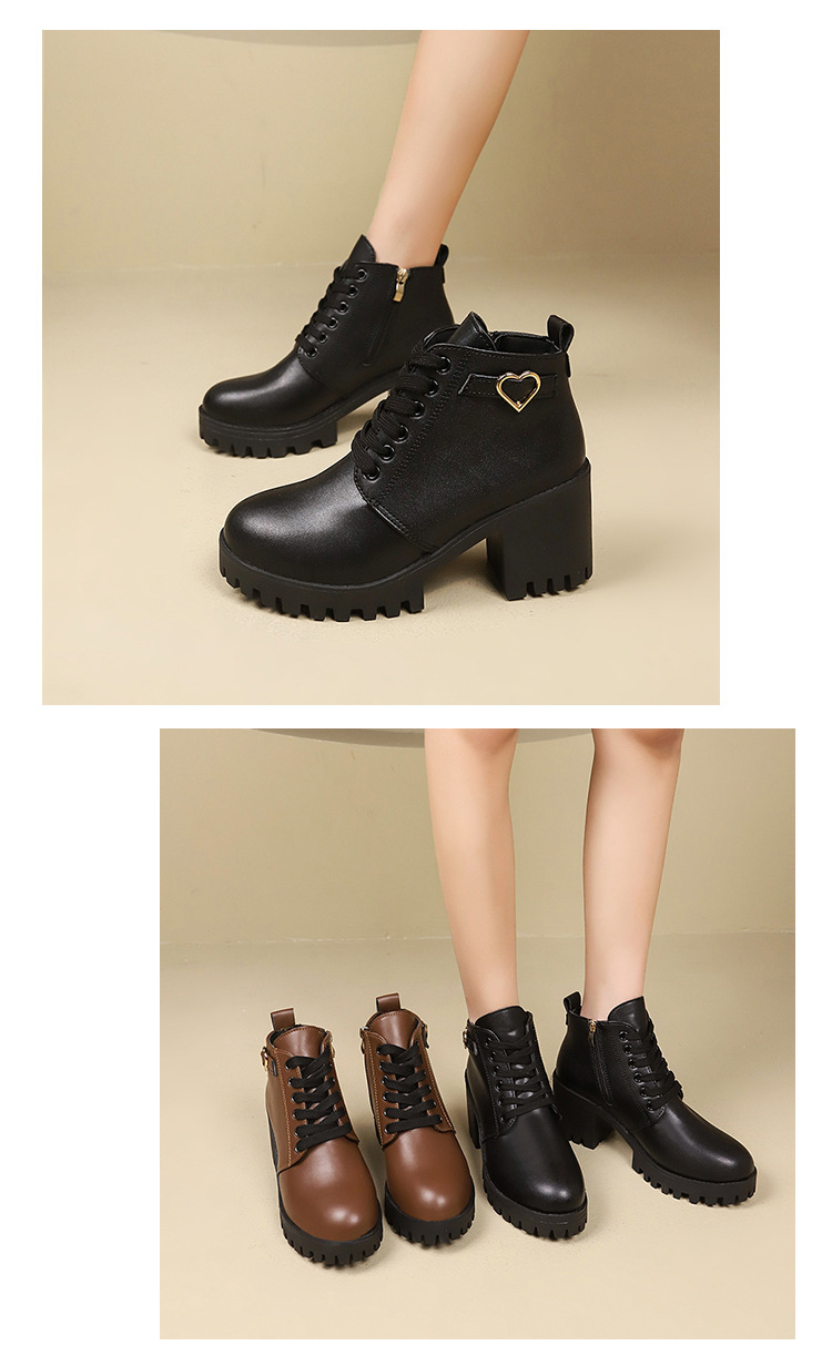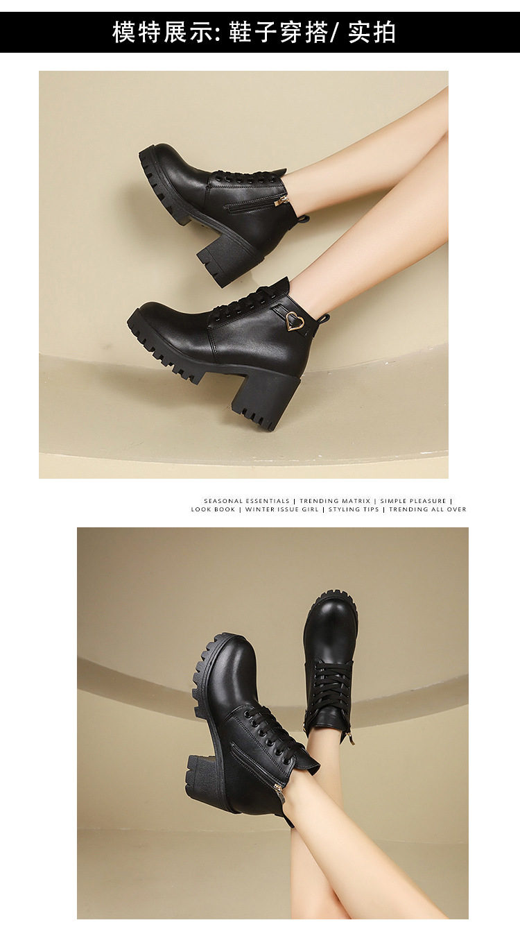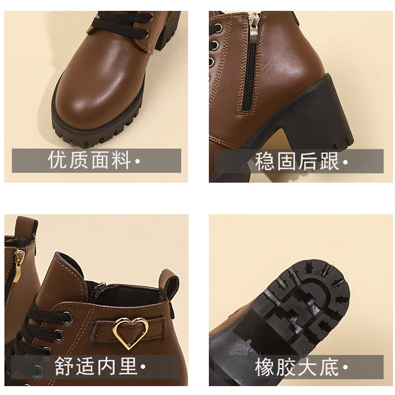 2026 가을 겨울 신상 하이힐 두꺼운 굽 가죽 벨트 장식 여성 부츠 한국 스타일 라운드 토 마틴 부츠 사이드 지퍼 숏부츠 여성용