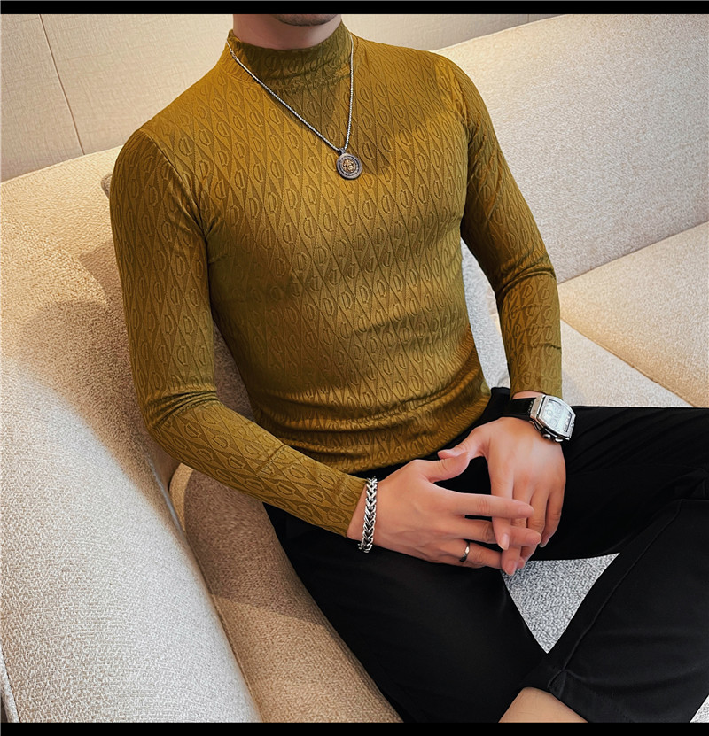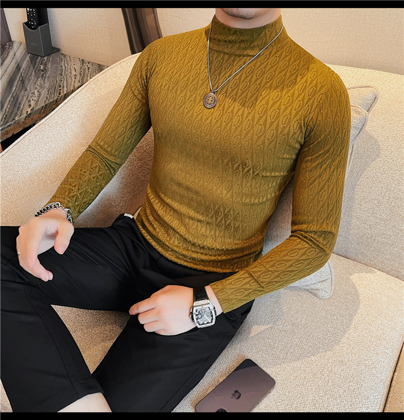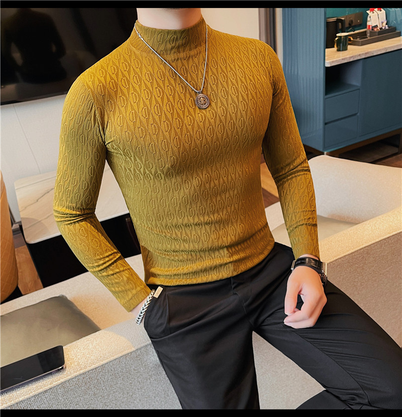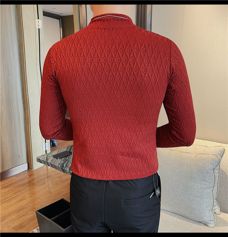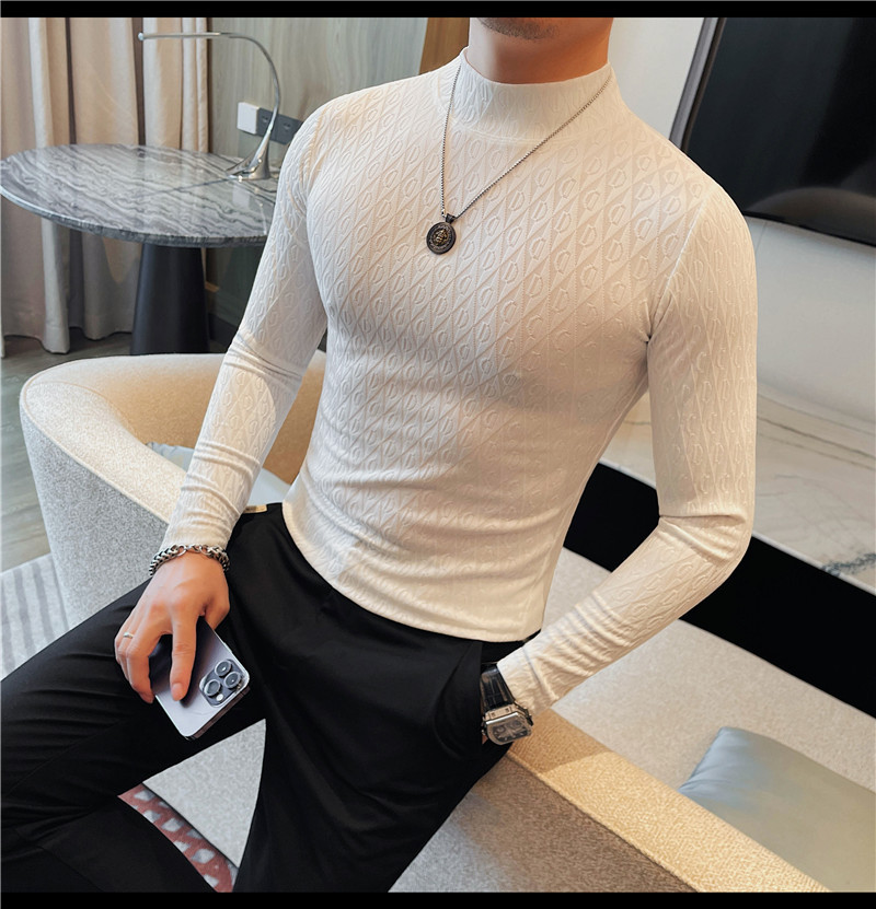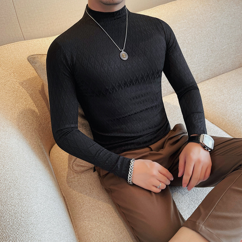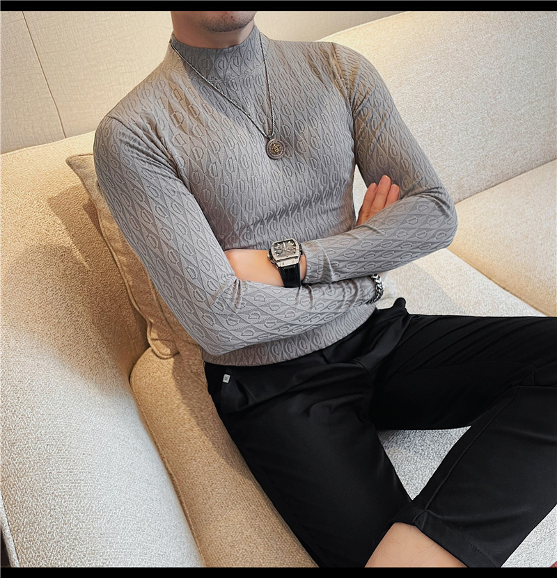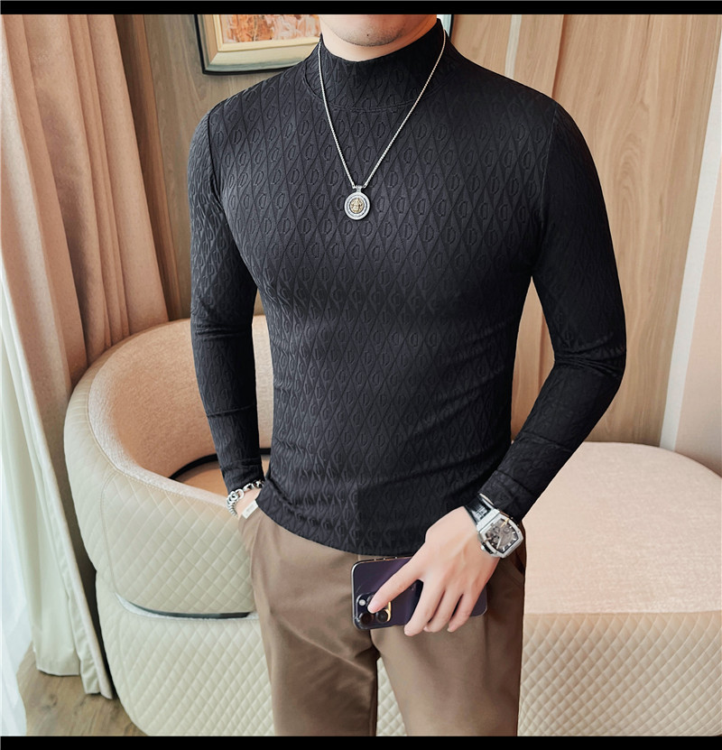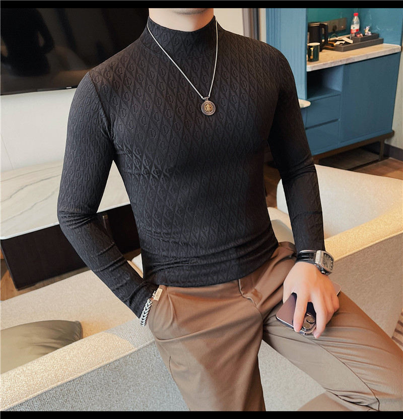 남성용 신형 미드 칼라 긴팔 티셔츠 슬림 한국 바닥 셔츠 하이 센스 체크 무늬 2024 가을 의류