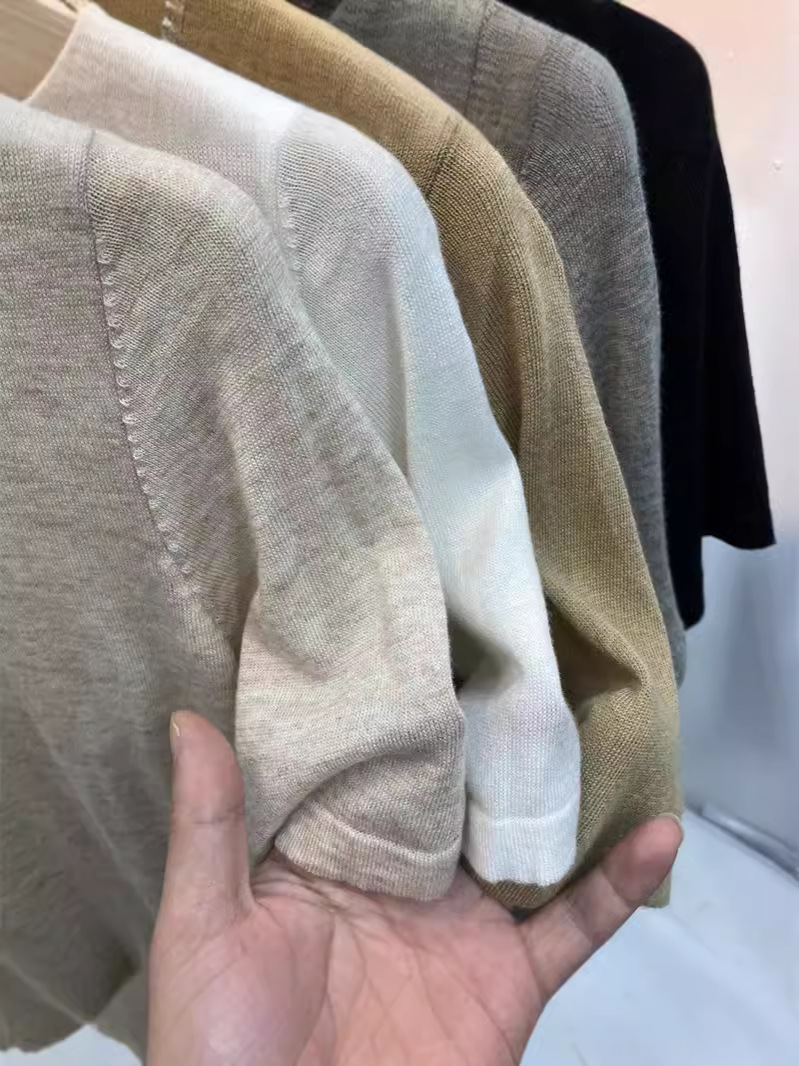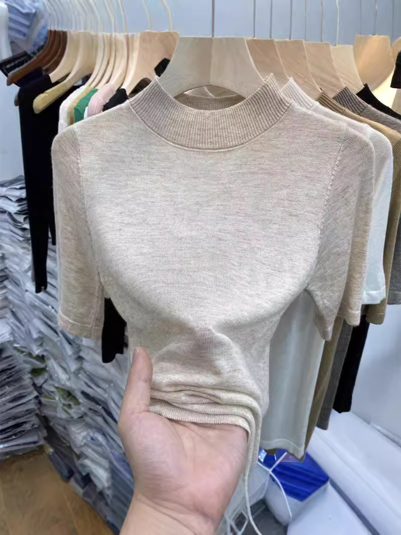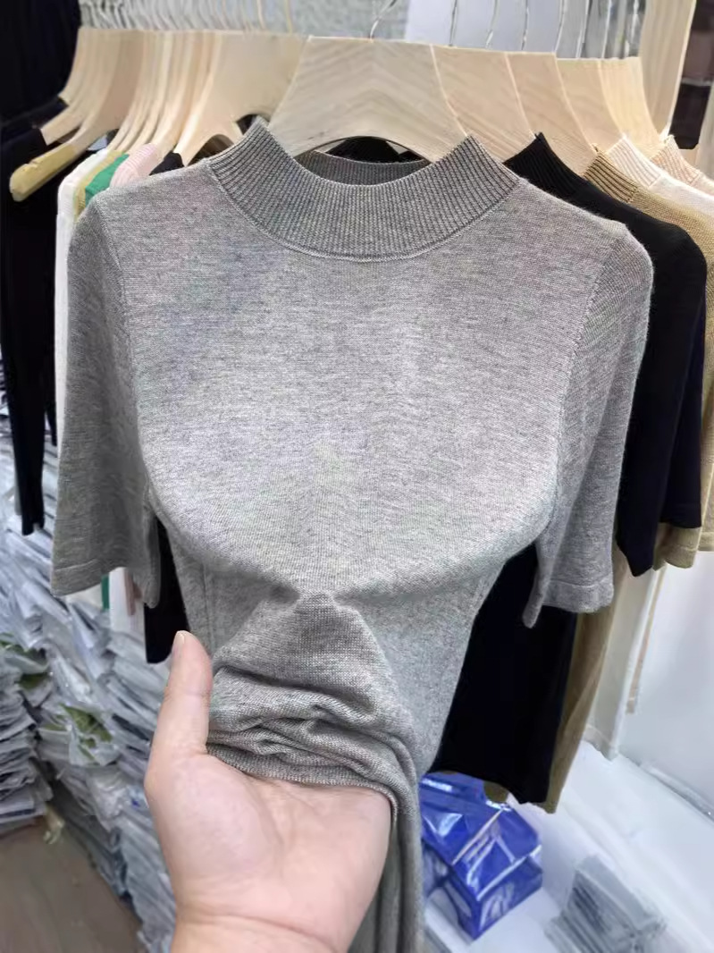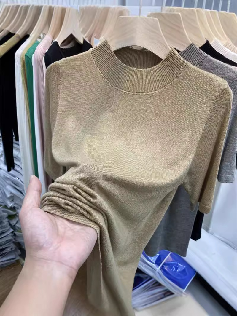 봄 여름 여성용 부드럽고 볼이 없는 미드 슬리브 스웨터 얇은 슬림 핏 하프 터틀넥 티셔츠 다용도 5부 소매 탑