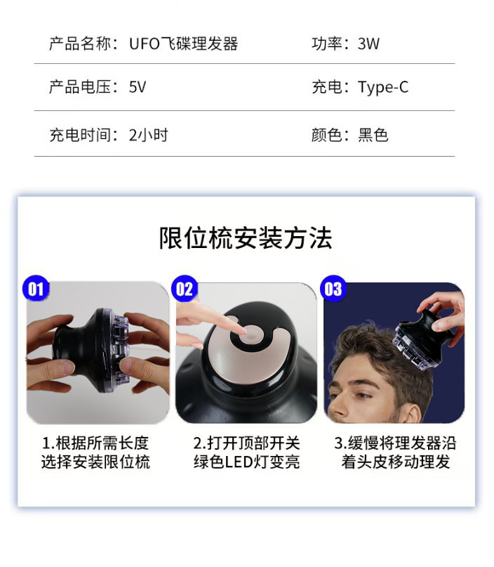产品配件:彩盒包装+说明书(中英文)+限位梳*2(1号3/6/9.5mm,2号12mm) +USB充电线+润滑油+清洁刷