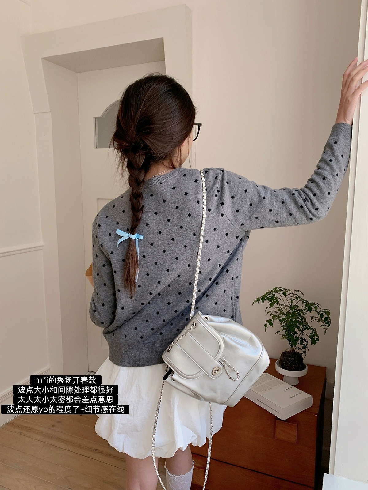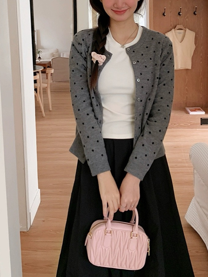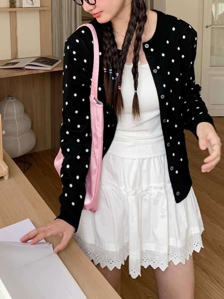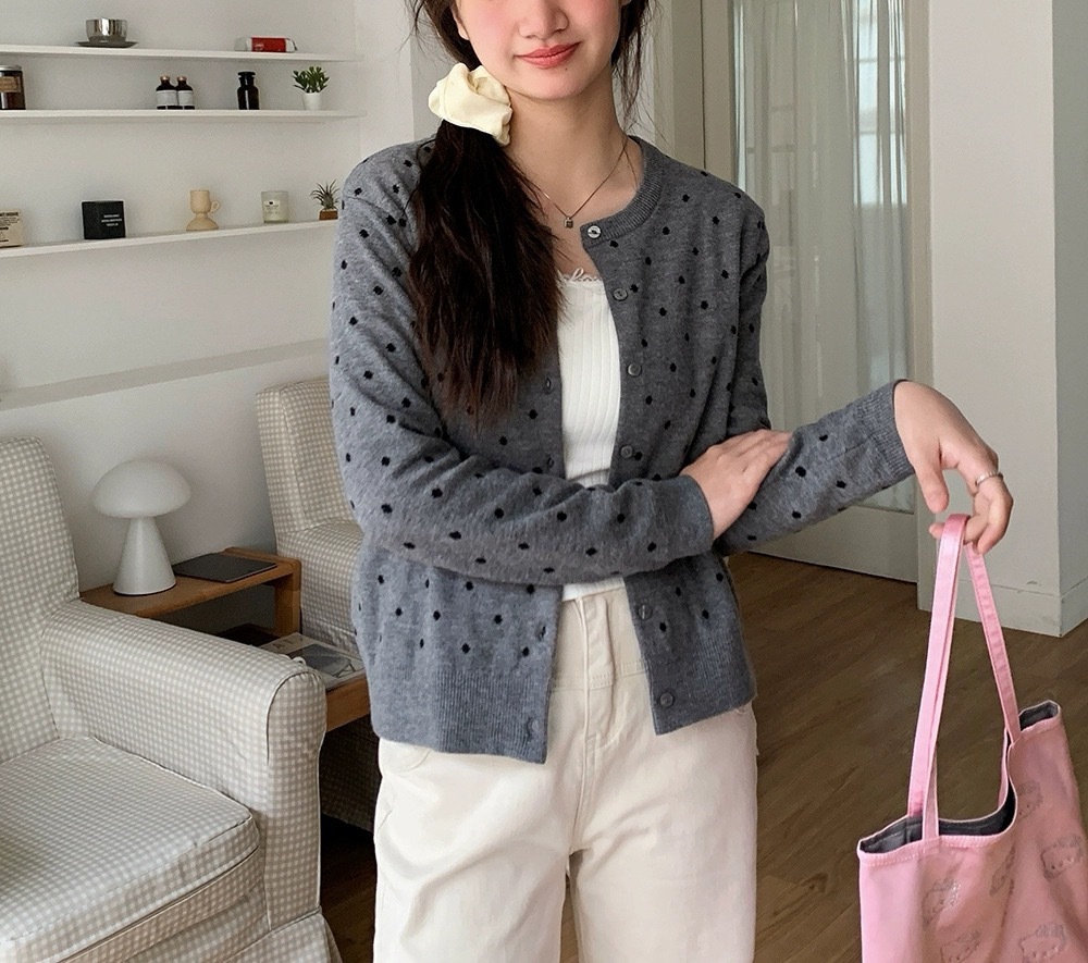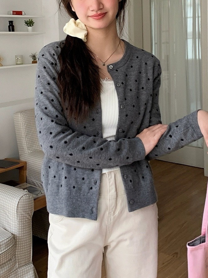 이른 가을 새로운 소프트 왁스 폴카 도트 니트 카디건 콘트라스트 컬러 에이지 감소 슬림 핏 재킷 여성 올 매치 우아한 디자인 스웨터