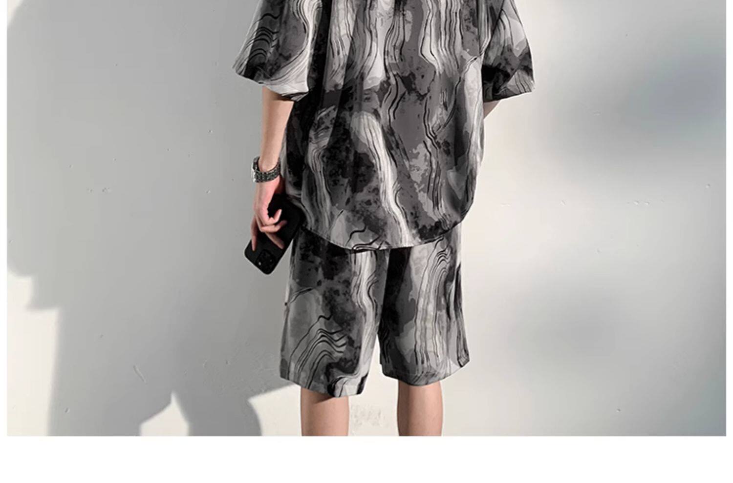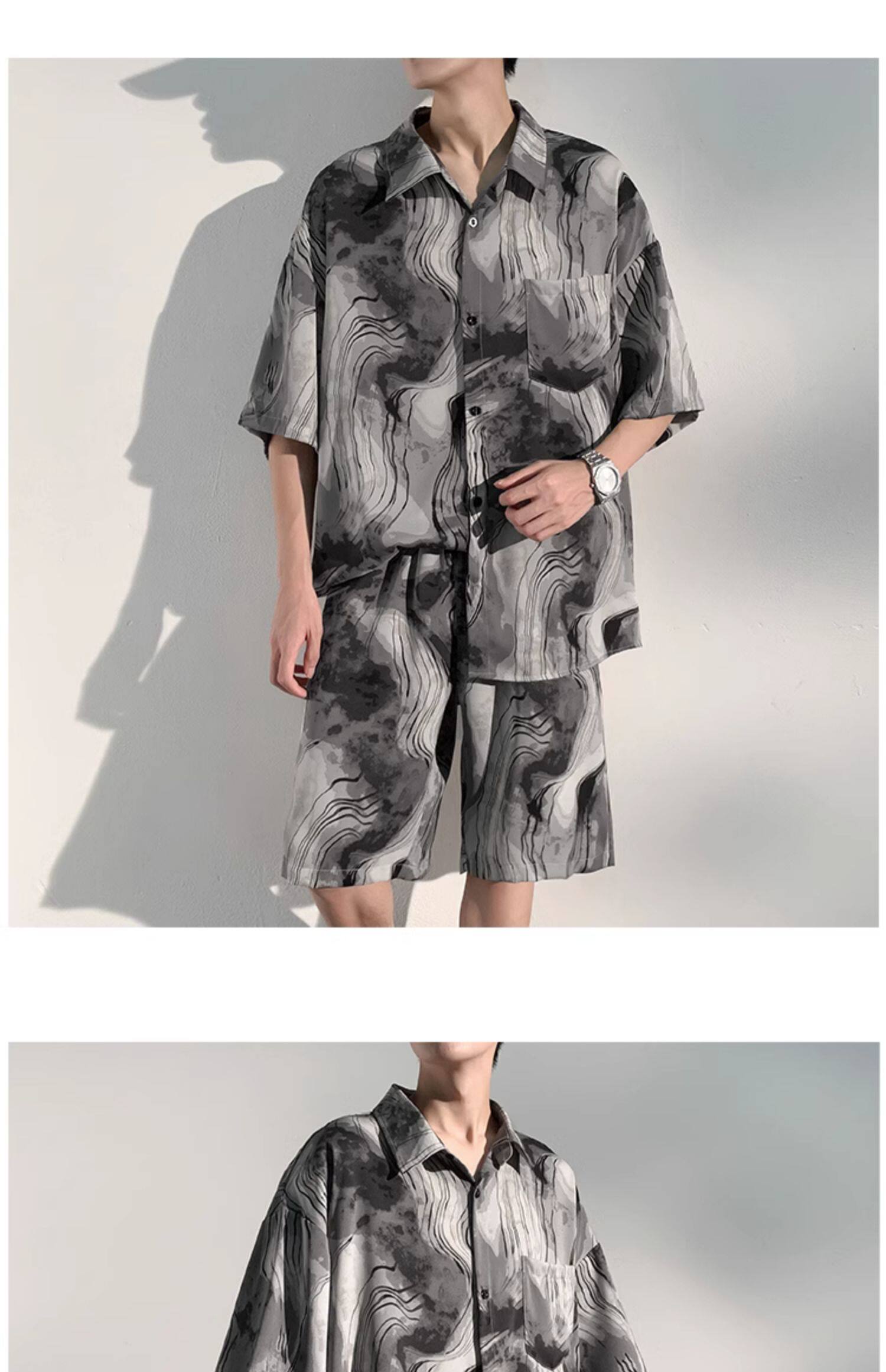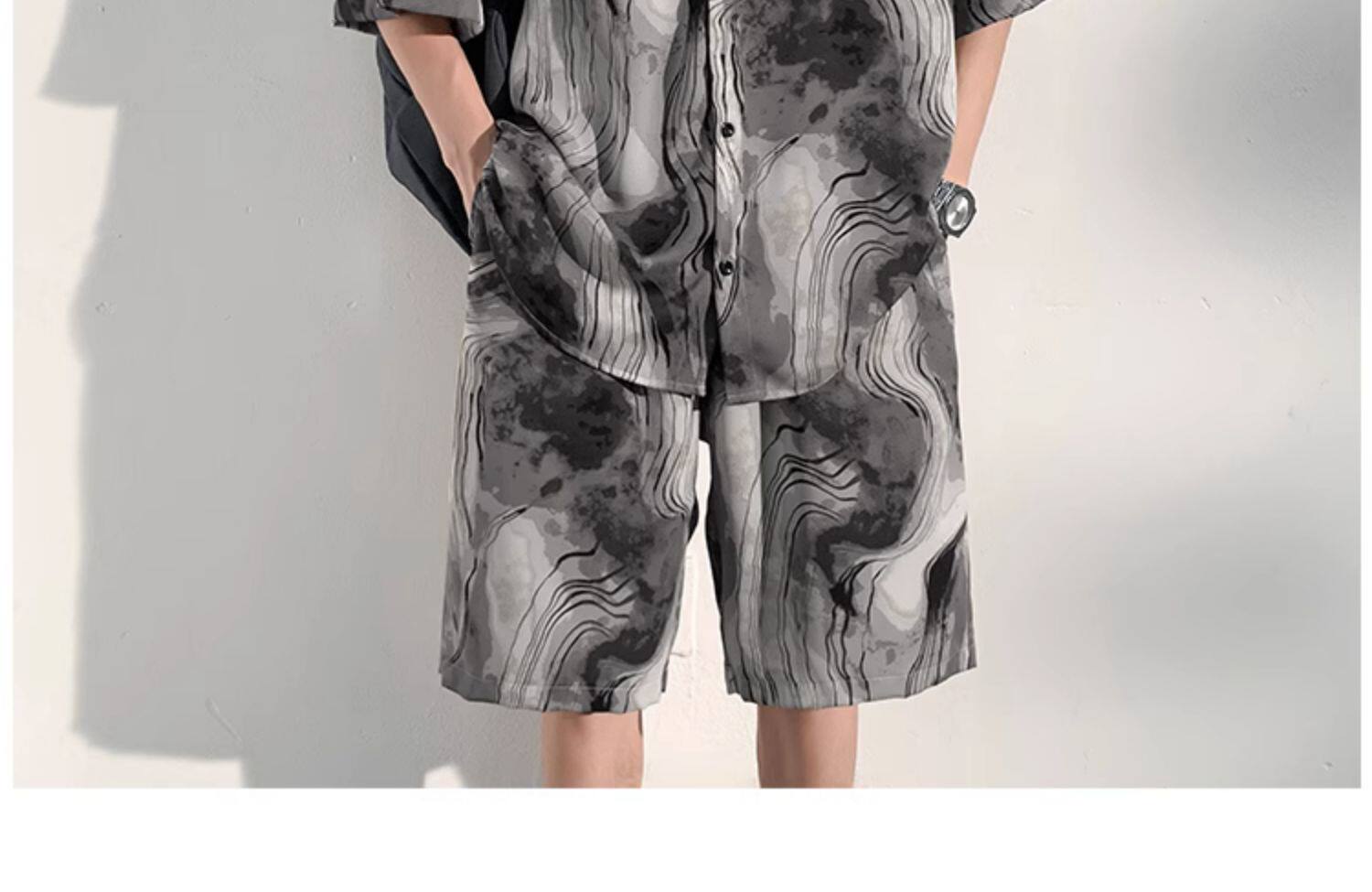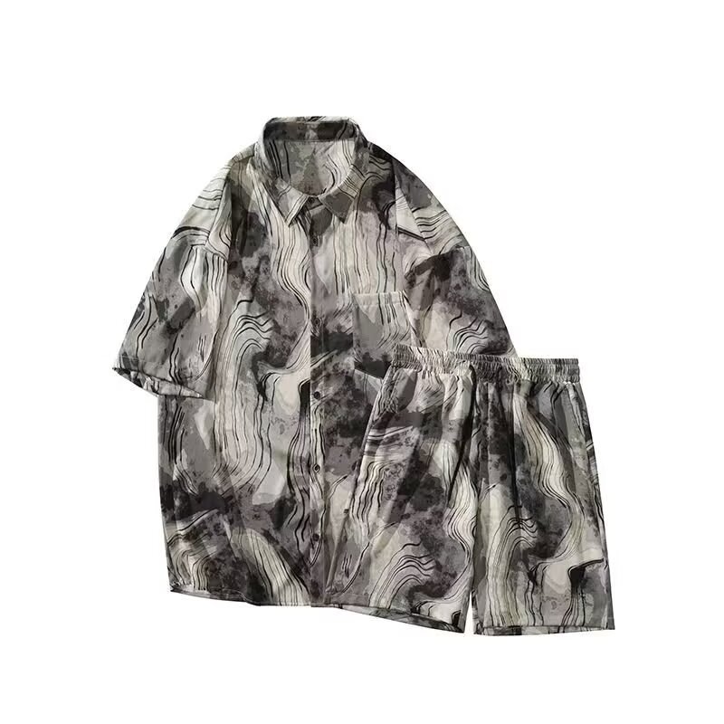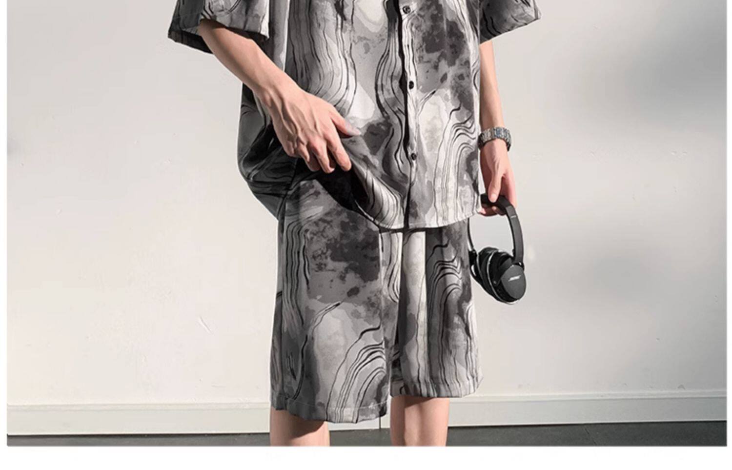 새로운 중국 스타일 국가 스타일 아이스 실크 비치 세트 남성 여름 얇은 느슨한 플러스 사이즈 셔츠 반바지 여름 의류
