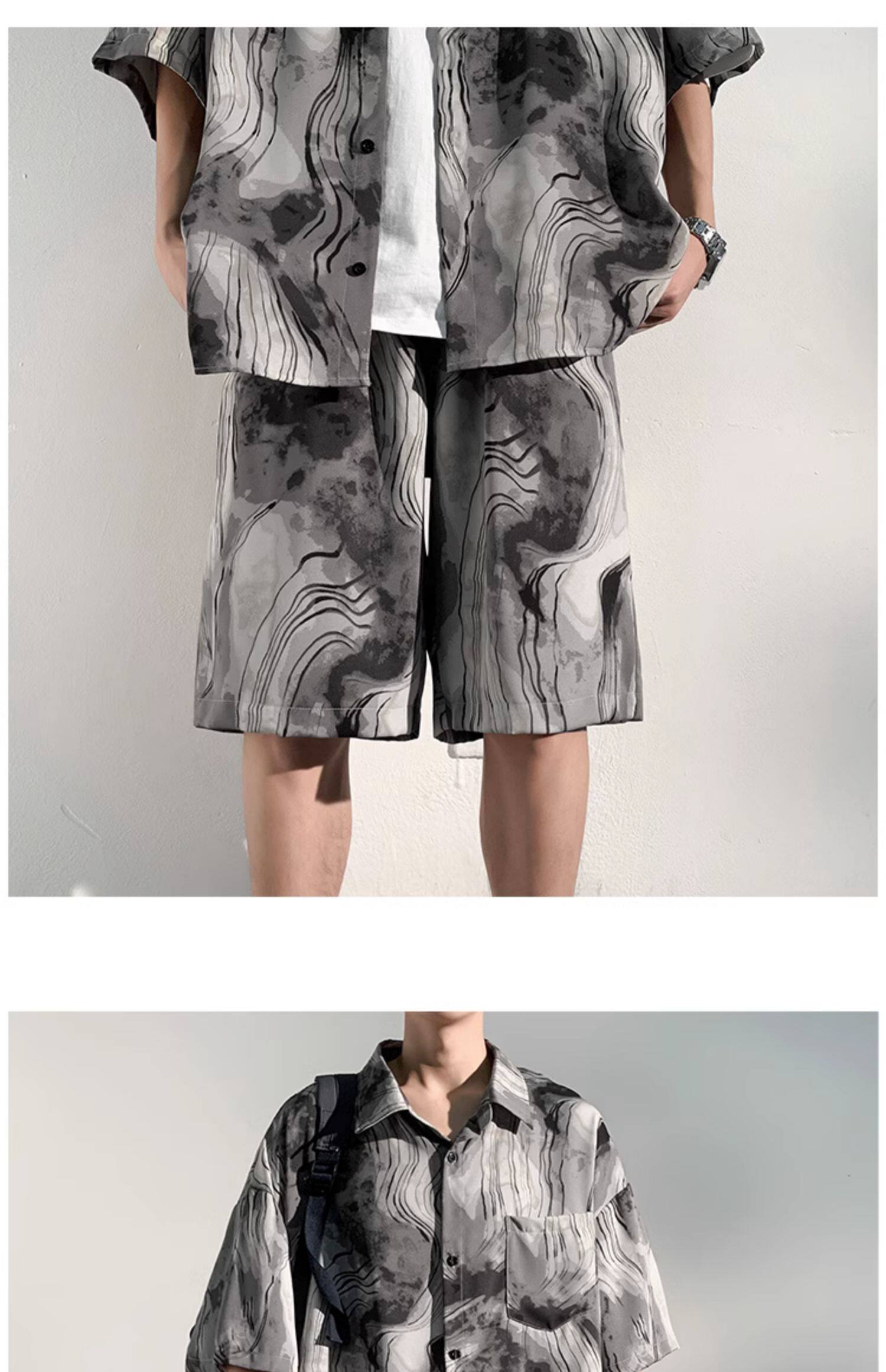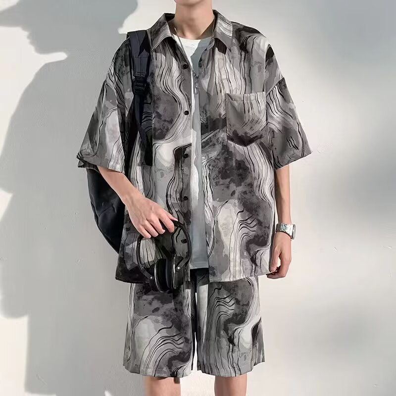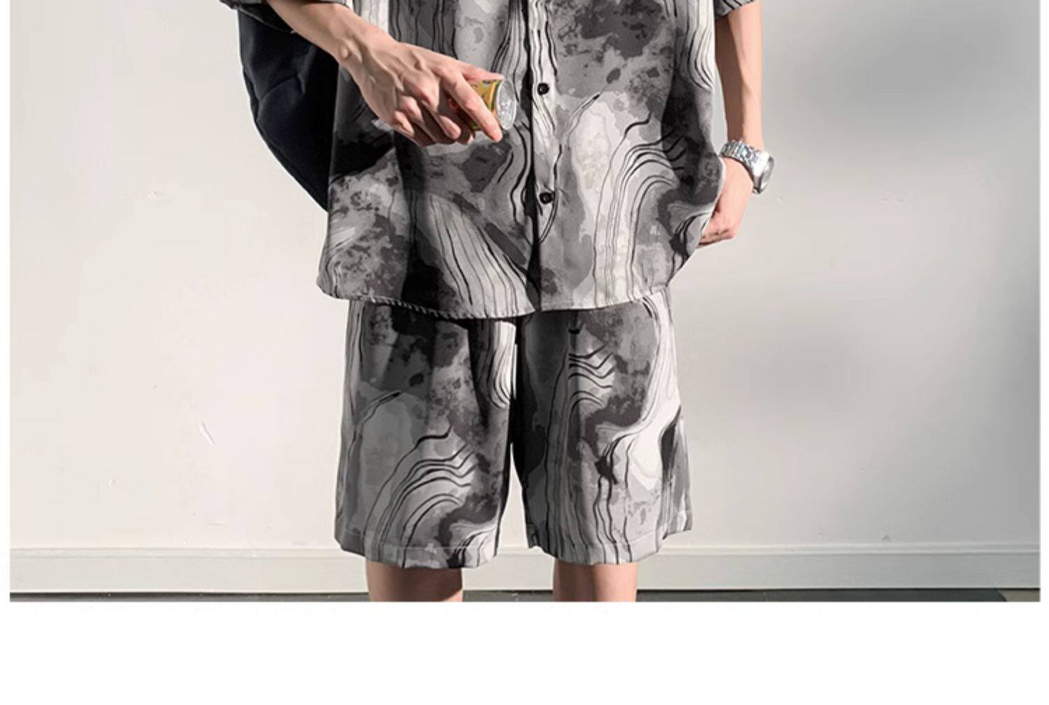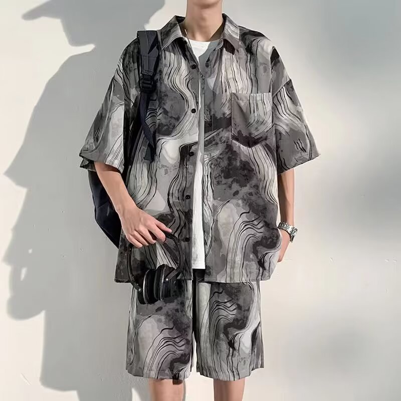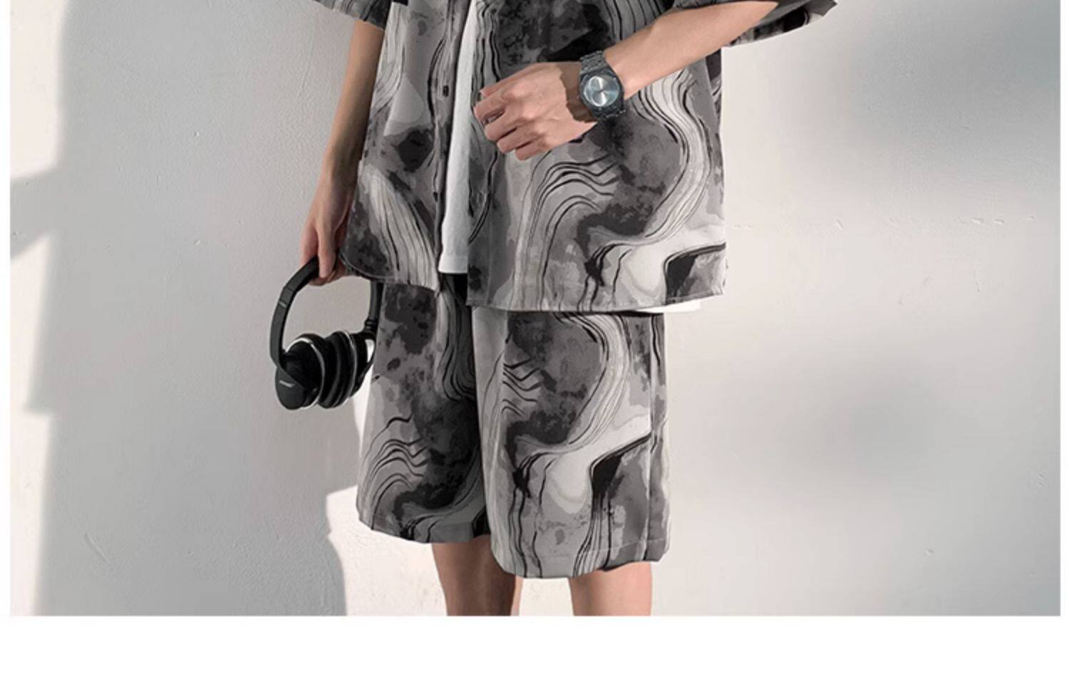 새로운 중국 스타일 국가 스타일 아이스 실크 비치 세트 남성 여름 얇은 느슨한 플러스 사이즈 셔츠 반바지 여름 의류