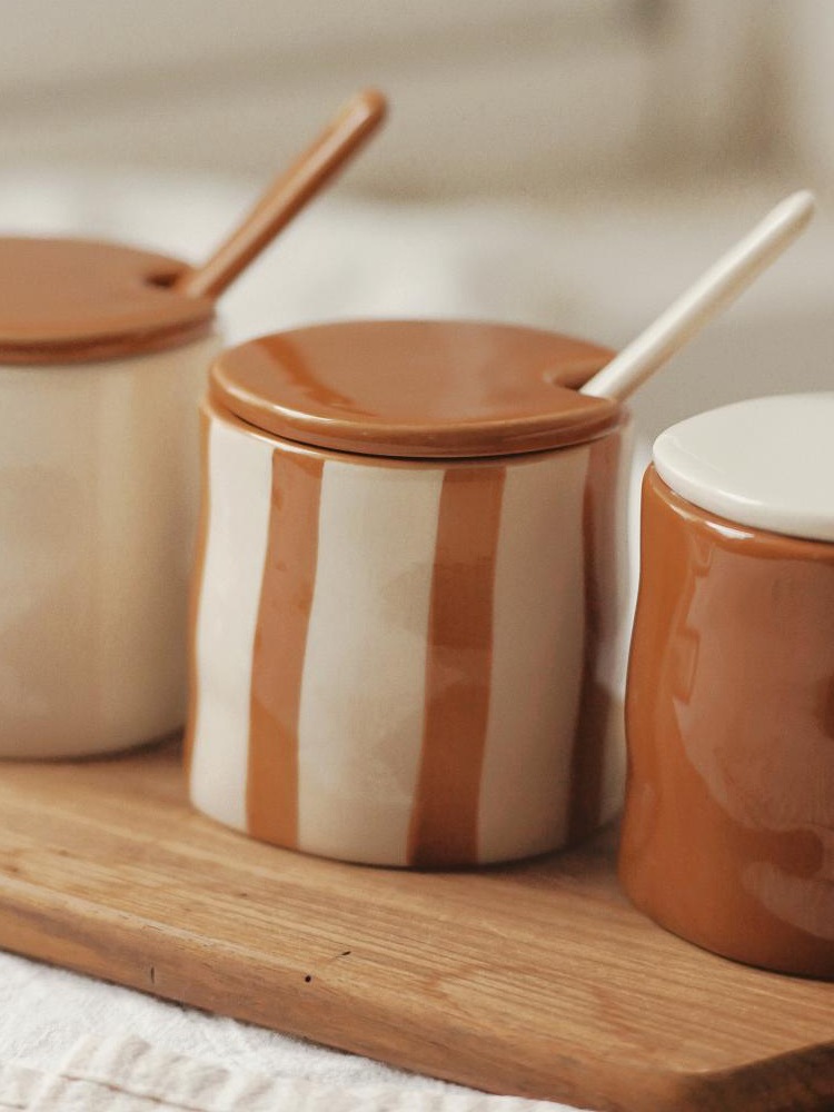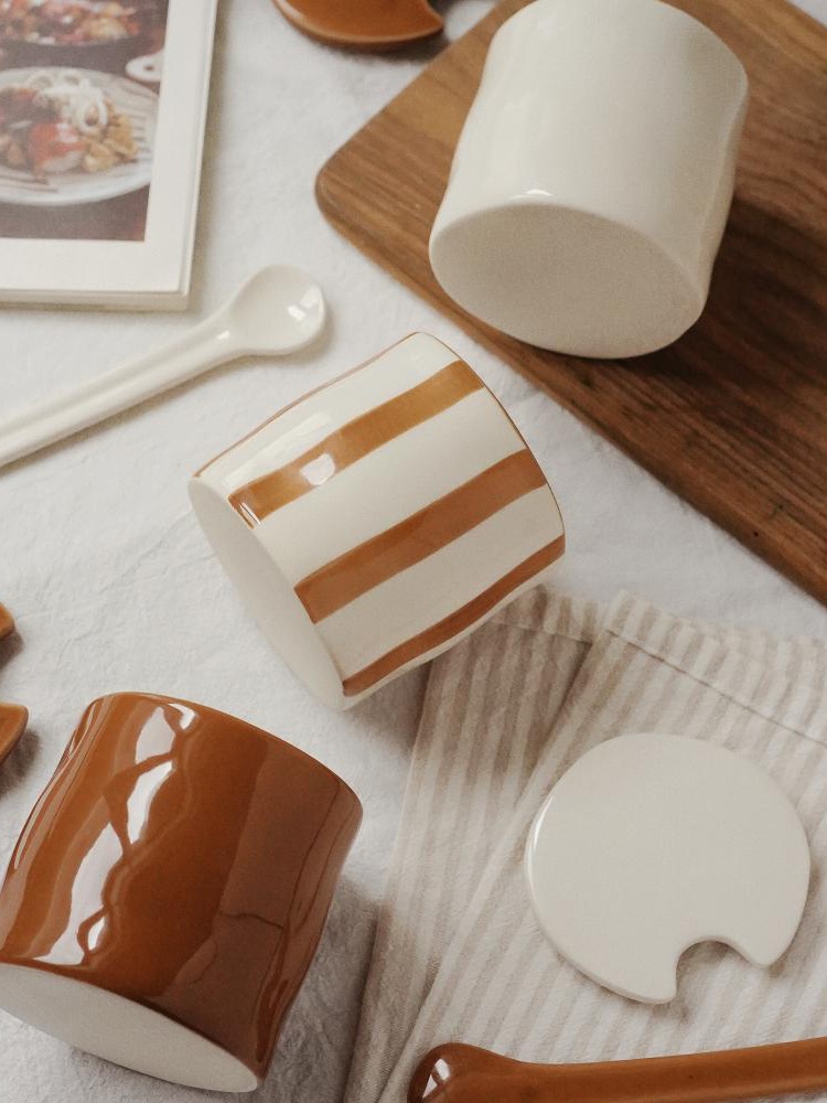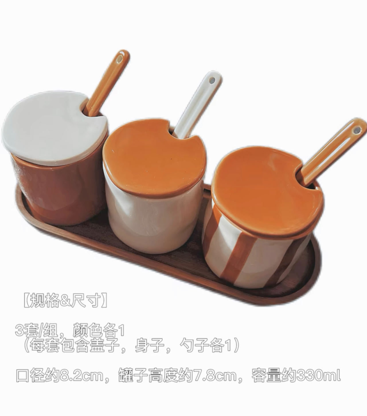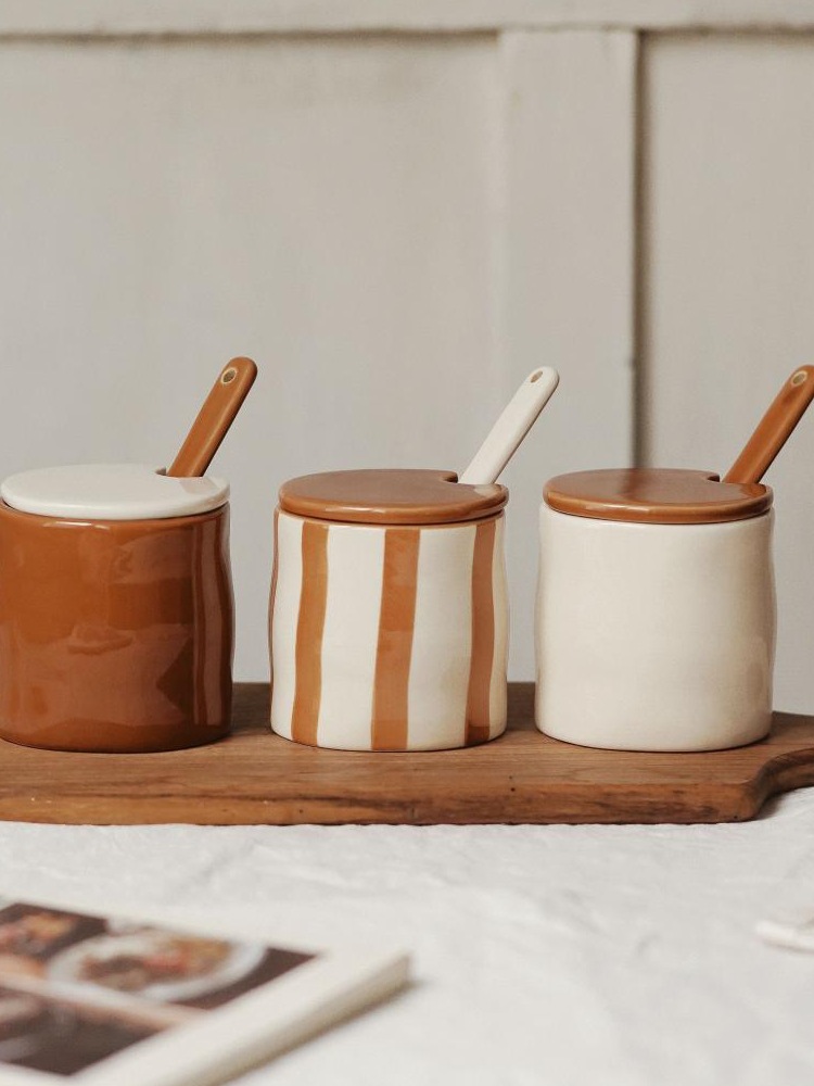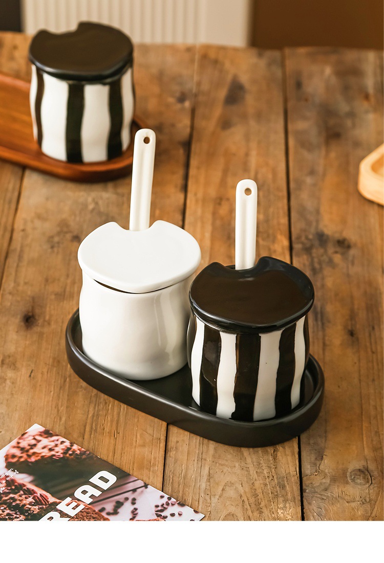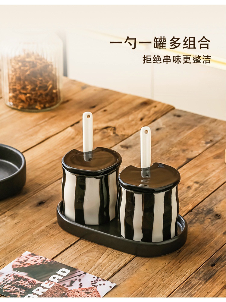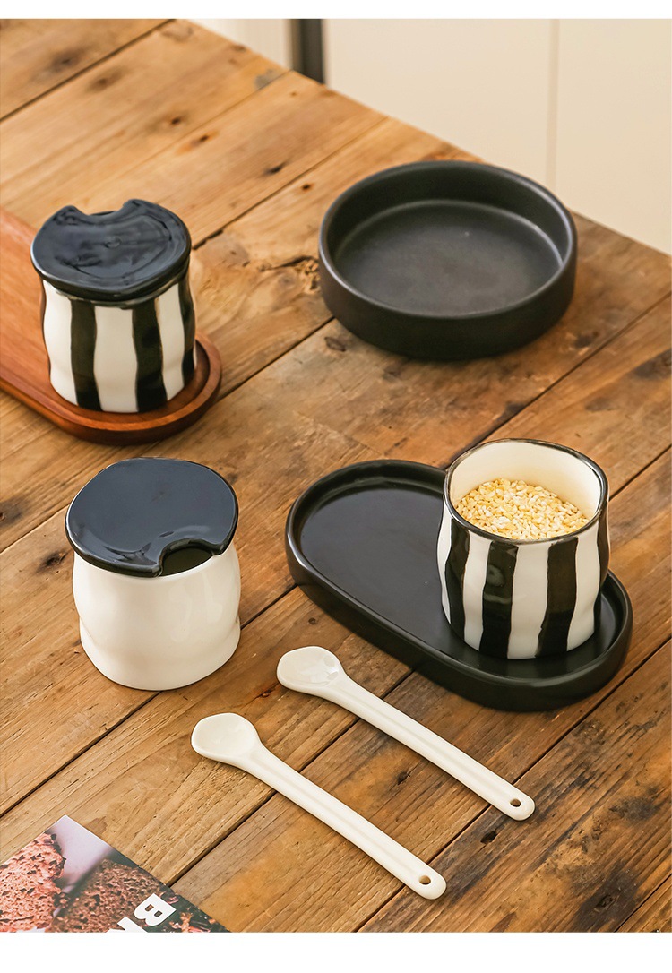 레트로 스타일 세라믹 줄무늬 손으로 그린 조미료 항아리 스푼 주방 용품 절묘한 보관 상자 조미료 항아리 세트