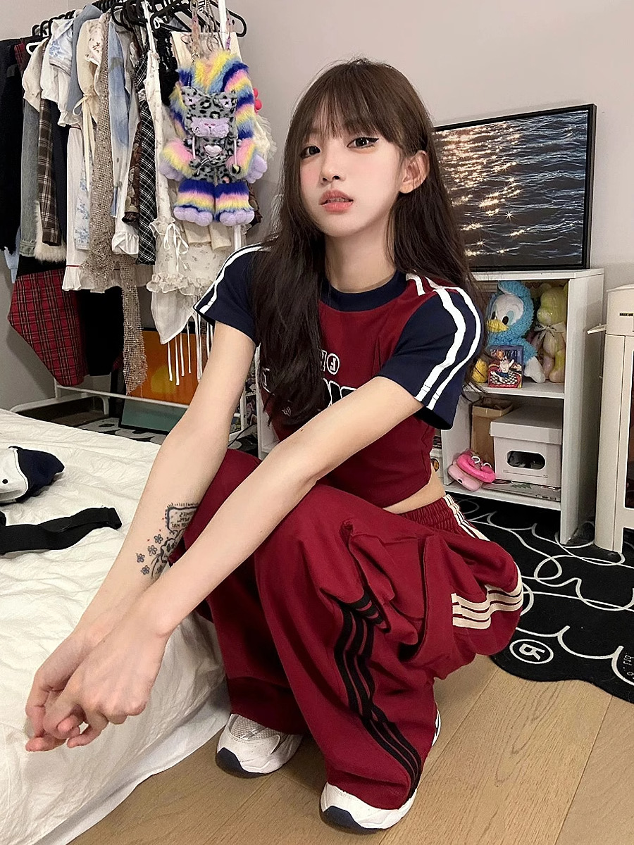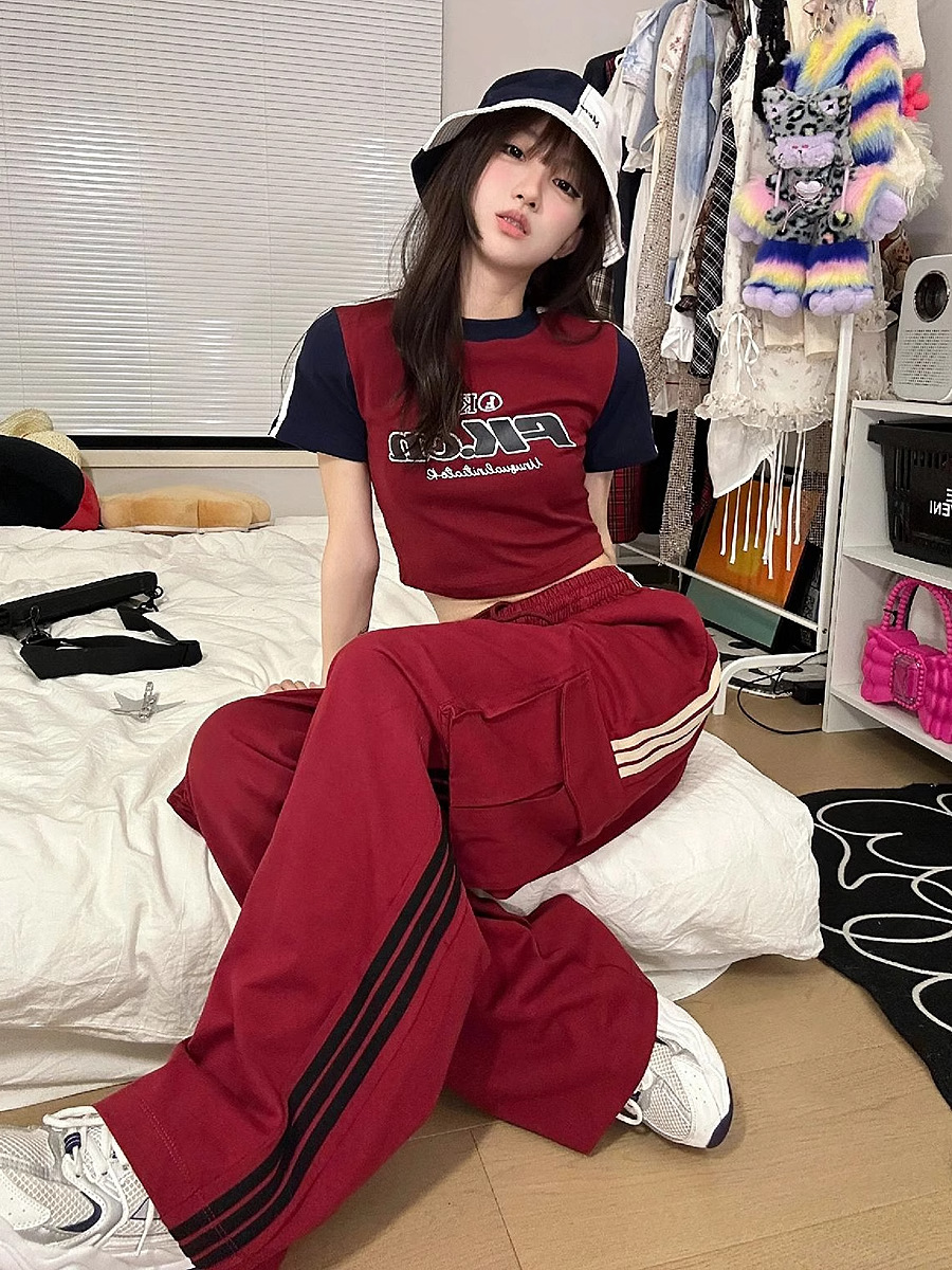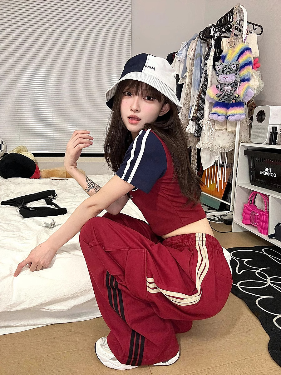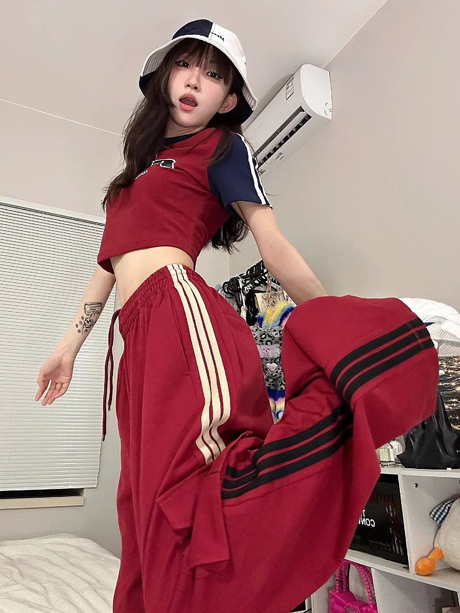 아메리칸 레트로 재즈 댄스 군중 바지 여성 높은 허리 캐주얼 세트 와이드 레그 바지 레드 3 바 스포츠 바지