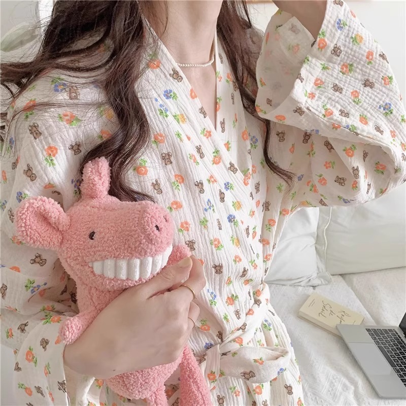 가을 만화 귀여운 Ins Bear 인쇄 목욕 가운 잠옷 여성 봄과 가을 긴 소매 홈 옷