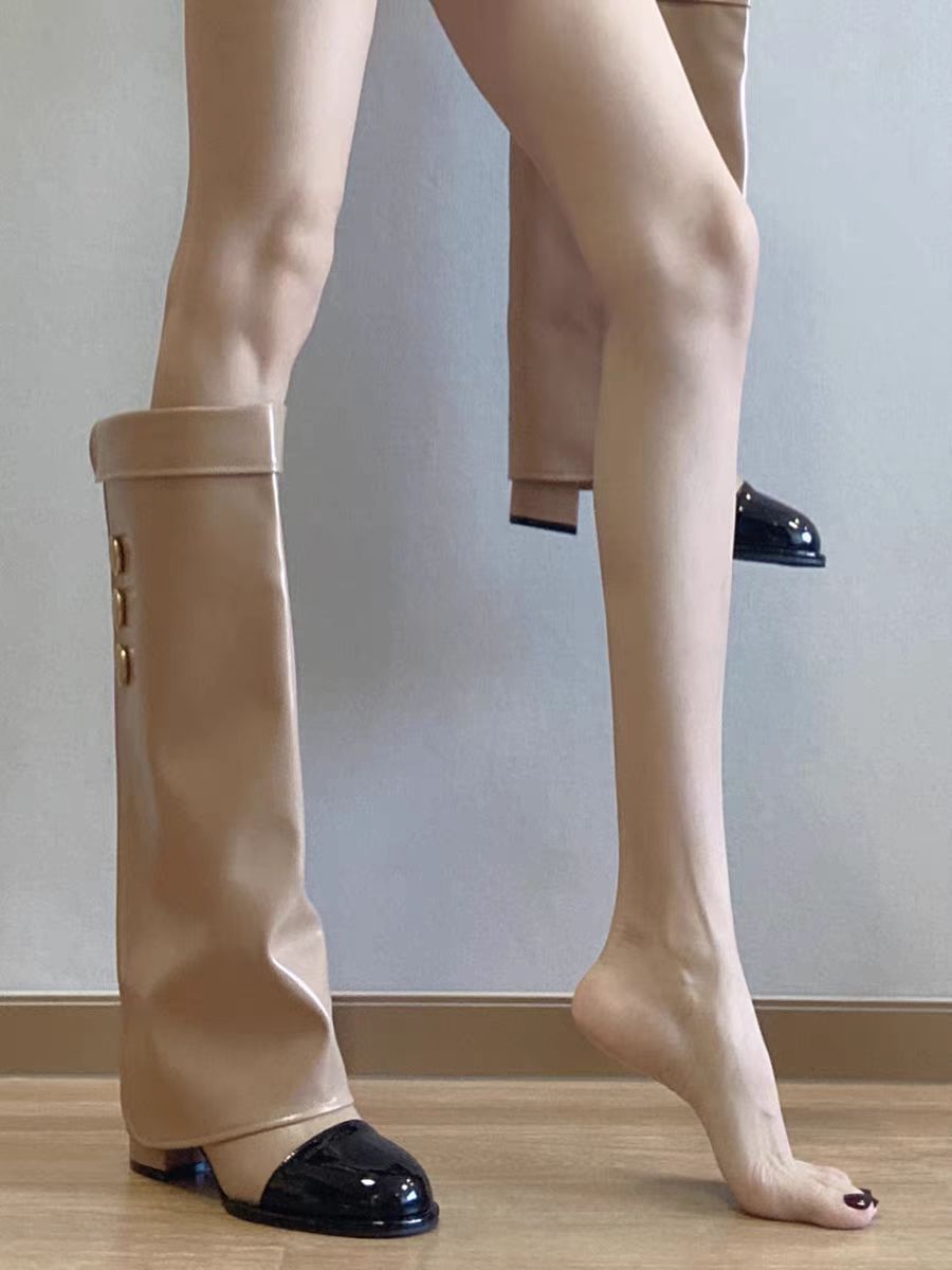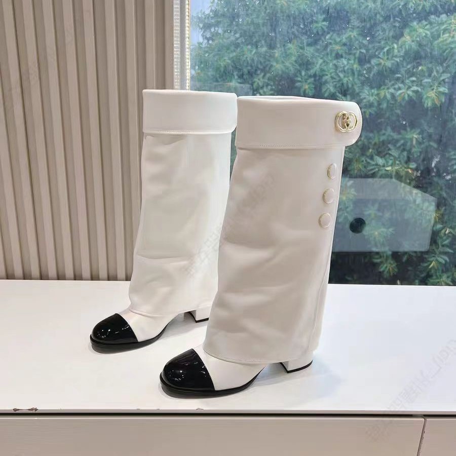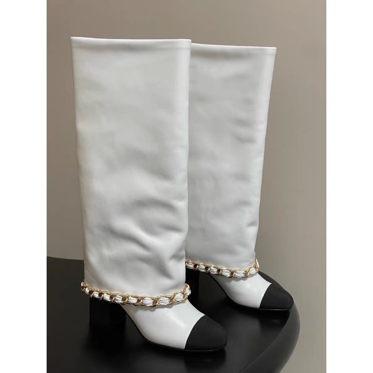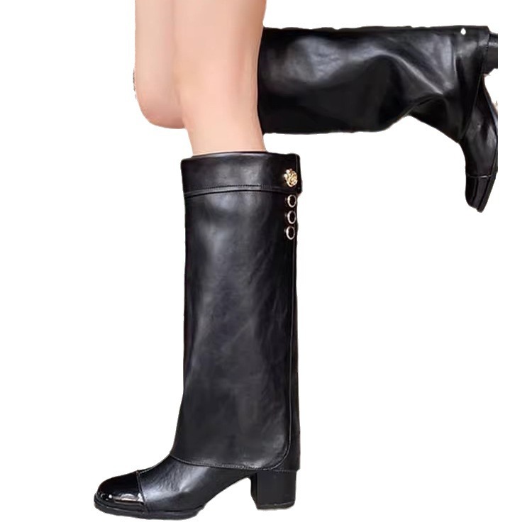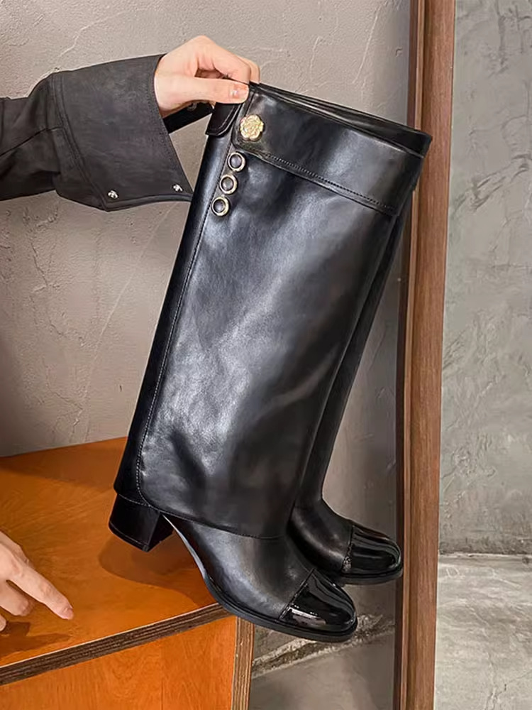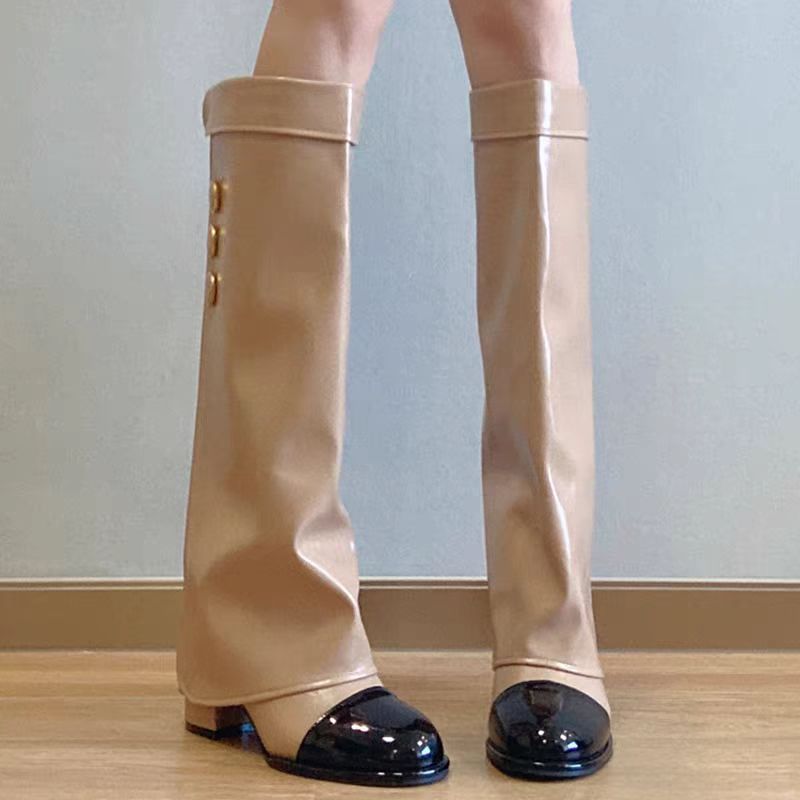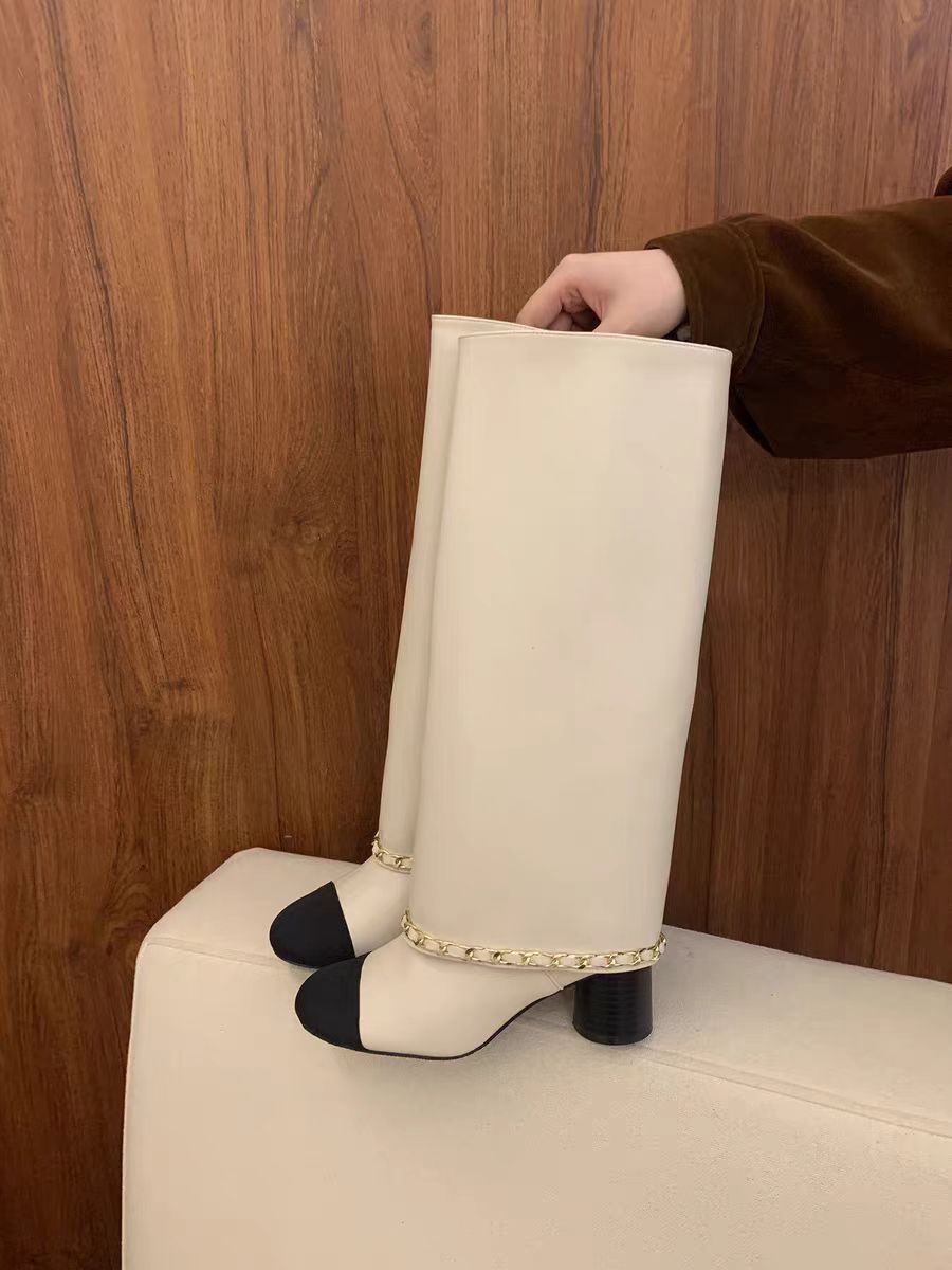 프랑스 스타일 샤넬 스타일 라운드 발가락 컬러 매칭 기사 부츠 여성 올매치 두꺼운 힐 하이 부츠 정품 가죽이지만 무릎 롱 부츠 바지 부츠
