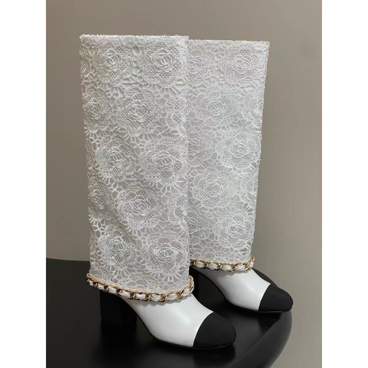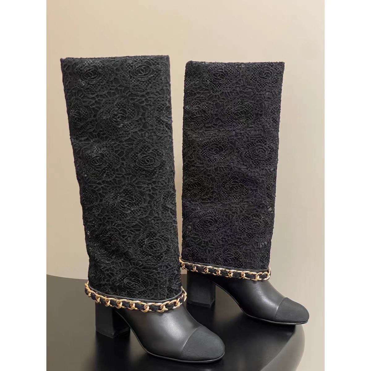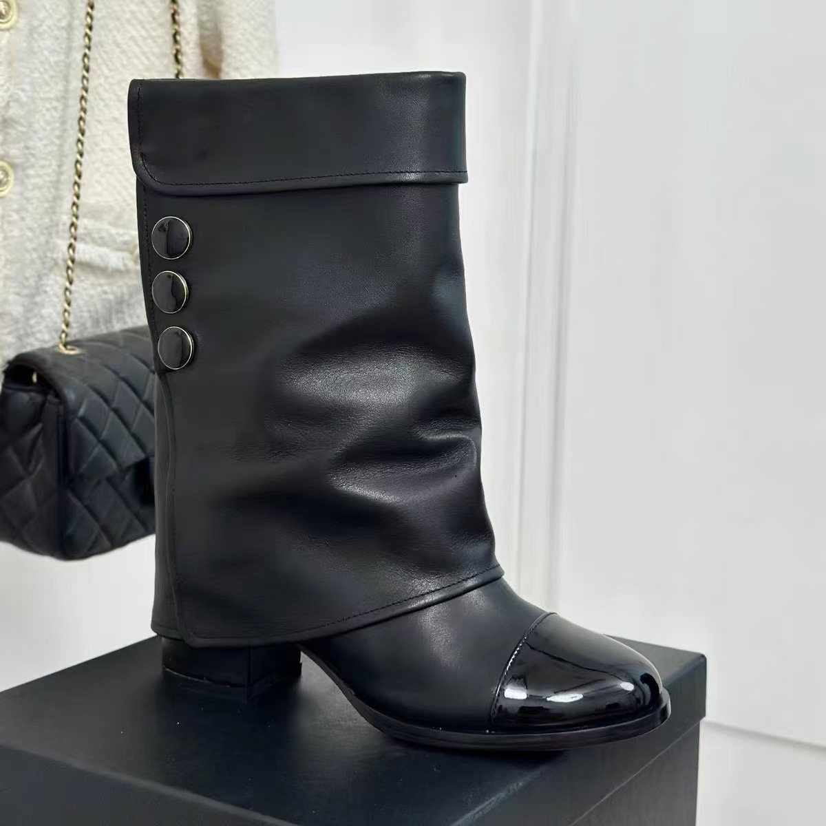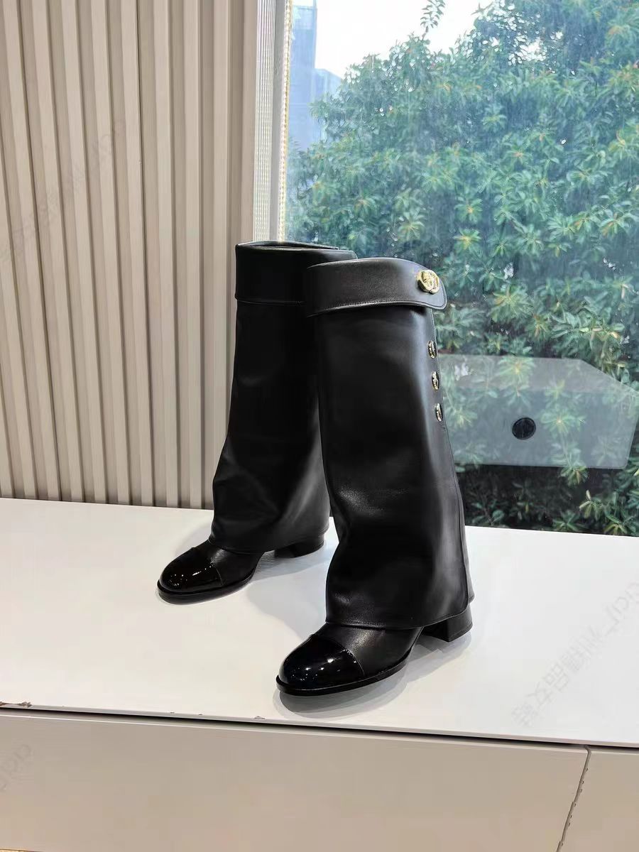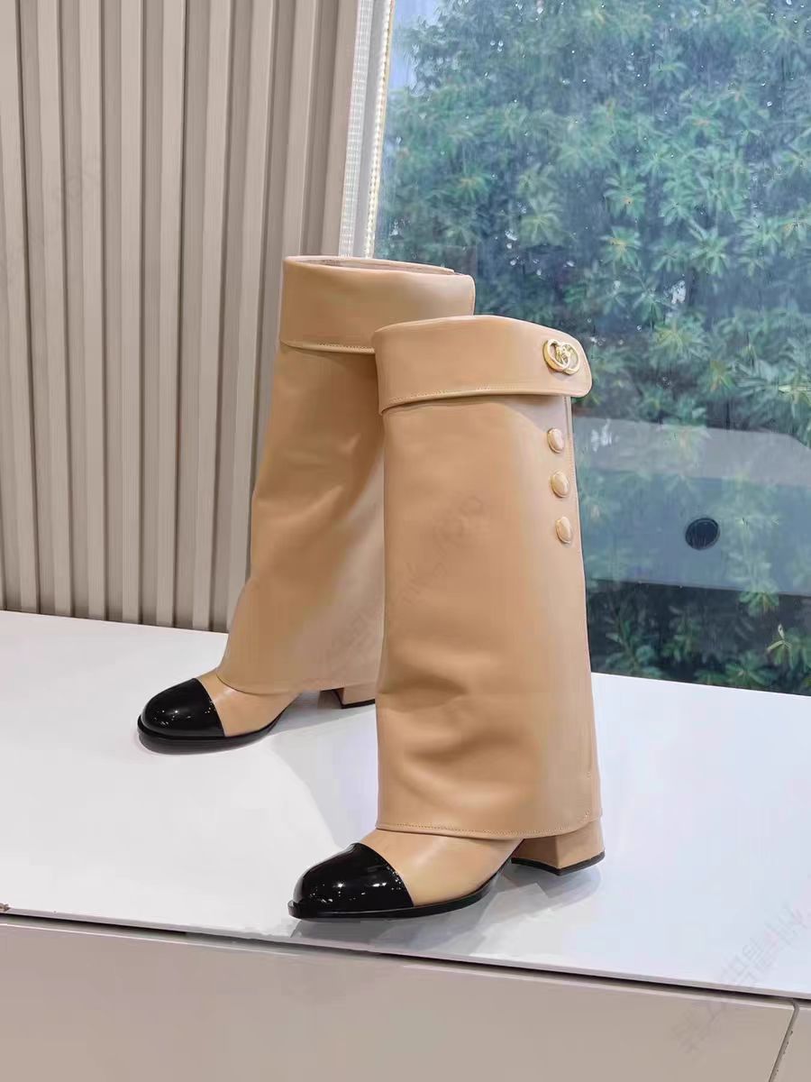 프랑스 스타일 샤넬 스타일 라운드 발가락 컬러 매칭 기사 부츠 여성 올매치 두꺼운 힐 하이 부츠 정품 가죽이지만 무릎 롱 부츠 바지 부츠