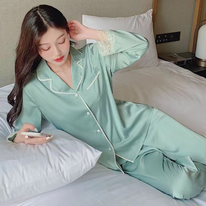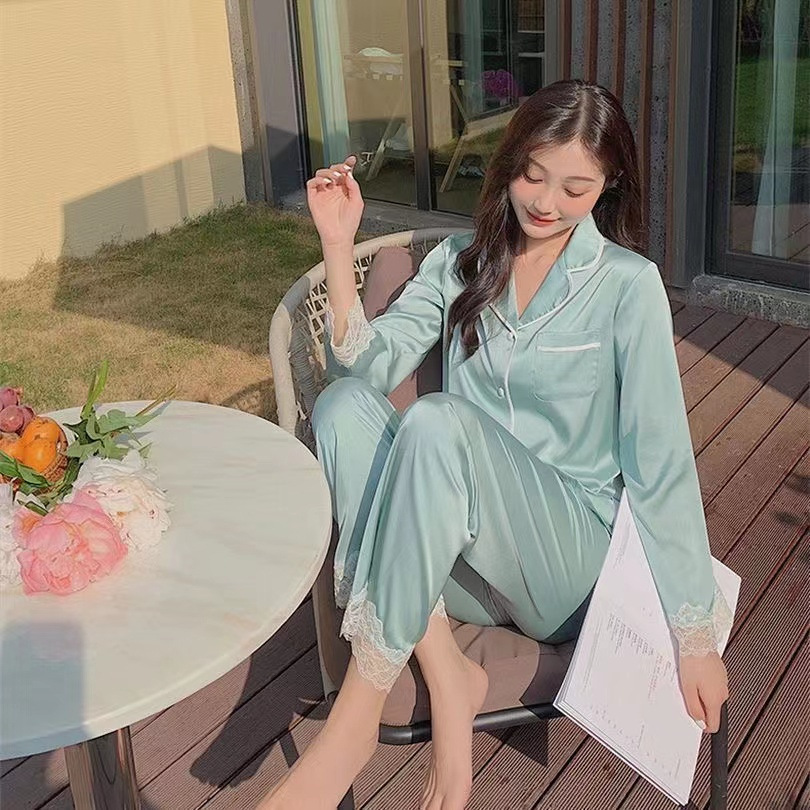 가을 여성 실크 긴팔 바지 파자마 실크 아이스 실크 레이스 외부 착용 홈 의류 세트