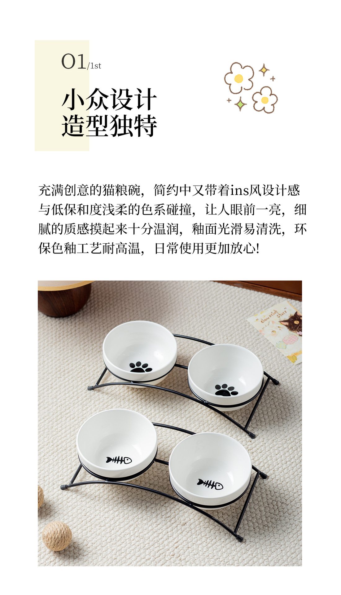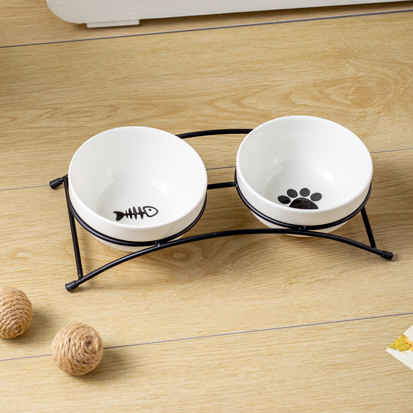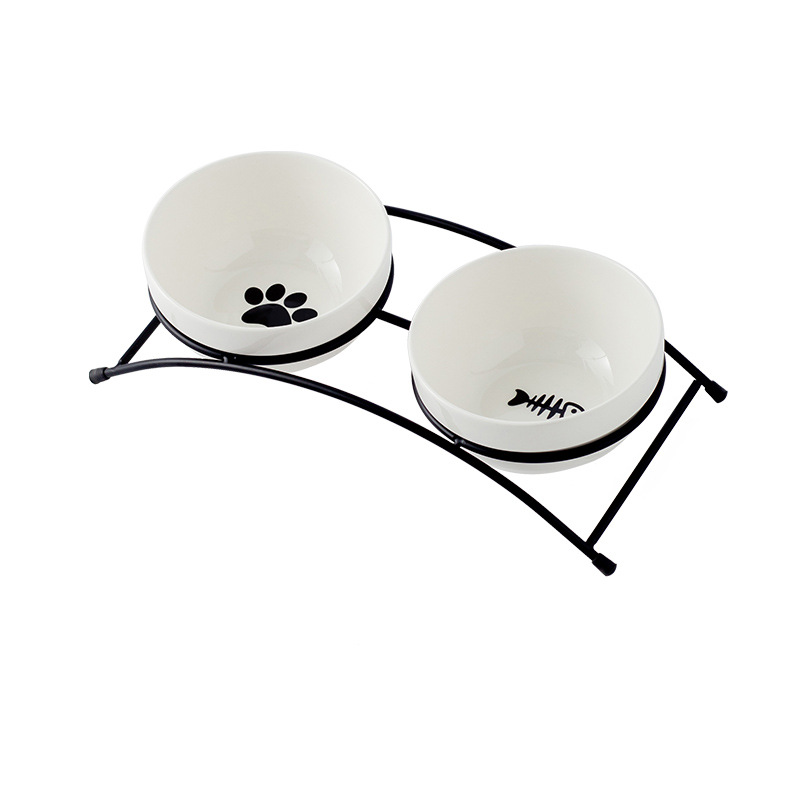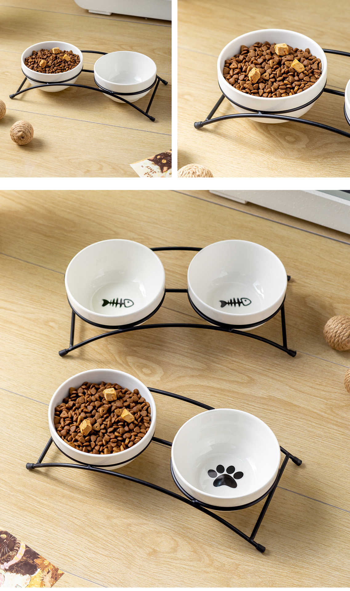 순백 도자기 밥그릇 [고양이 발바닥 + 물고기 뼈] + 아치형 2구 받침대