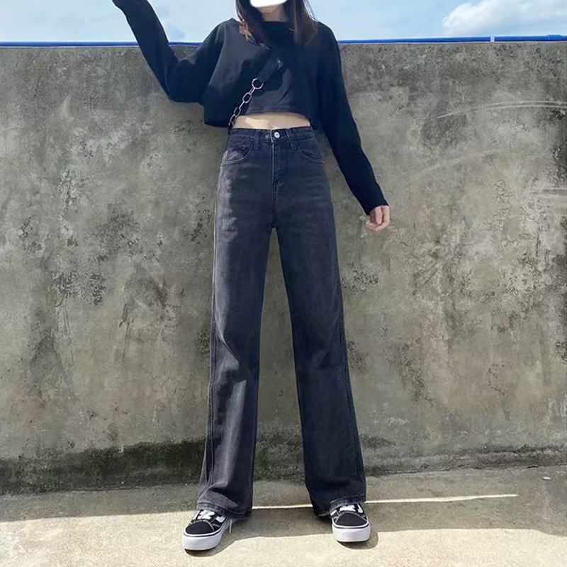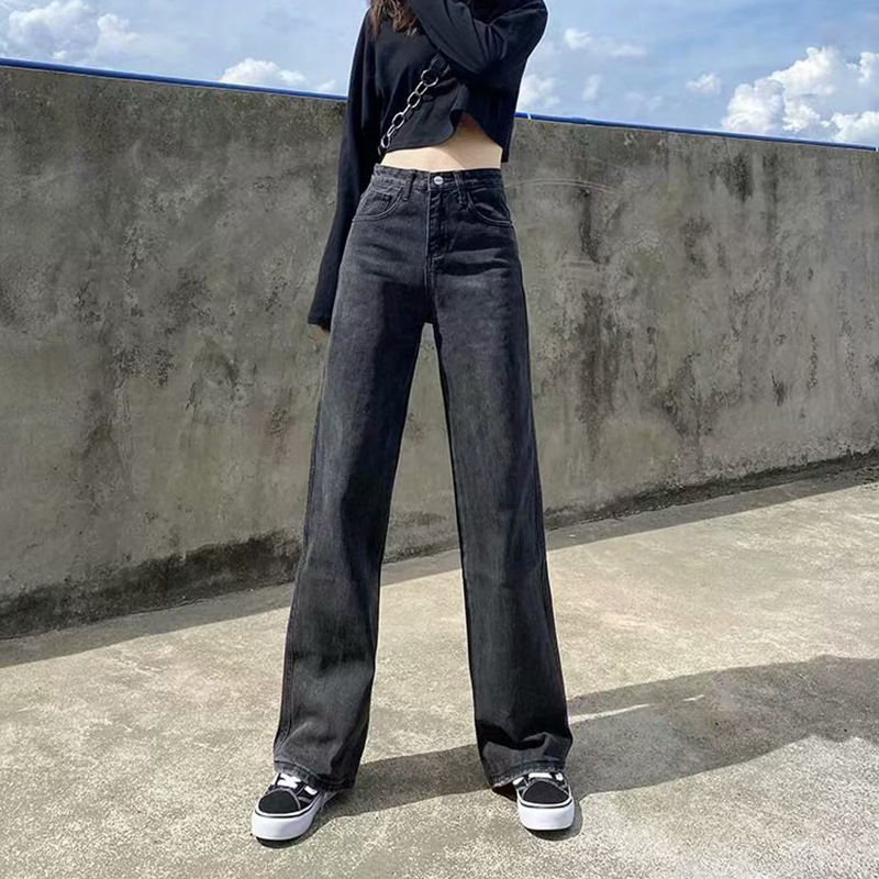 검은 회색 넓은 다리 청바지 여성의 2024 년 봄과 여름 새로운 슬리밍 높은 허리 투약 느슨한 스트레이트 바지 바지