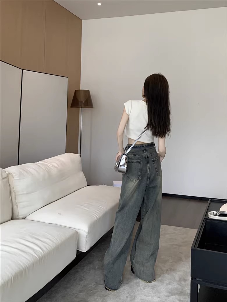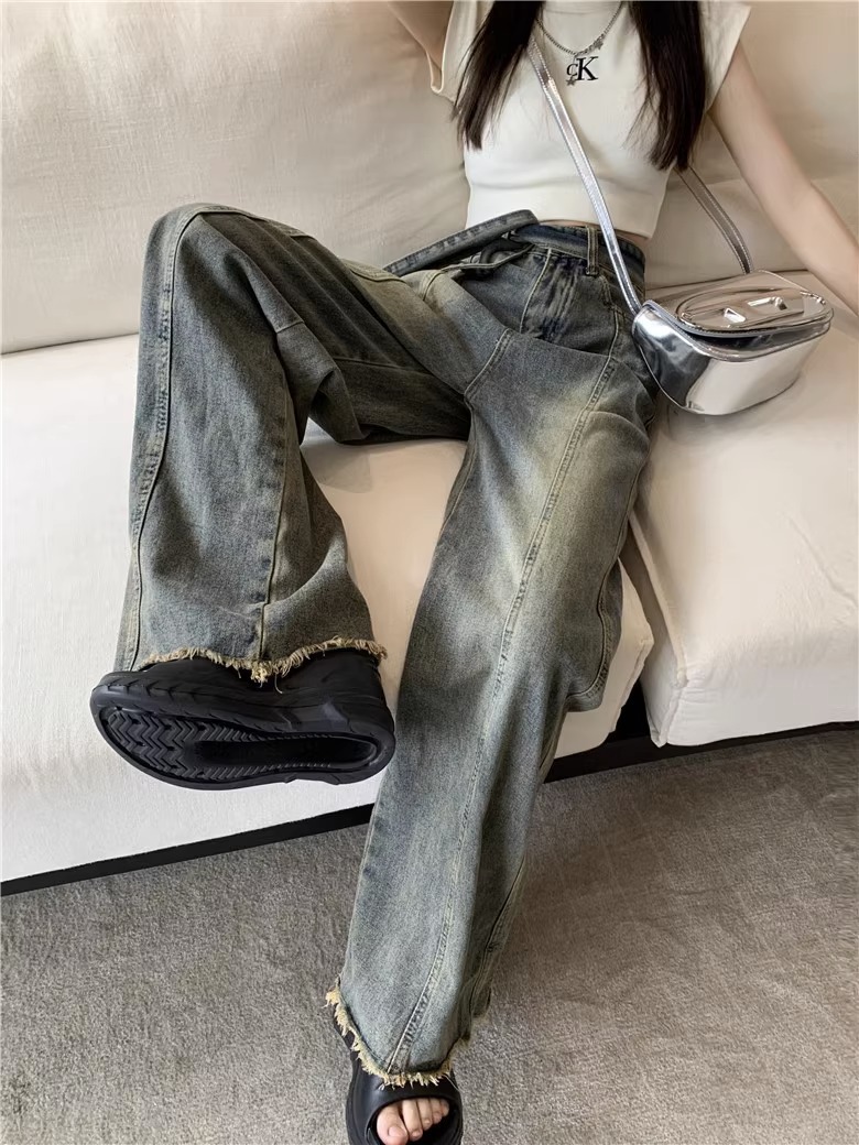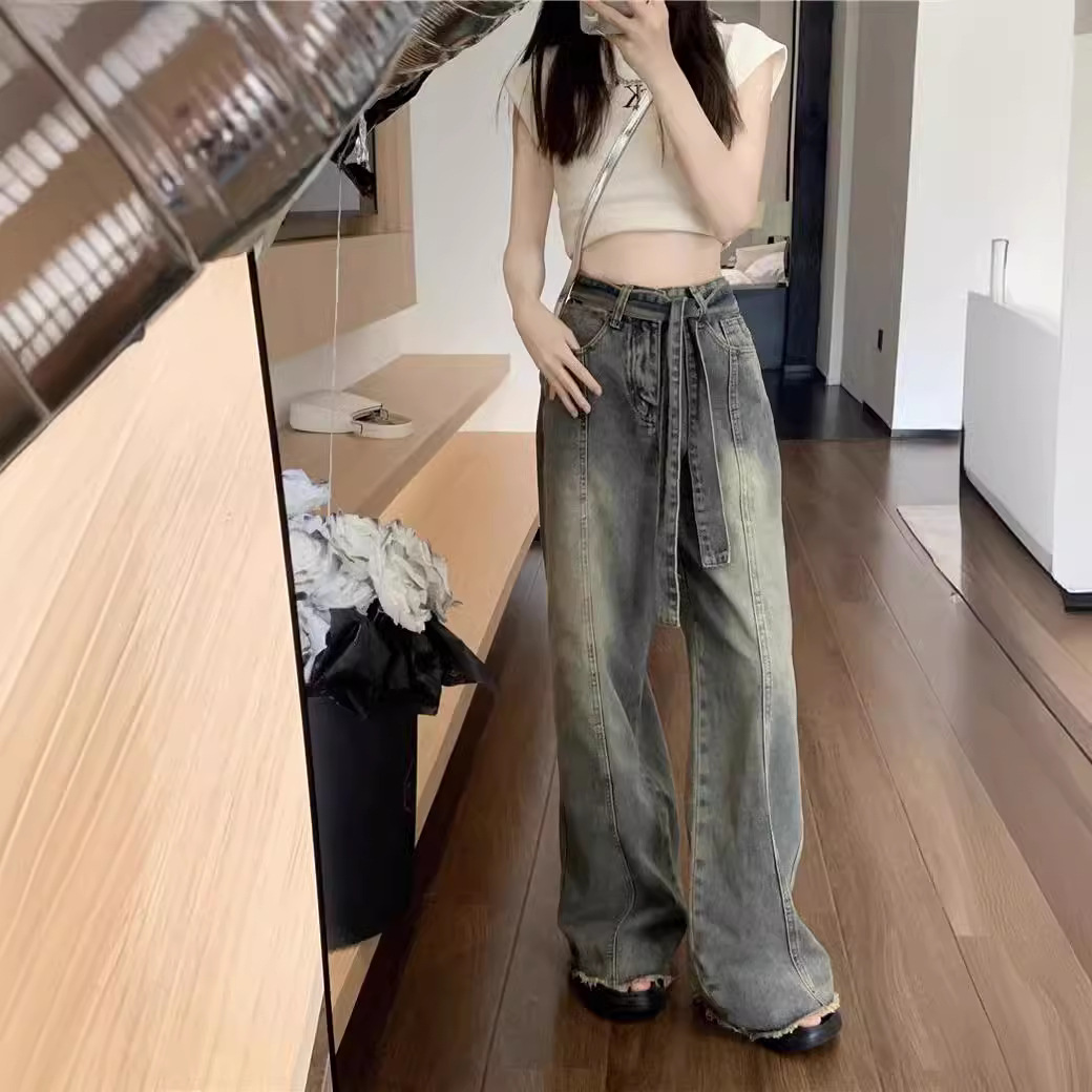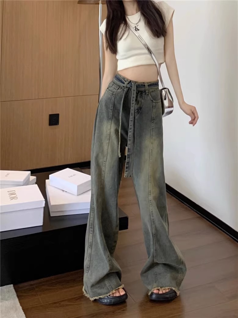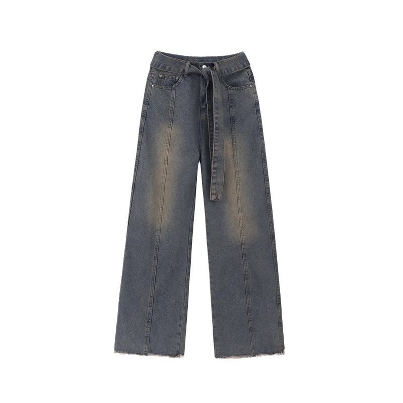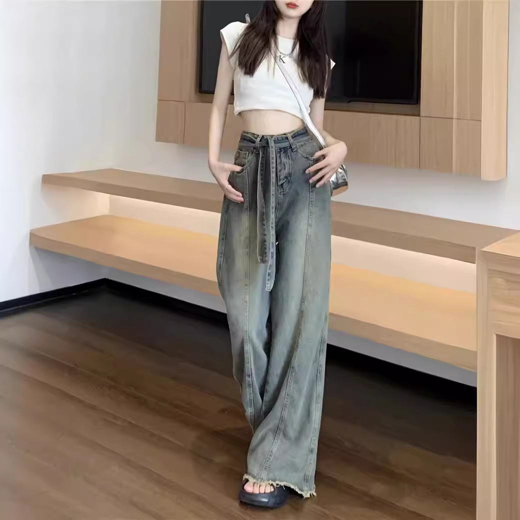 아메리칸 레트로 청바지 여성의 2024 봄과 가을 새로운 높은 허리 느슨한 슬리밍 디자인 센스 게으른 넓은 다리 바지