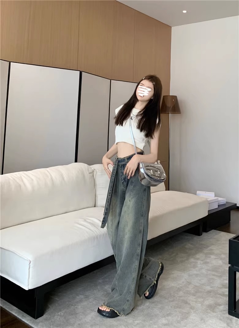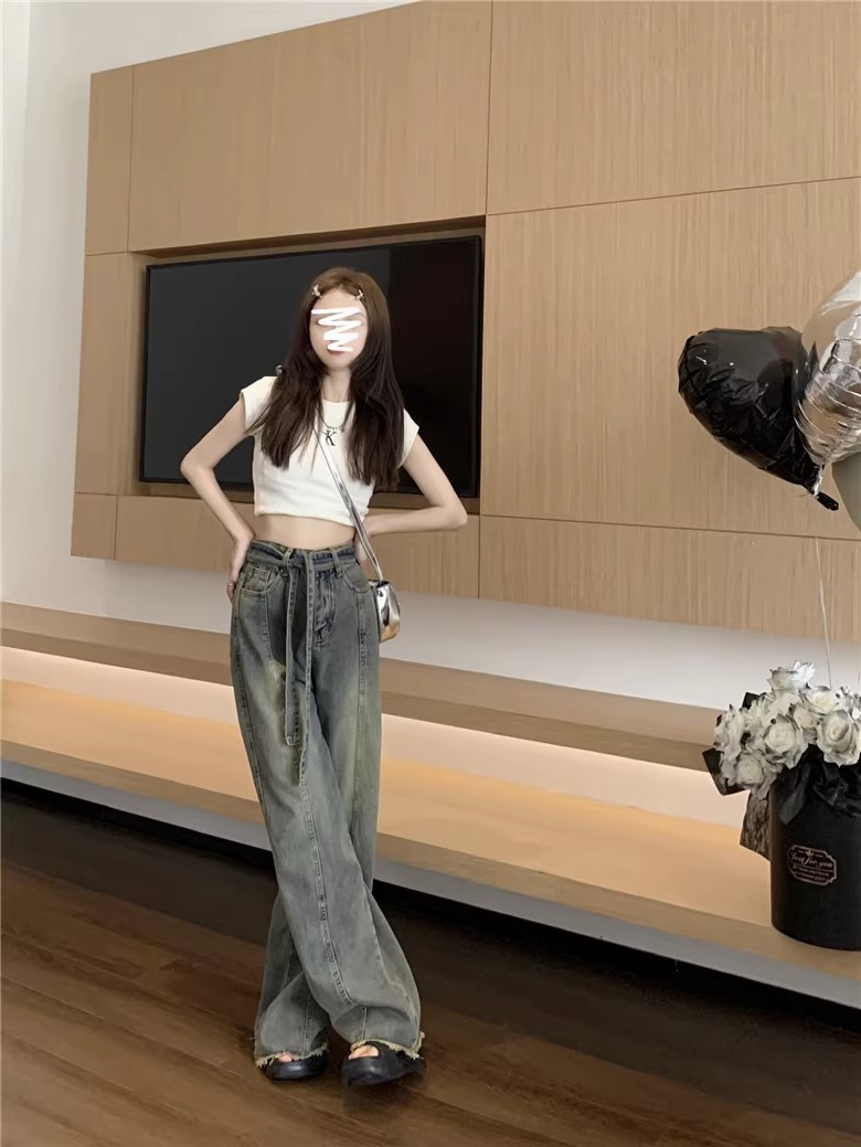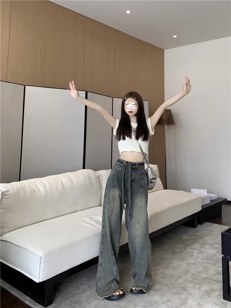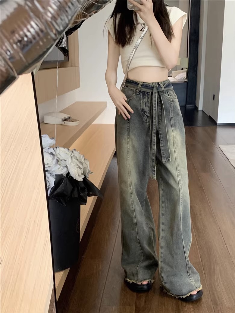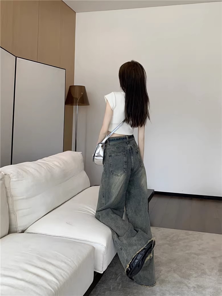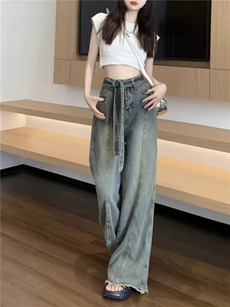아메리칸 레트로 청바지 여성의 2024 봄과 가을 새로운 높은 허리 느슨한 슬리밍 디자인 센스 게으른 넓은 다리 바지