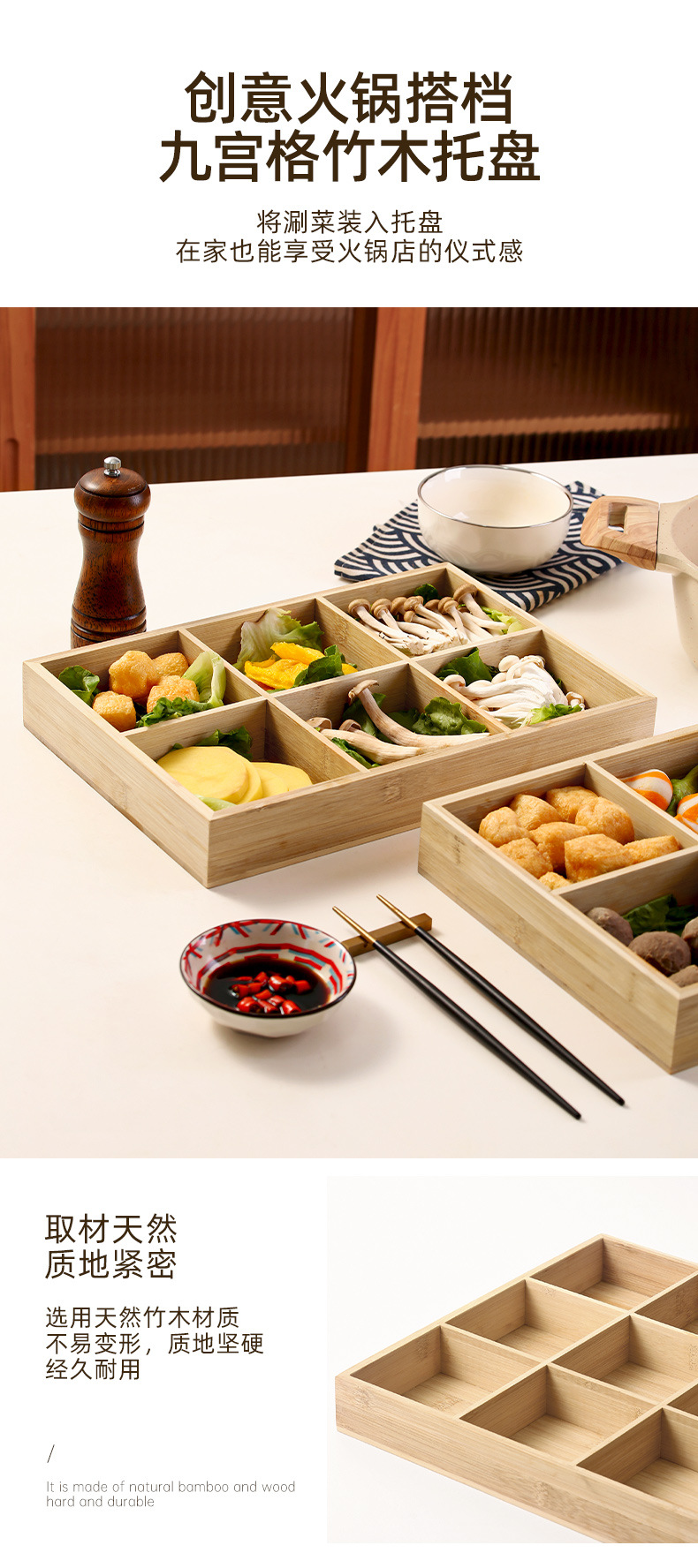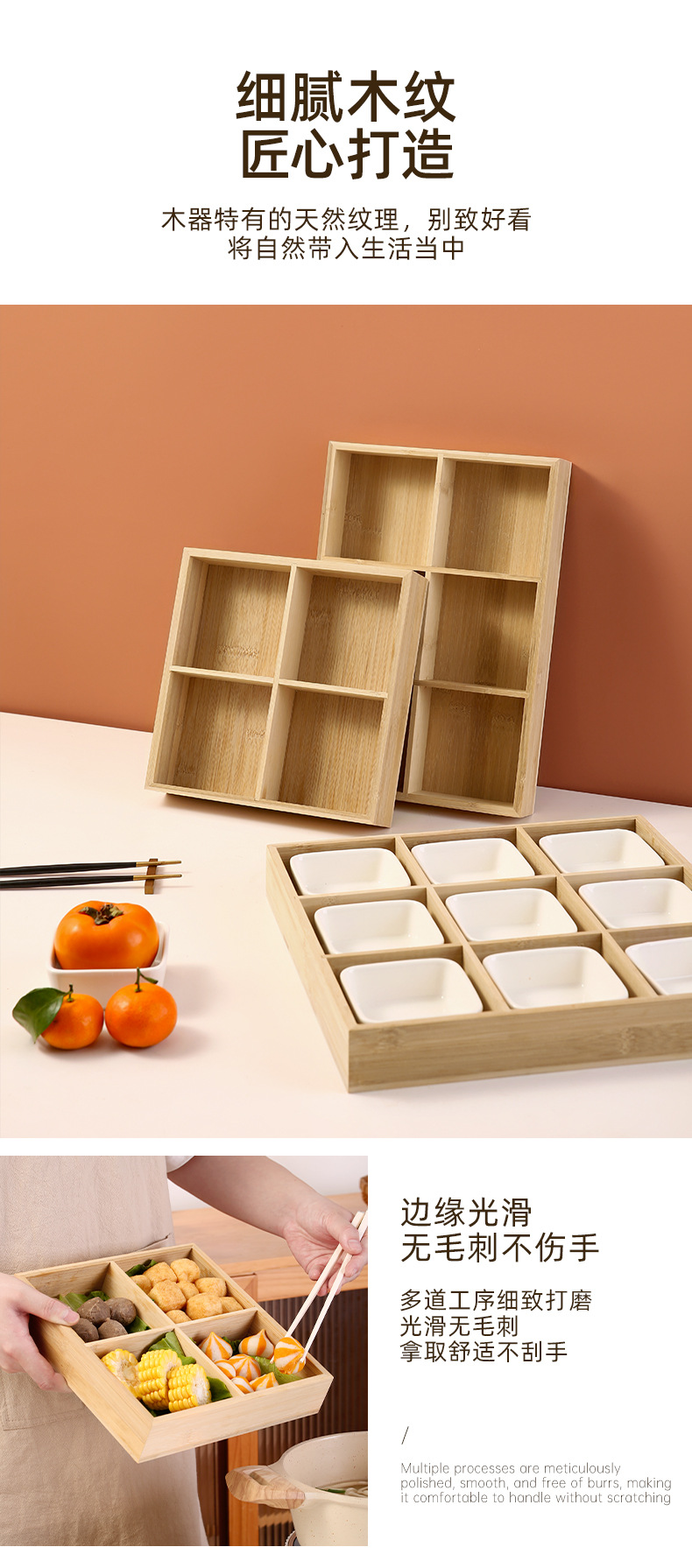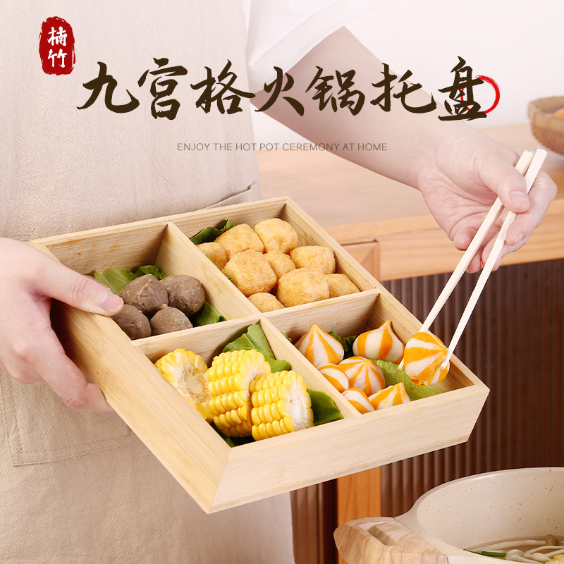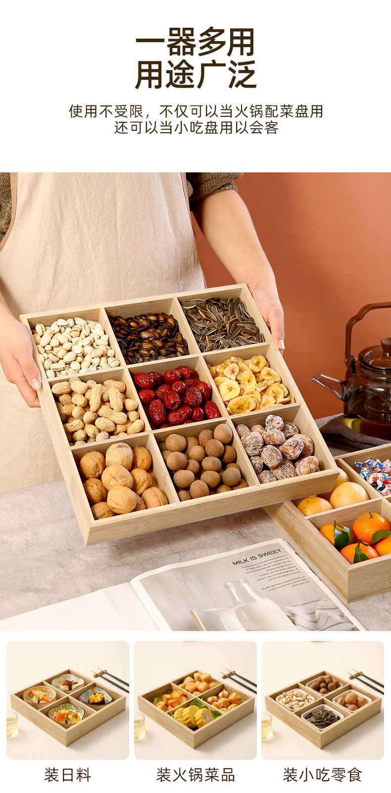 Jiugongge 대나무 및 나무 트레이 식기 뜨거운 냄비 격자 접시 과일 접시 상쾌한 드라이 스낵