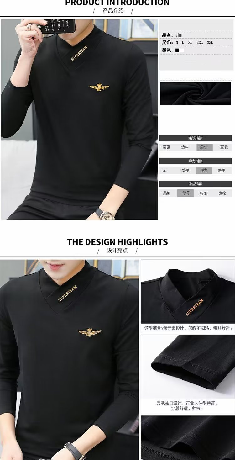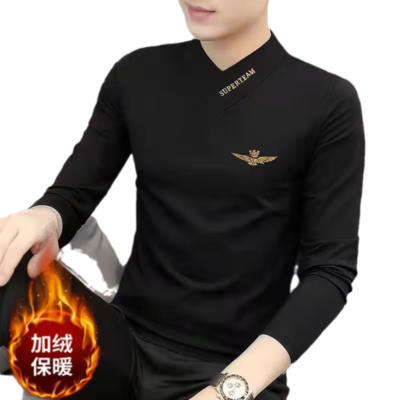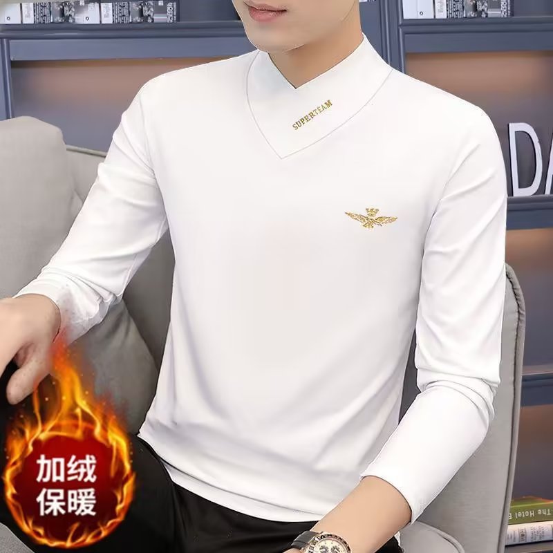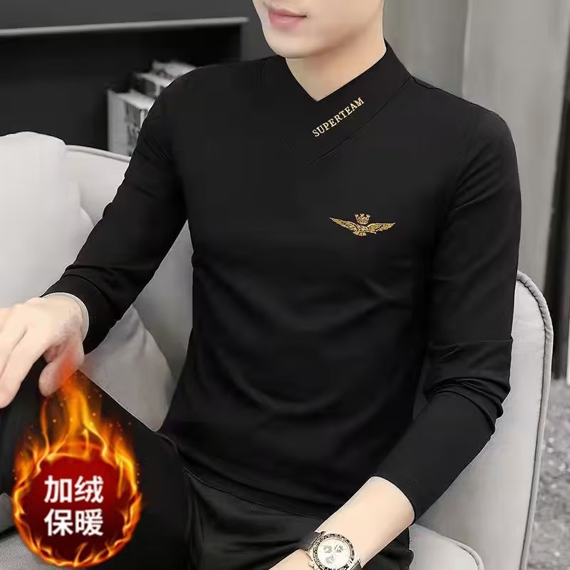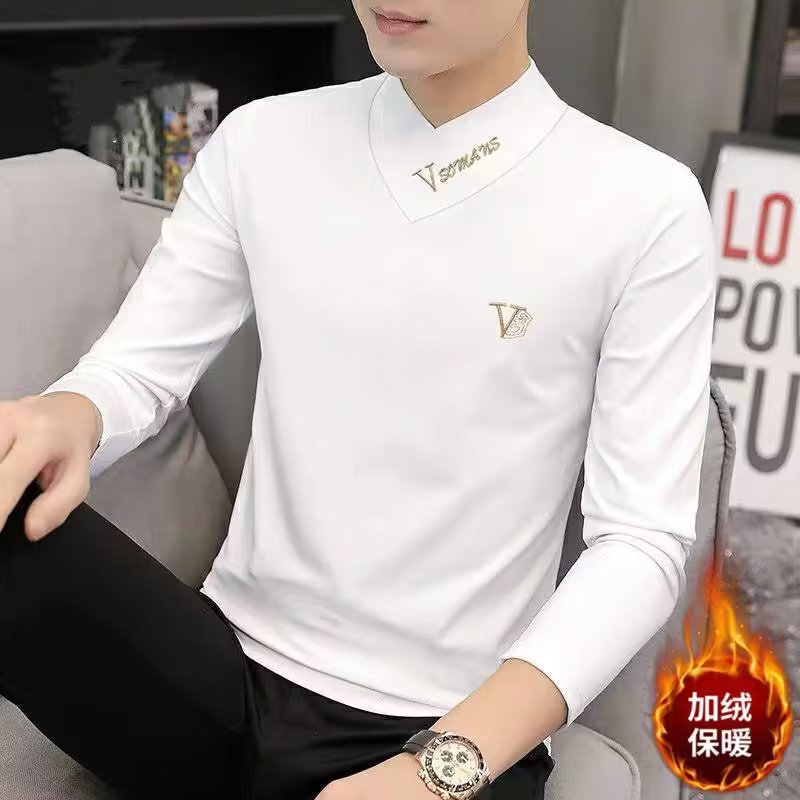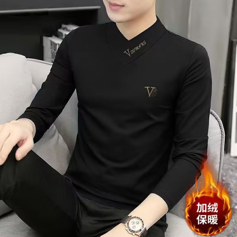 가을과 겨울 반 높이 칼라 모달 남자 긴팔 티셔츠 미드 칼라 기모 두꺼운 베이스 셔츠 V-넥 따뜻한 최고 트렌디