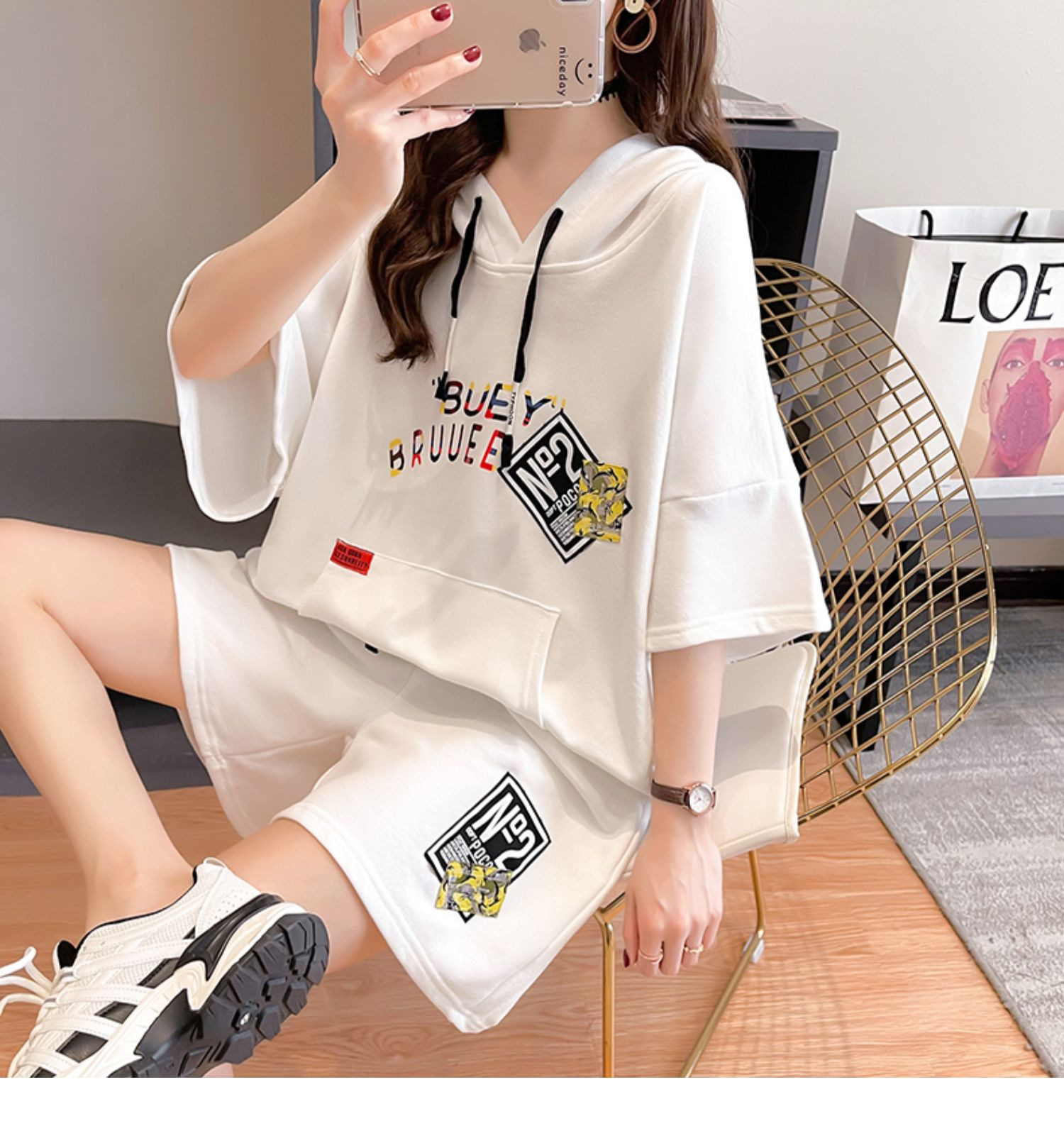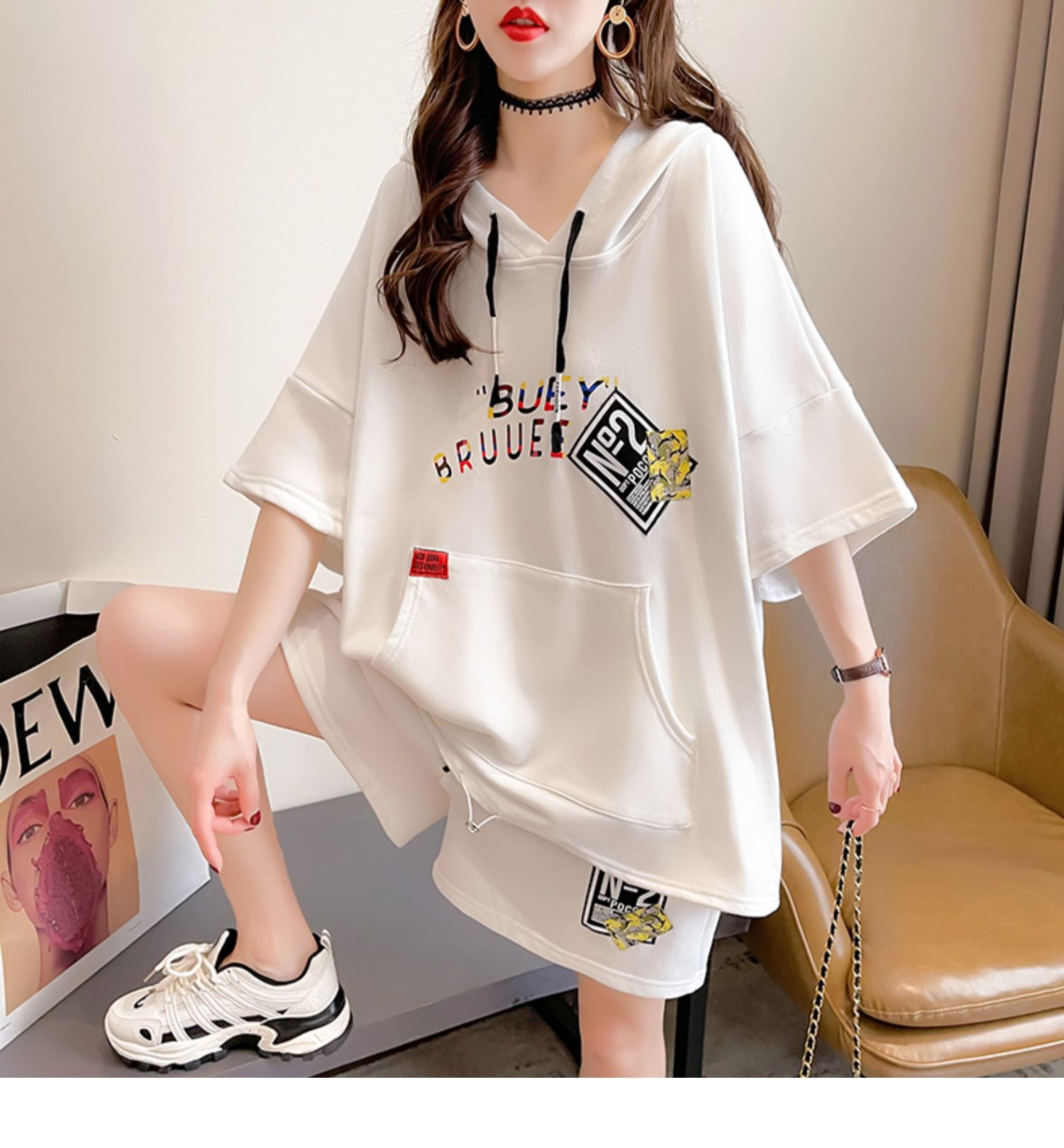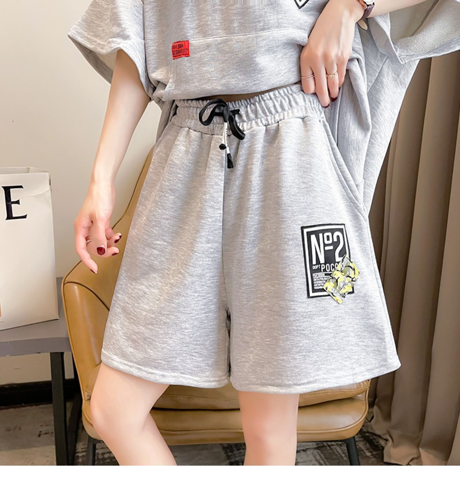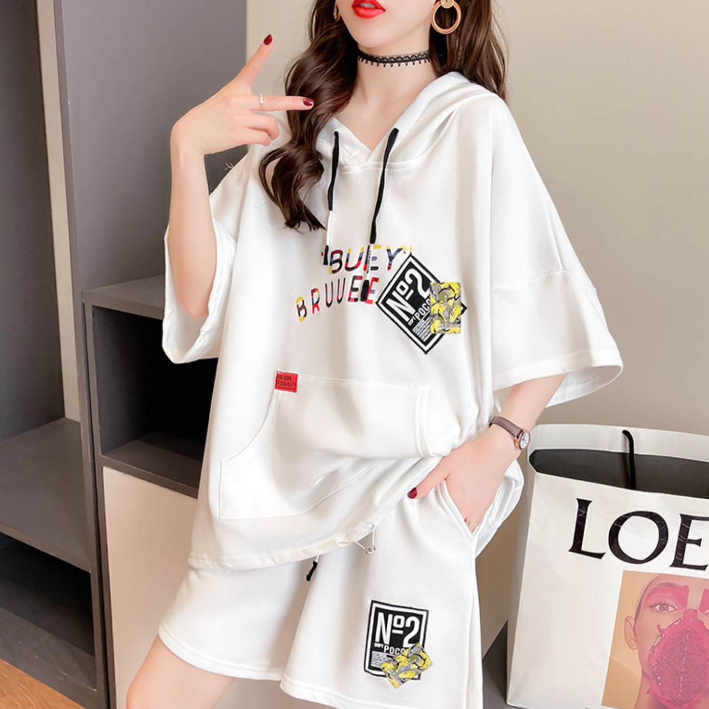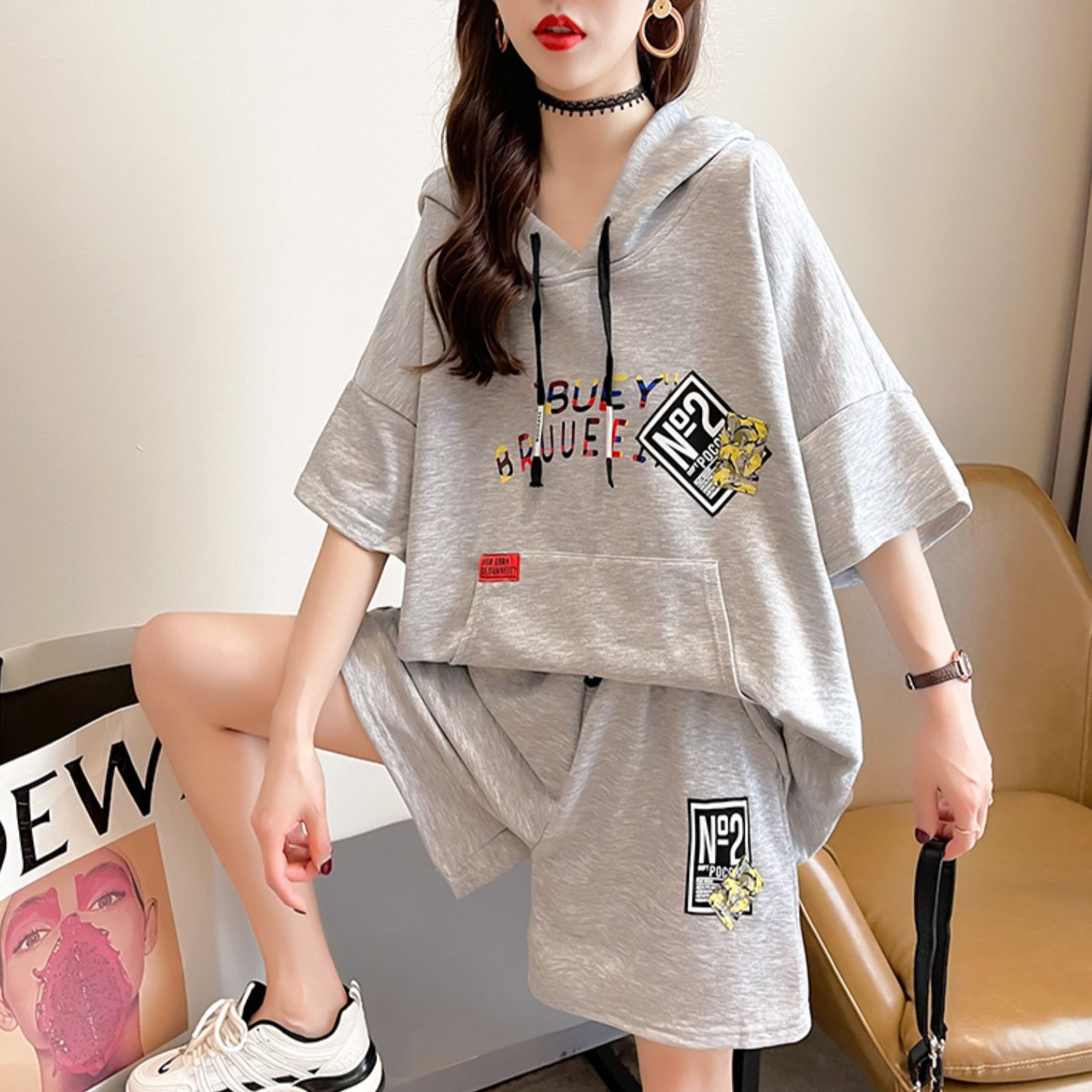 플러스 사이즈 여자 반팔 + 반바지 캐주얼 세트 여자 여름 새로운 스포츠 투피스 유행 세트